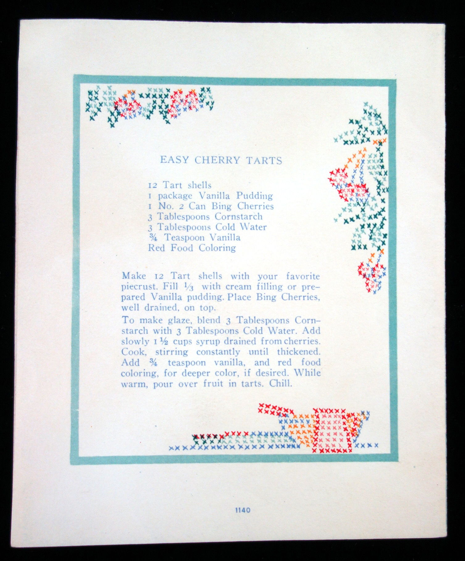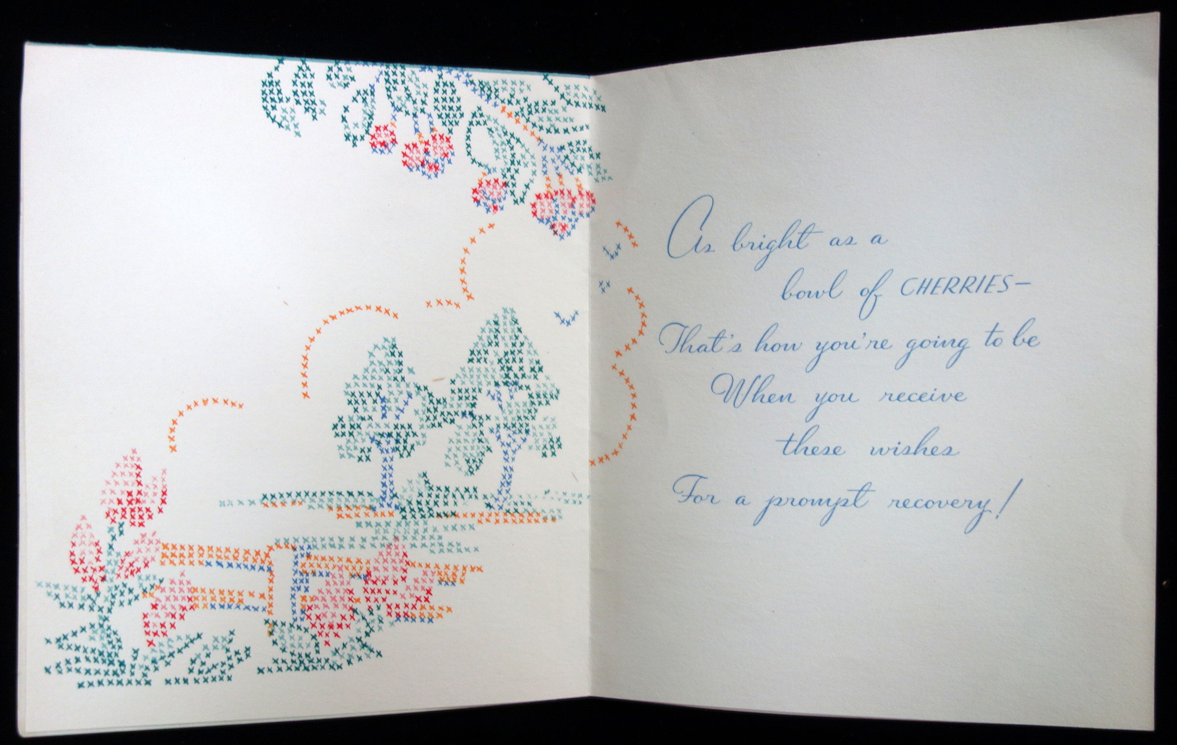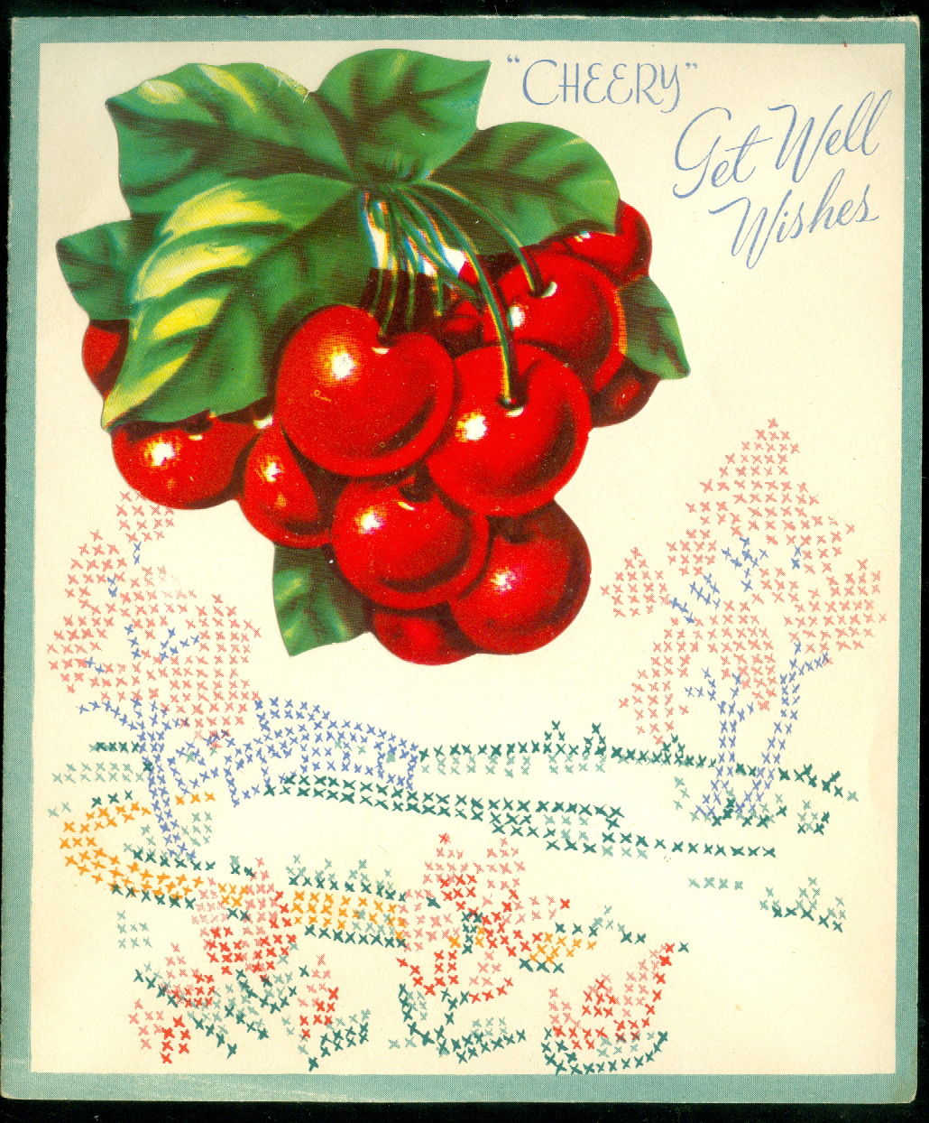 1940. A 6" x 5" french-fold greeting card with applied die-cut of cherries on the front cover. Captioned "Cheery" Get Well Wishes" with printed cross-stich cherry orchard. The inside depicts additional cherry trees and a wish As bright as a bowl of Cherries for a prompt recovery. The back page, somewhat surprisingly has a recipe for eAsy Cherry Tarts. Marked 1140. No publisher. Unused.