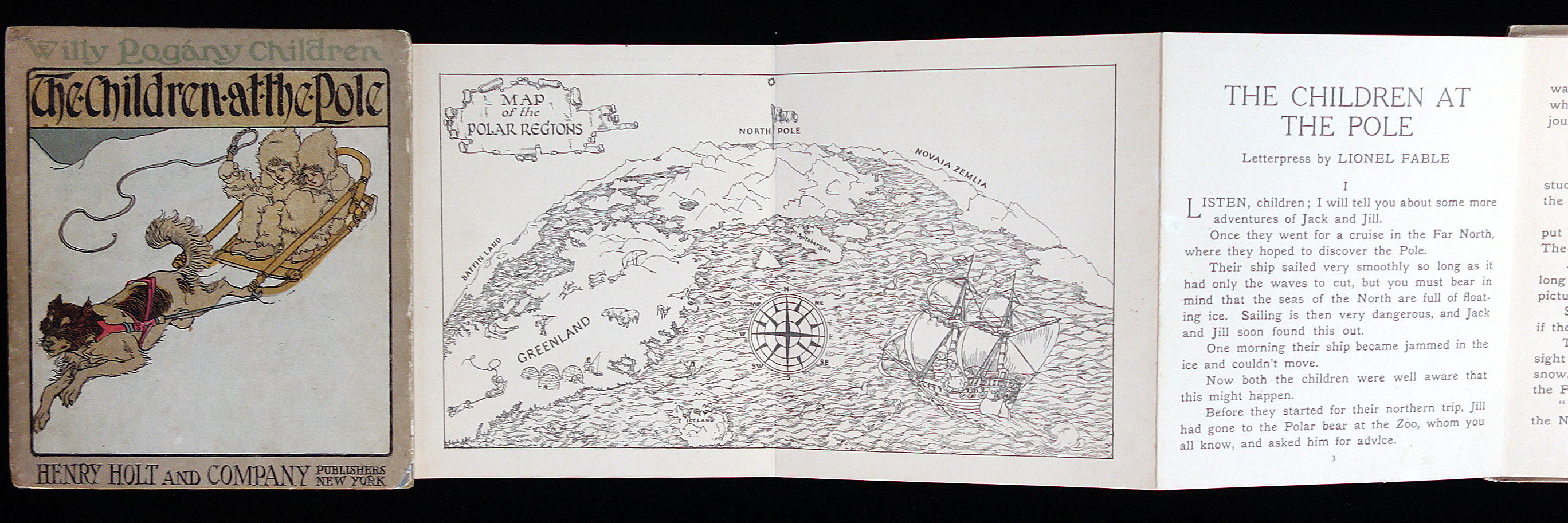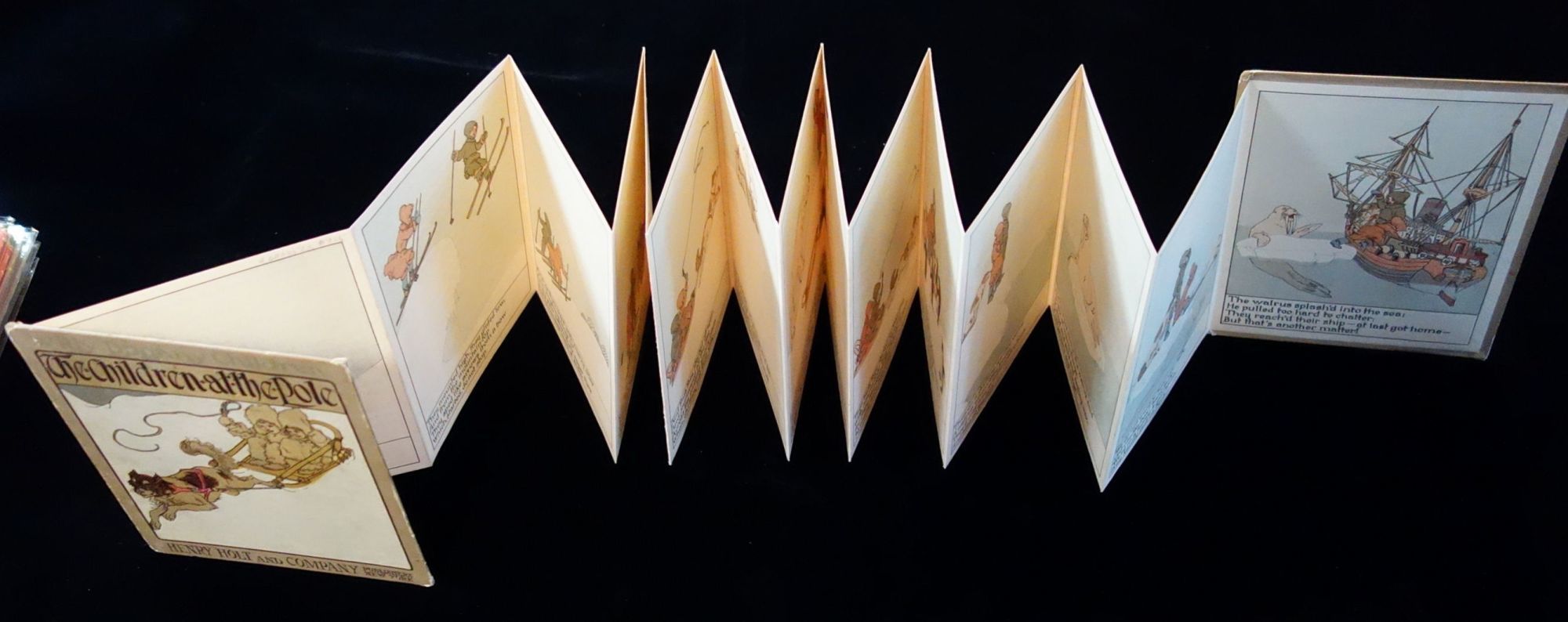 New York: Henry Holt & Co, 1914. Litho on board concertina or accordion book. The front side has sixteen illustrations with a story caption at the base. The reverse includes a two page pictorial map of the Polar Region followed by 14 pp. of text. Letterpress by Lionel Fable. Measures 6" x 5 1/4". Cover wear.