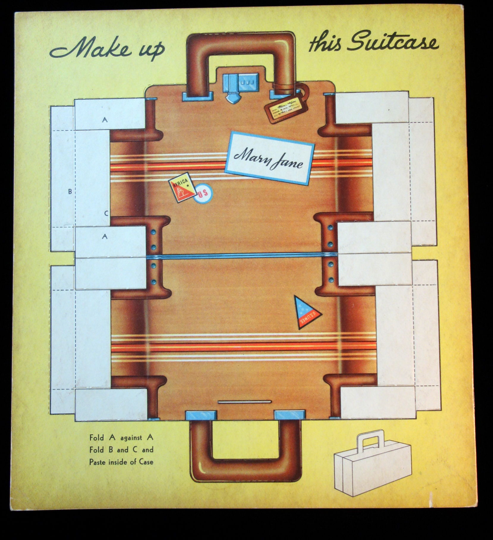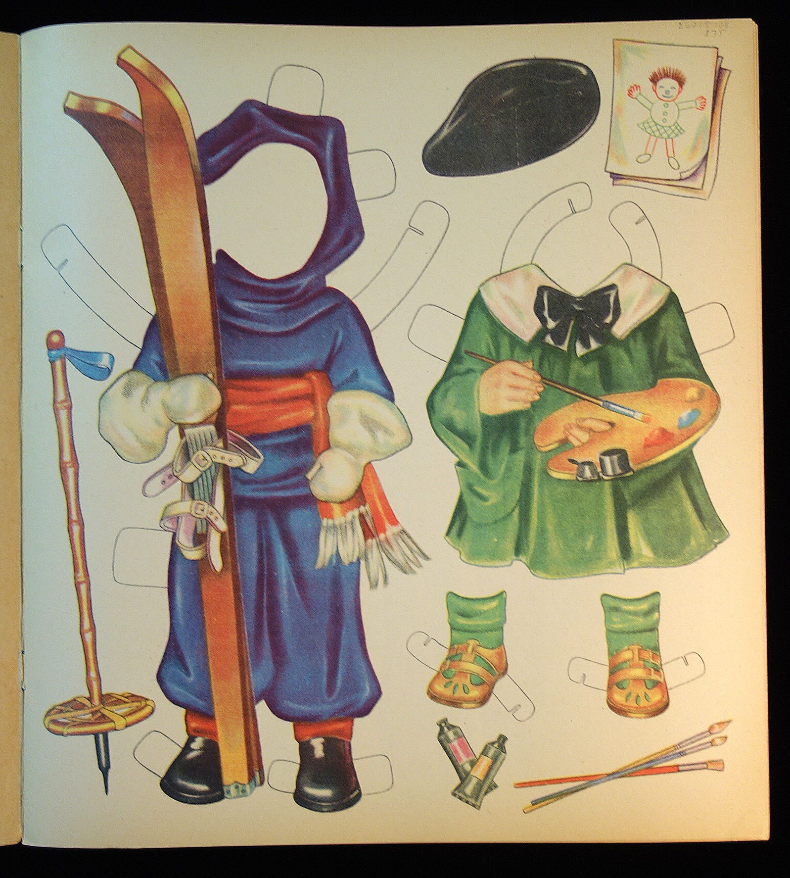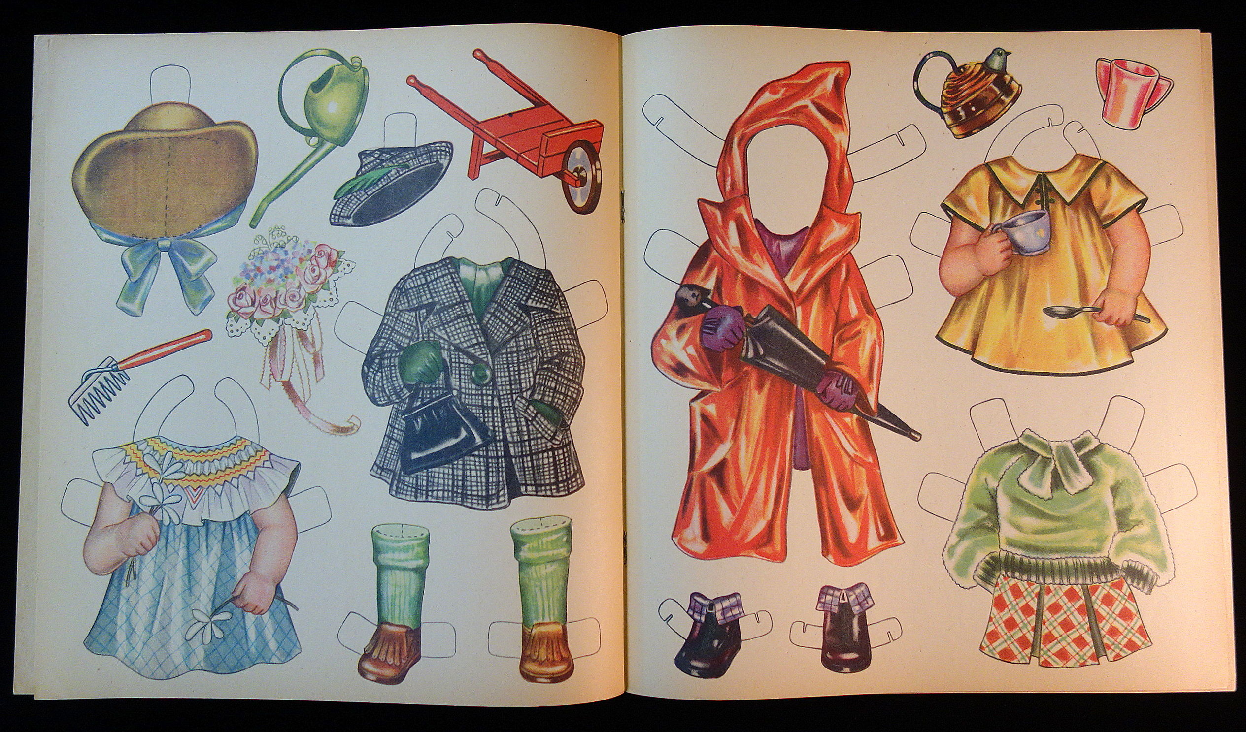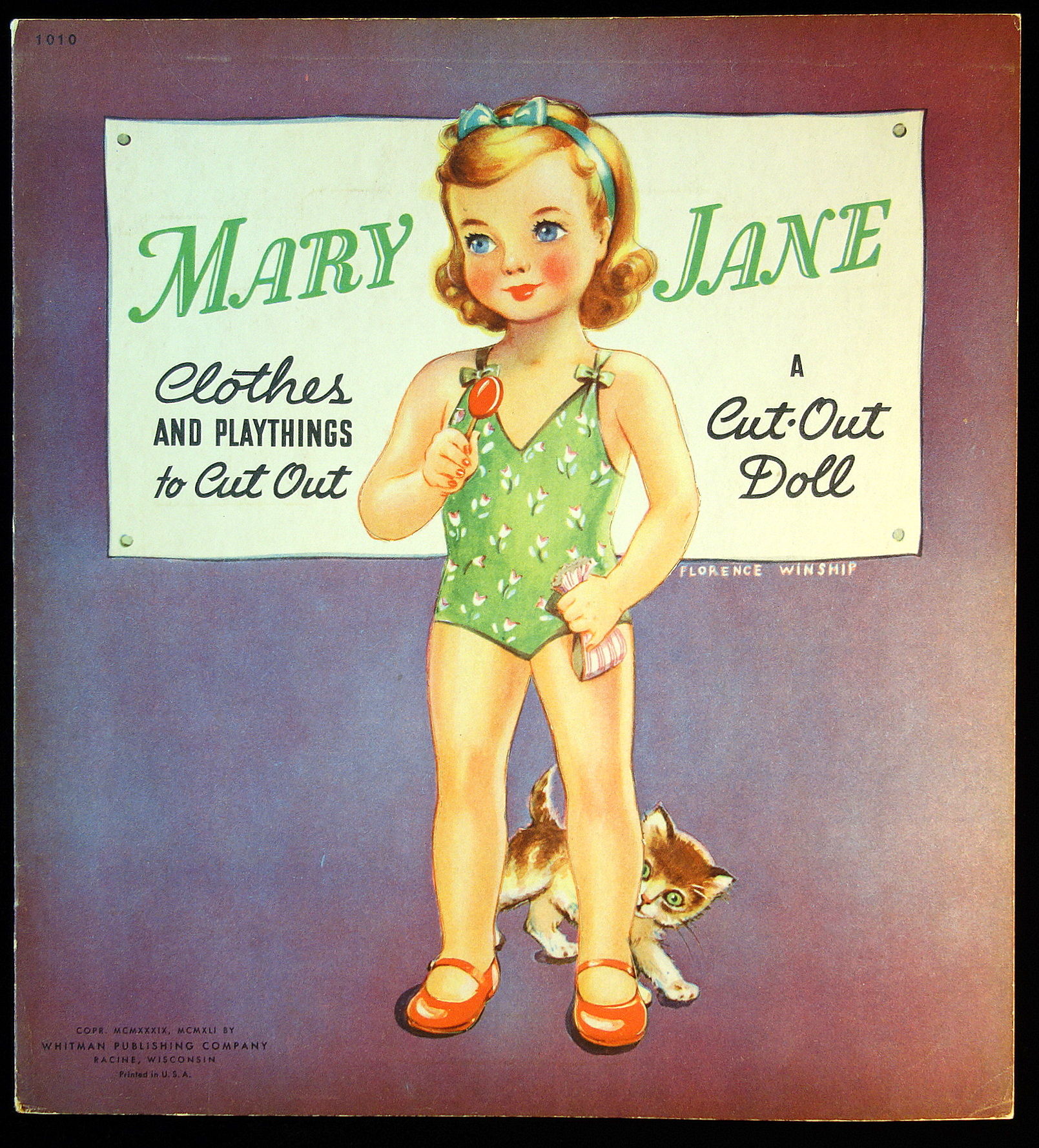 1940. Mary Jane is a blue eyed blonde that comes with clothing to go skiing, paint, have tea, and go out and about. There is a punch-out suitcase with her name attached.Measures 10 1/2" x 9 1/2": Whitman Publishing Co. Illustrated: Florence Winship1941. 1 Doll, 4 costume pages.