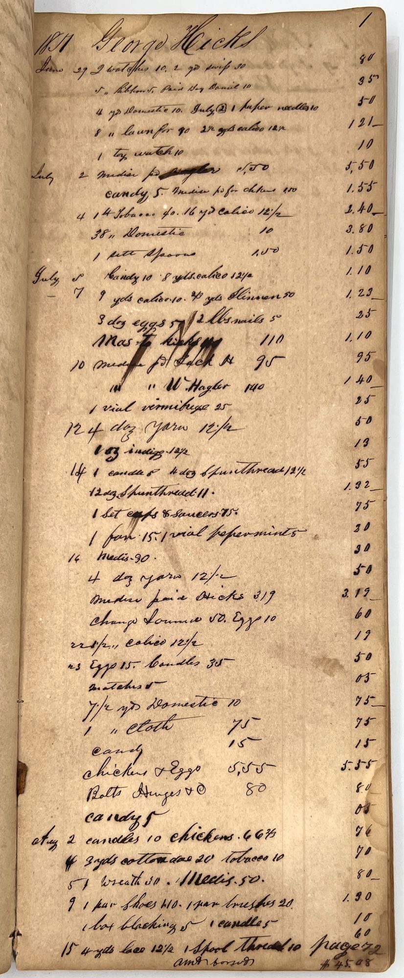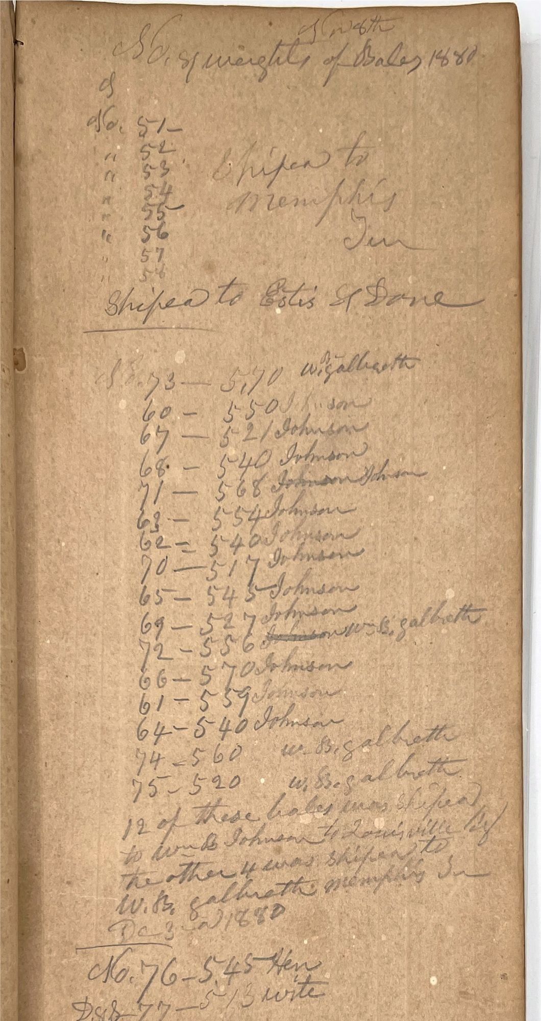 1851. The first 71 pages of this ledger are from a general store believed to be in Henry Country, TN for 1851. The same book was later used by another individual as a cotton book in 1880. The information in the "cotton book" section includes purchases from small growers and sales to larger companies Also included is a Memphis Cotton Exchange Daily Market Report, January 15th, 1881 with a cover from W. G. Galbreath & Co, Cotton Factors to Dillahunty & Son, Henry Station. . The last half of the book is blank. Measures 15 1/4" x 6 1/4