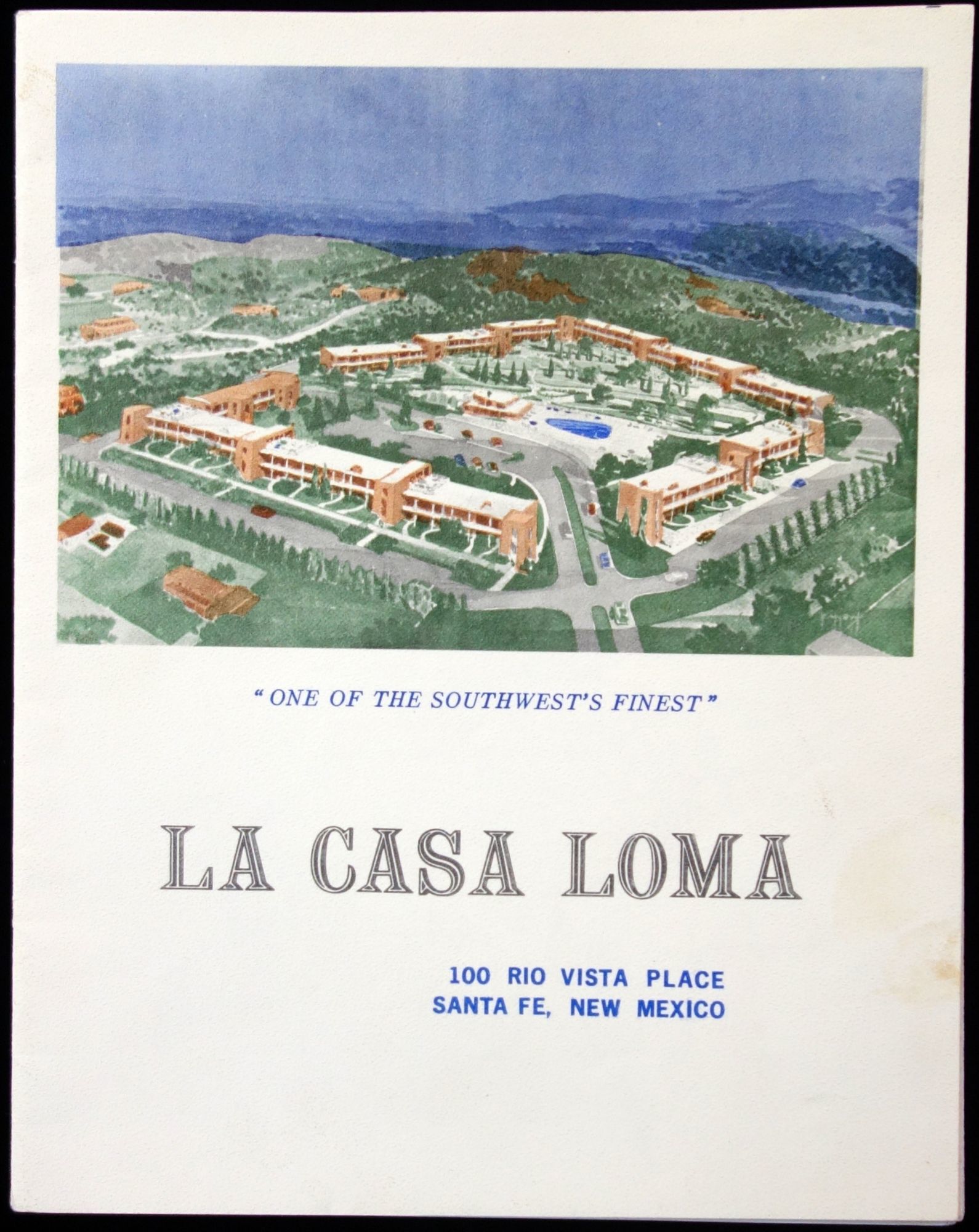 1960. An unnumbered 12 pp. (including covers )promotional brochure for La Casa Loma, 100 Rio Vista Place, Santa Fe, NM "One of the Southwest's Finest" . Birdseye view architectural rendering on front cover. Includes an area map locating the apartments, five different floor plans plus illustrations of interiors--sleek mid-century design and style. Additionally bulleted list of amenities and features. General Electric appliances promoted on back inside cover including electric range, dial defrost refrigerator and a stainless disposal. Measures 8 3/4" x 7". This community is still in existence.