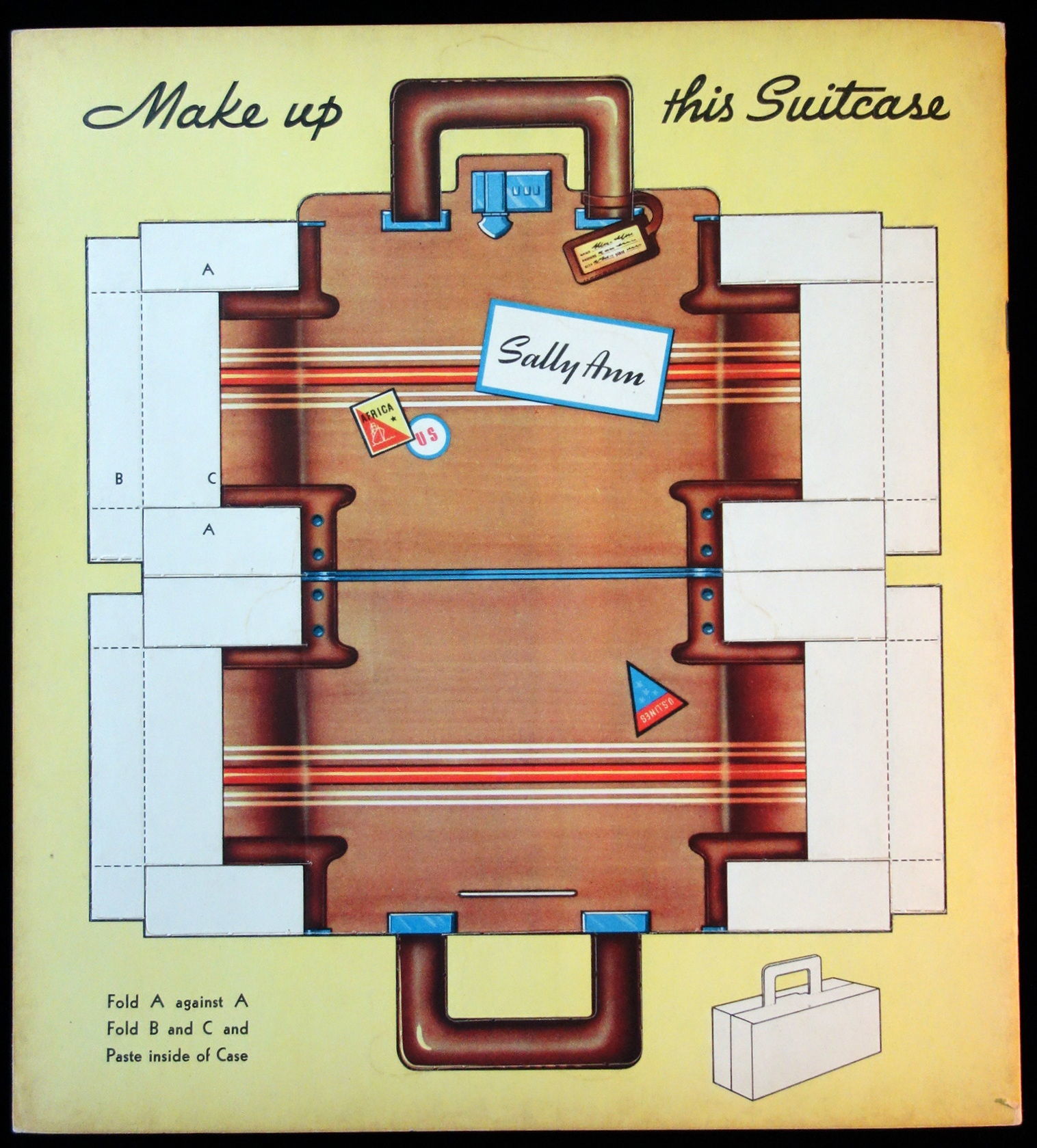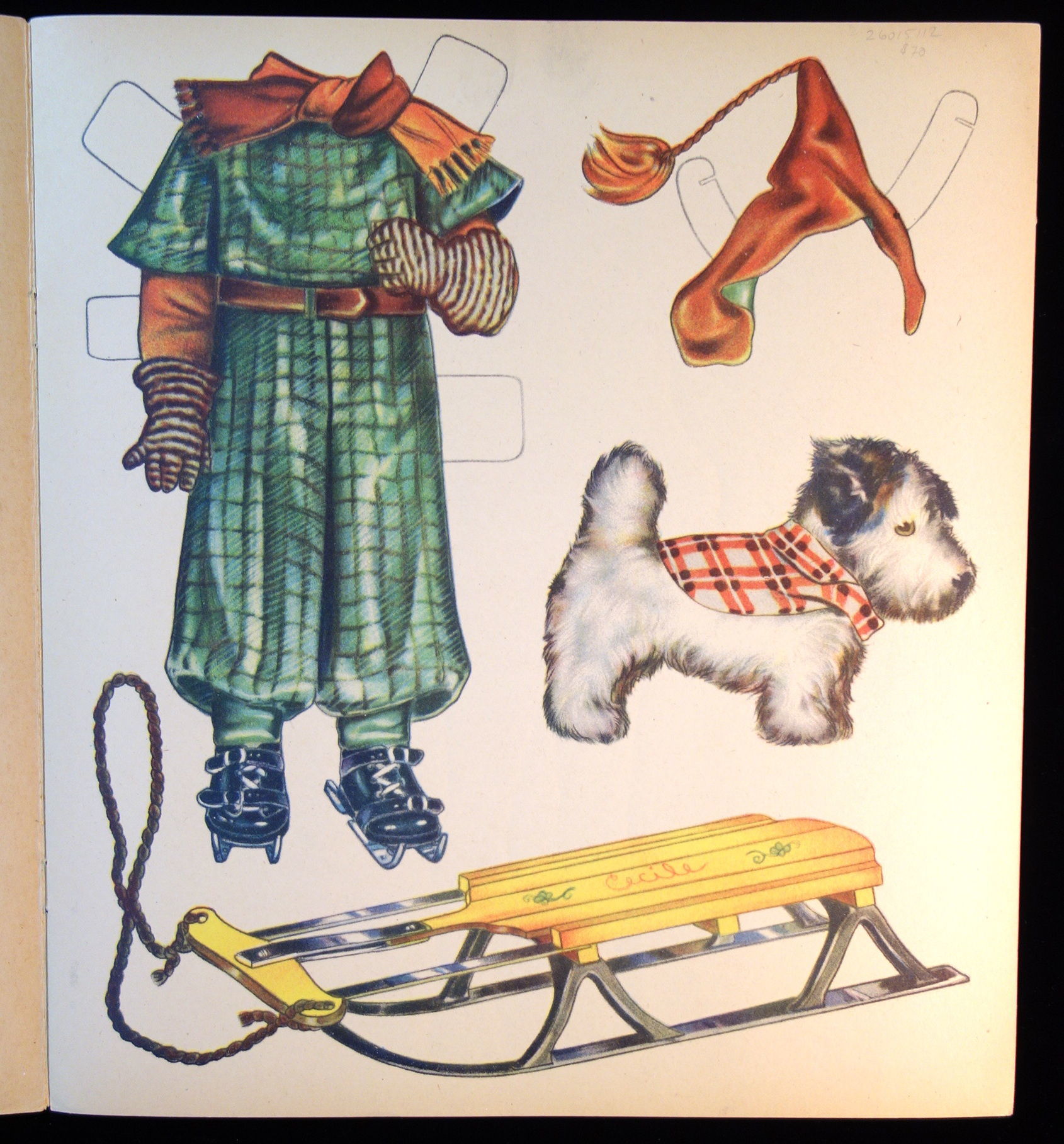 1940. Betty Sue, a curly blond with blue eyes, has outfits that include a skating outfit and sled, golfing equipment, and a school dress. There is a cut out suitcase with her name. Measures 10 1/2" x 9 1/2": Whitman Publishing Co. Illustrated: Florence Winship1941. 1 Doll, 4 costume pages. slight wear on cover.