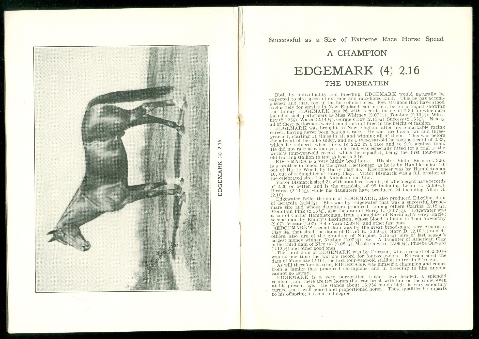 16 pp booklet promoting three stallions, each with an image from a photograph providing complete histories and lineage on each animal. Terms and past records conclude the presentation. Tip-in on inside front cover advises these stallions were nominated in the Horse World Stallion Representative Purse for guaranteed value of $7,500 etc. - The Horse World Co. Measures6 1/2" x 4 3/4". Light staple rust.
