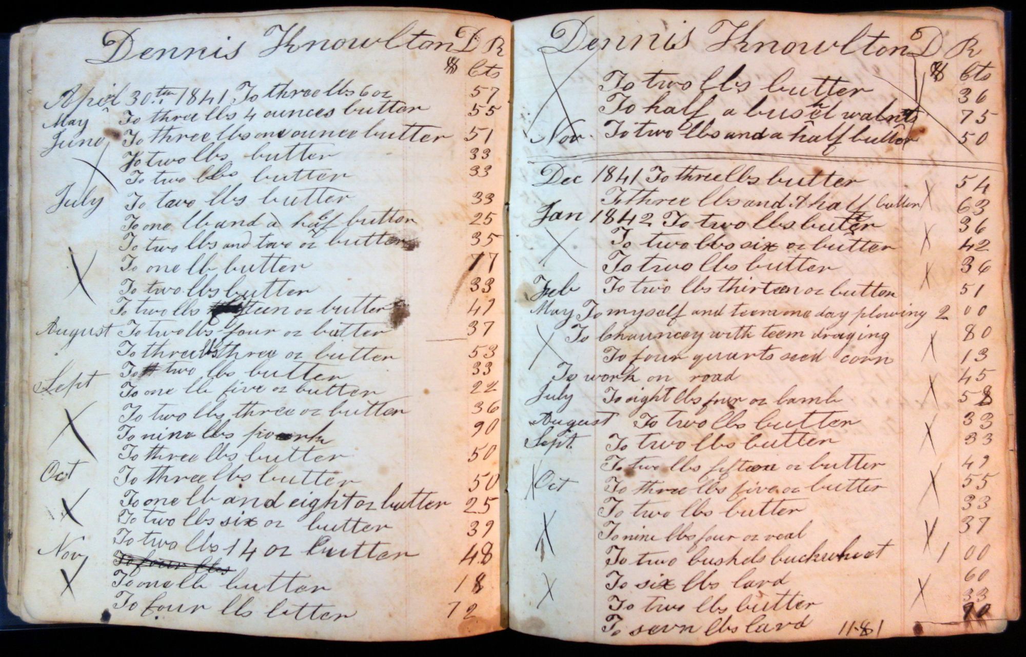 1834. Includes wages paid to others including tasks performed from 1834-1841 followed by a receivables ledger. Last entry death record of Chauncy, who died at age 60 (1853) , Anne who died at 91 years and Margaret who died at age 65. The Buell family of Ludlow was descended from William Buell (or Be well) of Chesterton, Huntingdonshire, England, who came to New England about 1630 and settled at Dorchester, Mass., but removed a few years later to indsor, Conn., where the family took a prominent part in the early history of the town.Chauncey Buell,' the first of the Ludlow Buells, was born March 1, 1793, at Somers, Conn., coming to Ludlow about 1820, where he died Sept. 12, 1853; married April 24, 1821, at Longmeadow, Anne Lathrop, born Dec. 24, 1794, at East Wiindsor, Conn., died Feb. 17, 1886.