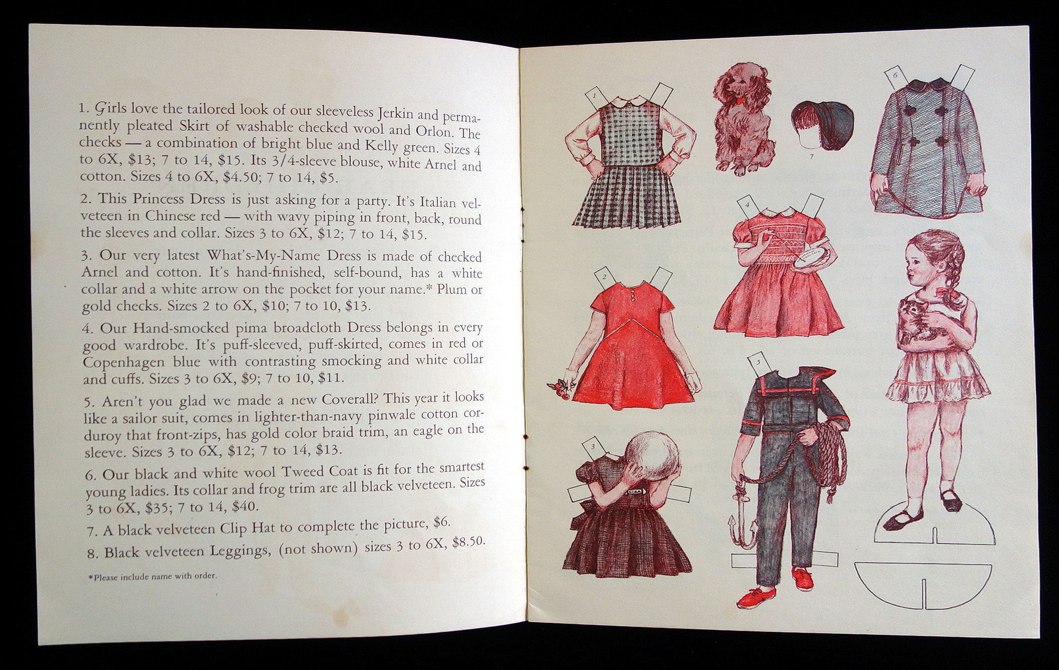 New York: Henry Bendel, 1962. 12 pp. Paper wraps. Images of paper dolls on the cover. Includes three (3) paper dolls and four (4) pages of outfits. The reverse of the page provides a narrative description, sizing information and pricing for each of the paper doll costumes. The introductory note asks the children not to cut out the dolls until mother has ordered the desired outfits. Additionally with an order from the book a little Bendel gift scissors is given to the child... Measures 9" x 7". Light staple rust.