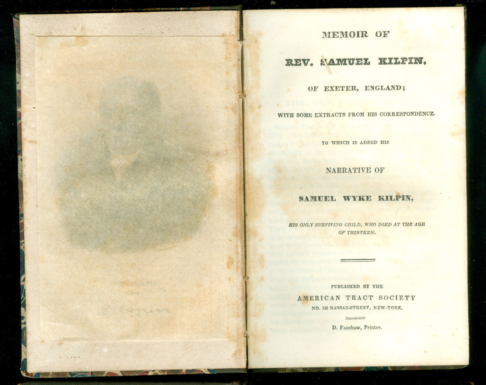 New York: American Tract Society. 156 pp, marbled cover, frontispiece of Kilpin, first 139 pages are Kilpin's memoirs, end chapter is "Some Particulars of Samuel Wyke Kilpin".
