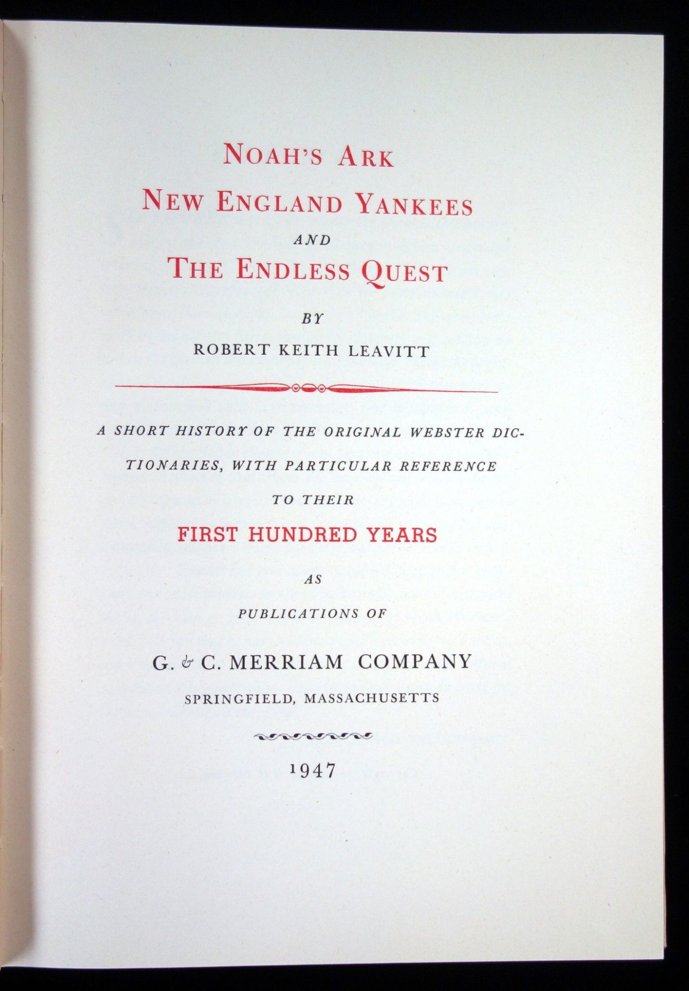 Noah's Ark New England Yankees and The Endless Quest. Robert Keith Leavitt G. & C. Merriam Springfield, MA