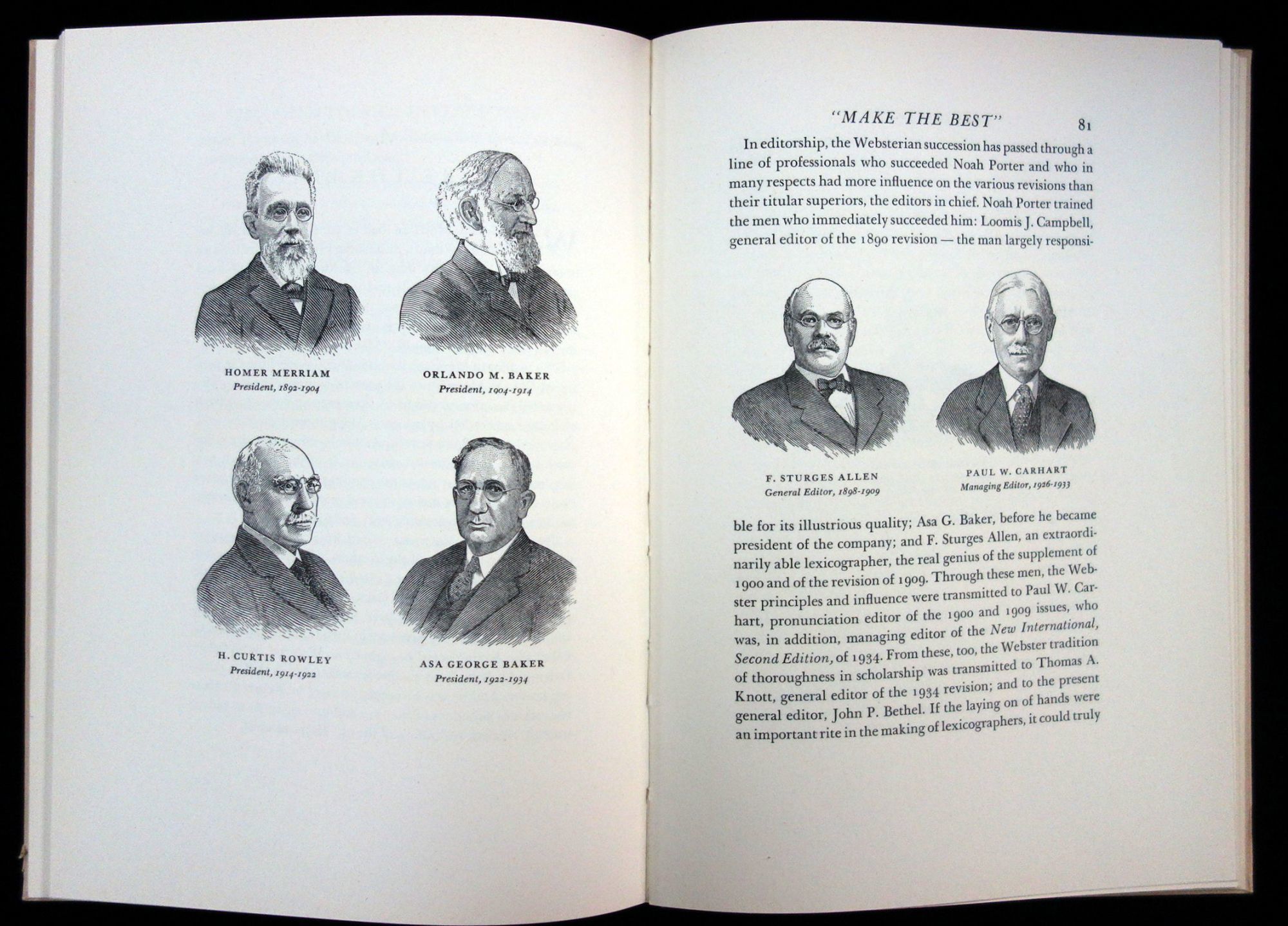 Springfield, MA: G. & C. Merriam, 1947. 106 pp. Subtitle: A Short History of the Original Webster Dictionaries Particular Reference to their First Hundred Years as Publications of G.&C. Merriam Company Springfield, Massachusetts. Gray paper hard cover, black and white illustrations, photographs, portraits, and copied images, title page is two tone.