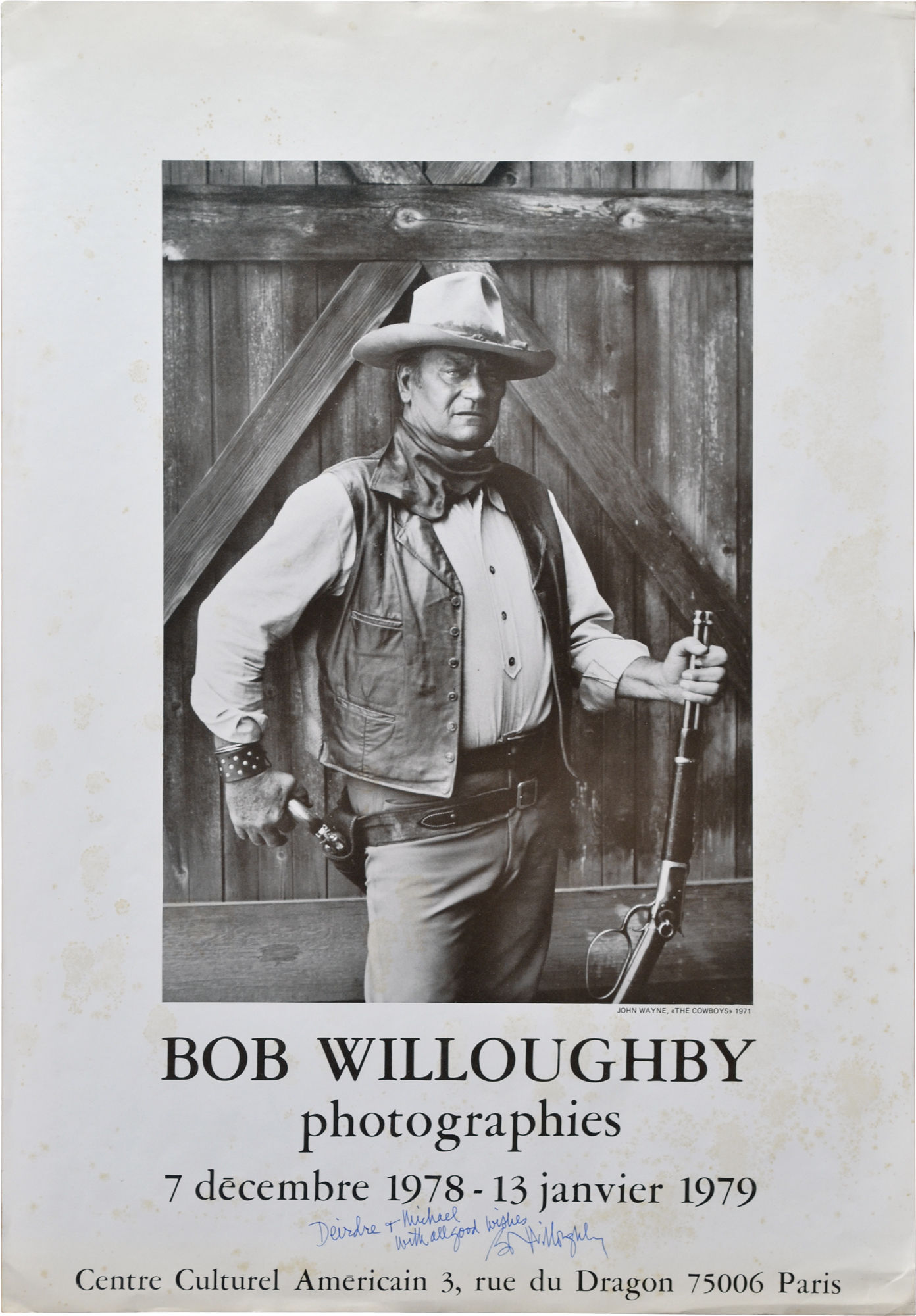 Paris: Centre Cultural Americain, 1978. Original two sided poster for an exhibition held at the Centre Cultural Americain in Paris from December 7, 1978 through January 13, 1979 by noted film still photographer Bob Willoughby. INSCRIBED by him on the front to his neighbors: "Deirdre [and] Michael / with all good wishes / Bob Willoughby." Full provenance available.