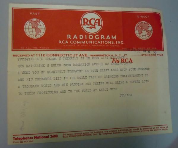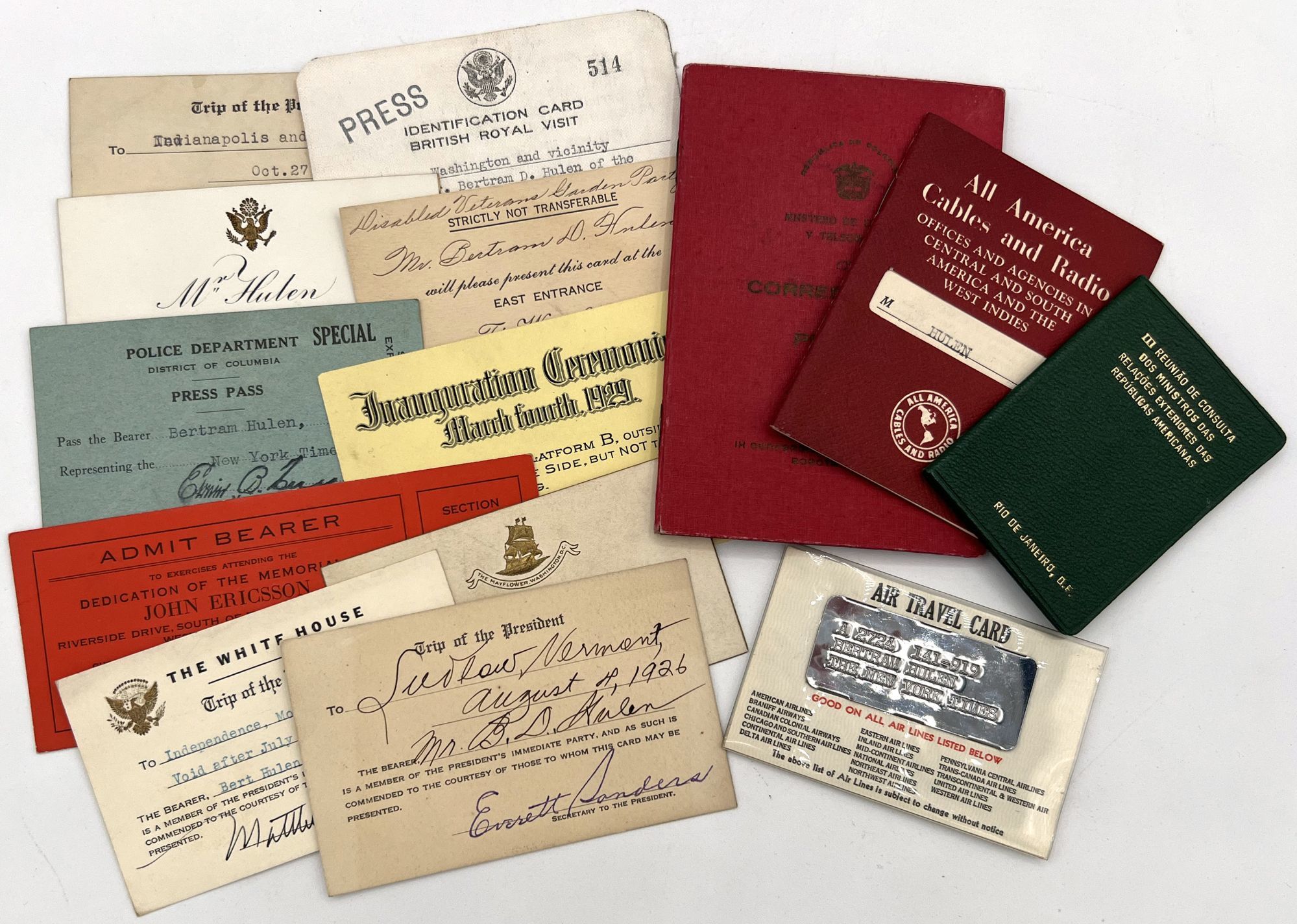 This archive consists of letters and mementos dating from the 1920s up to the immediate aftermath of his death. Highlights include: a telegram of condolence, to Mrs. Hulen, from Queen Juliana of the Netherlands; an invitation to a meeting of “The Hitler Gang”; various press identification cards and event invitations; a story by Katherine Merriam Hulen about the annual Easter Egg Roll at the White House; and a cocktail recipe sent to Hulen from the USSR Embassy in the aftermath of a reception there. There are telegrams of shock in the days immediately following Hulen’s death, many from noted New York Times reporters of the day, and dozens of letters from politicians, diplomats, journalists. Also included is a file of correspondence and records related to Hulen’s family genealogy, and photos related to his professional activities.