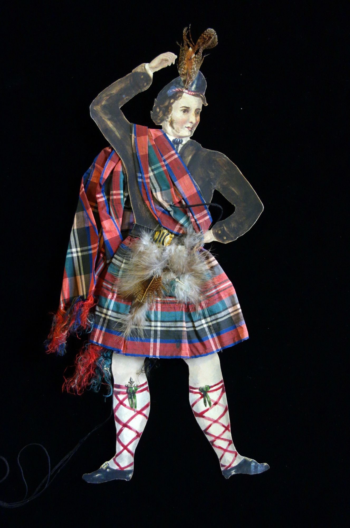 1890. A 12" Scotsman dressed in a traditional kilt with with shoulder sash and belt. Embellished with feathers on his hat and belt. Finely detailed facial and hand features. Not the detail on his stockings. A simple string mechanism allows him to dance.