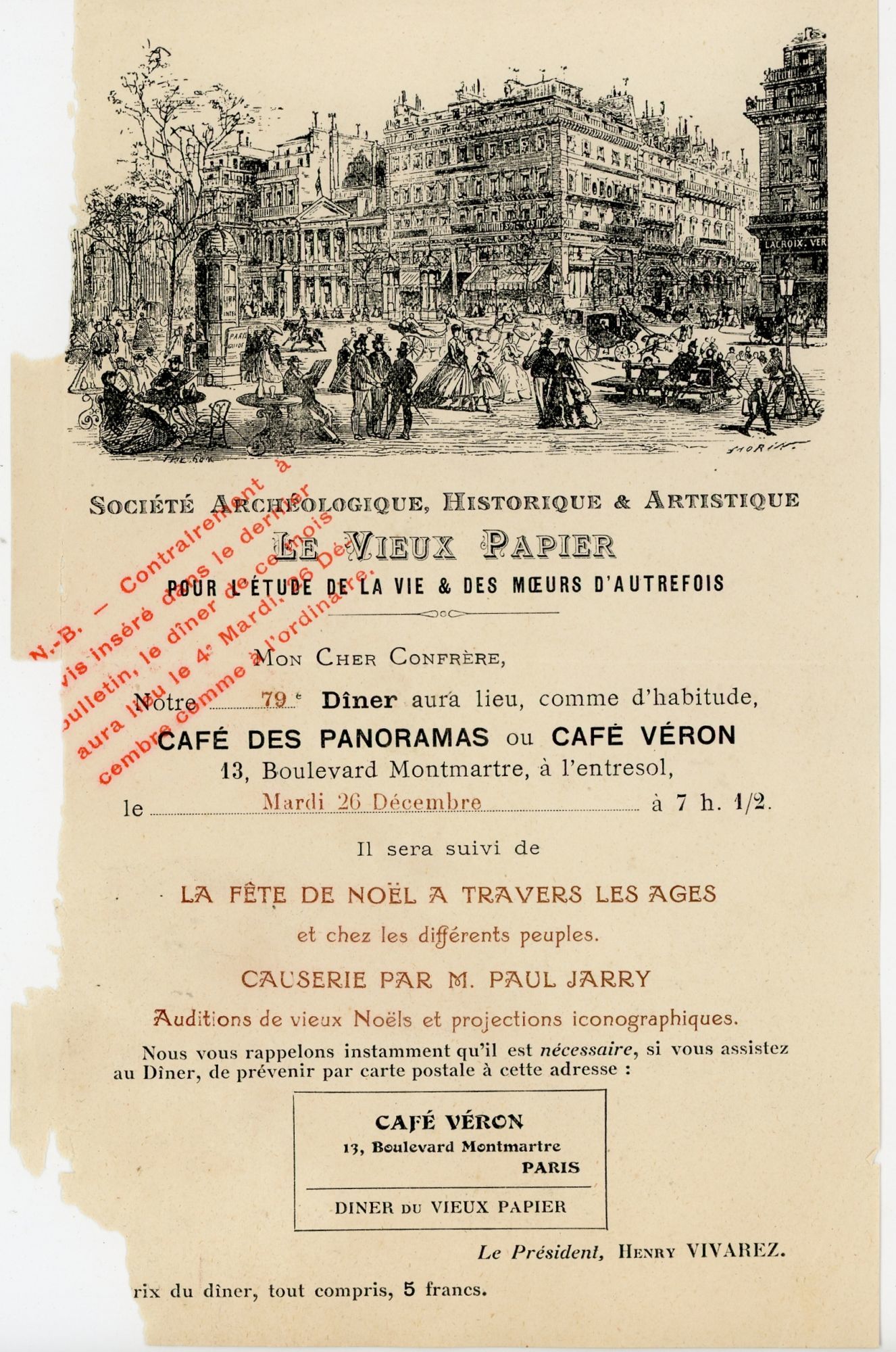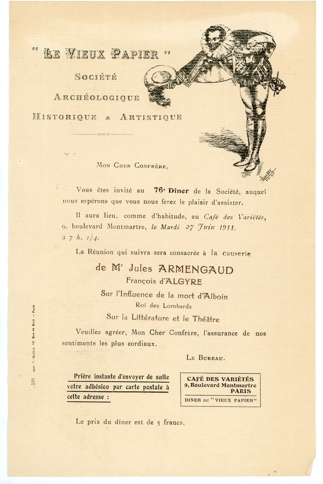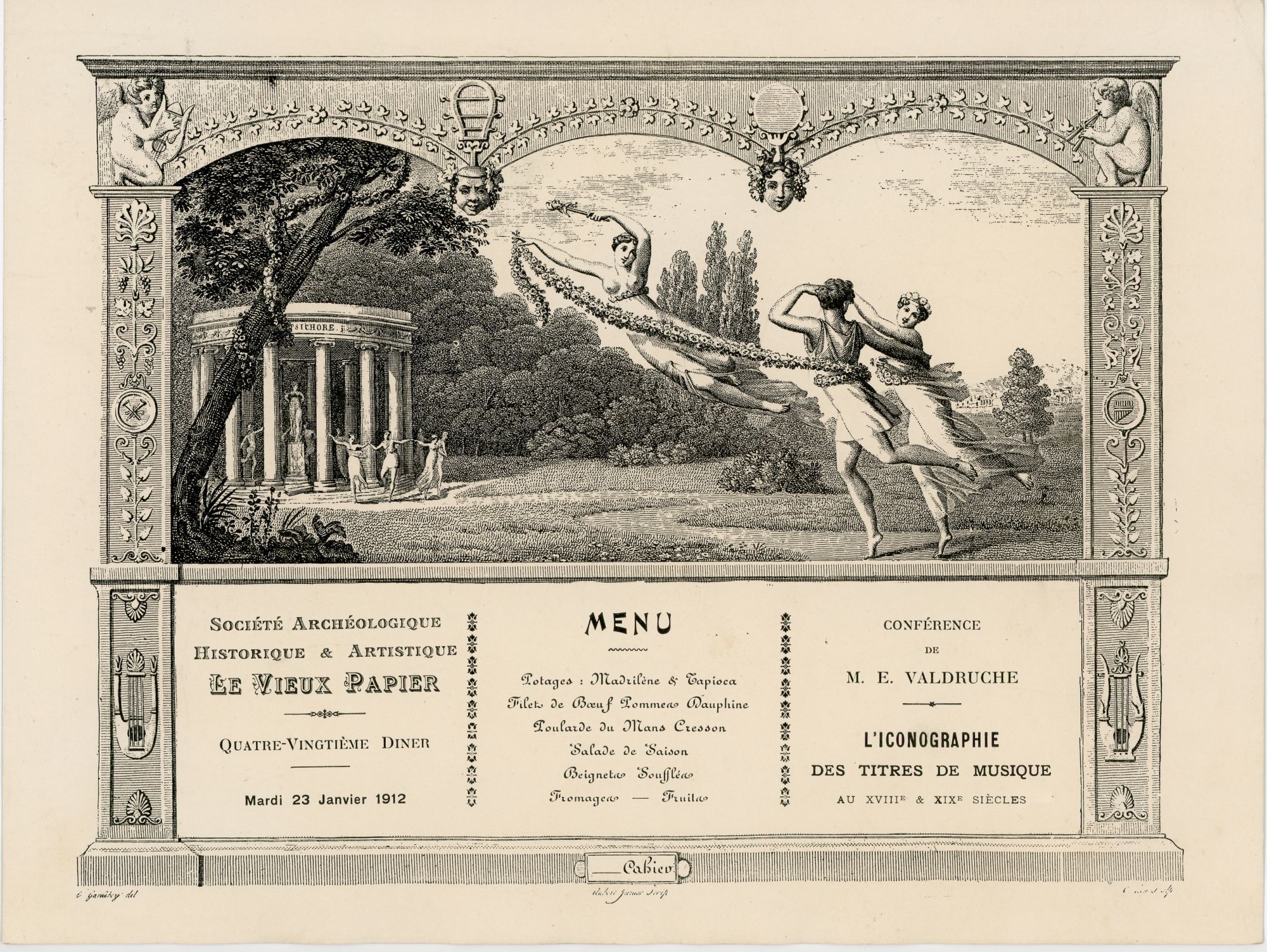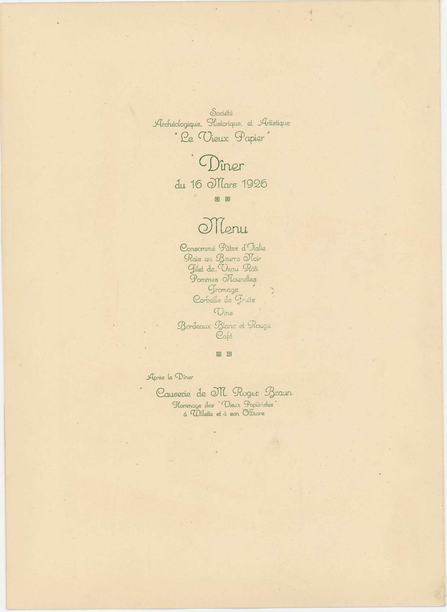 Menus and Invitations for the Societe Archeologique, Historique & Artistique le Vieux Papier our l'etude de la vie & Des Moeurs d'autrefois (Archaeological Society, Historical and Artistic Old Paper for the Study of Life & Habits) 1910-