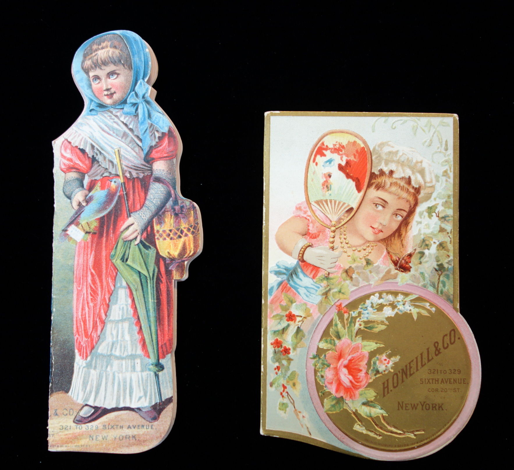 New York: E. Wells Sachett & Ranson, c1880s. A pair of souvenir catalogues especially designed to illustrate some of their numerous styles of trimmed and untrimmed bonnets and hats. The first is an 8 1/2" x 3" die-cut book in the shape of child with an illustration of a girl on the front cover and a boy on the back. The cover is lightly embossed Fall and Winter. The department store also features a full line of clothing accessories and household products not included in this catalog. Each page has an illustration of an individual wearing a trimmed hat and a second unadorned hat. Each with a model number. c1880s. Printed by E. Wells Sachett & Ranson, NY.The second is 7 1/8" x 4 1/2" with a die-cut circle at base with embossed images of different little girls on the front and back covers. This catalog is in the same format but limited to hats for adult women. The center pages list the various departments and includes such things as imported costumes, dolmans, wraps &c. Printed by Sackett, Wilhelms Betzig, NY.