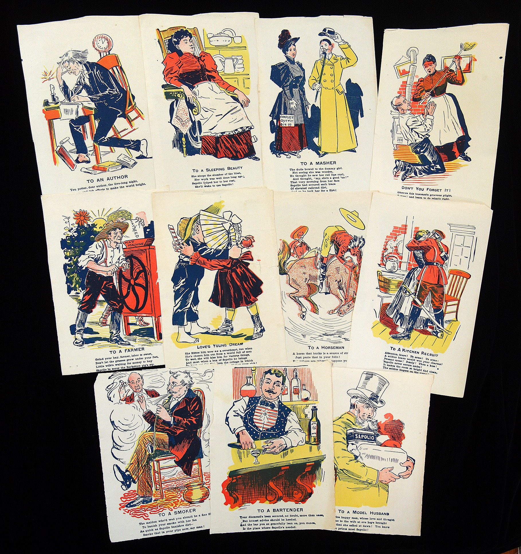 Eleven (11) different approximately 9" x 6" vinegar valentines printed in three colors. Each is demeaning someone and suggesting they use Sapolio soap for one reason or another. Captions include To A Kitchen Recruit, Love's Young Dream, To a Horseman, To a Farmer, Don't You Forget It!, To a Bartender, To a Masher, To a Model Husband, To an Author, To a Smoker and finally To a Sleeping Beauty. Reverse is blank. Scarce items.
