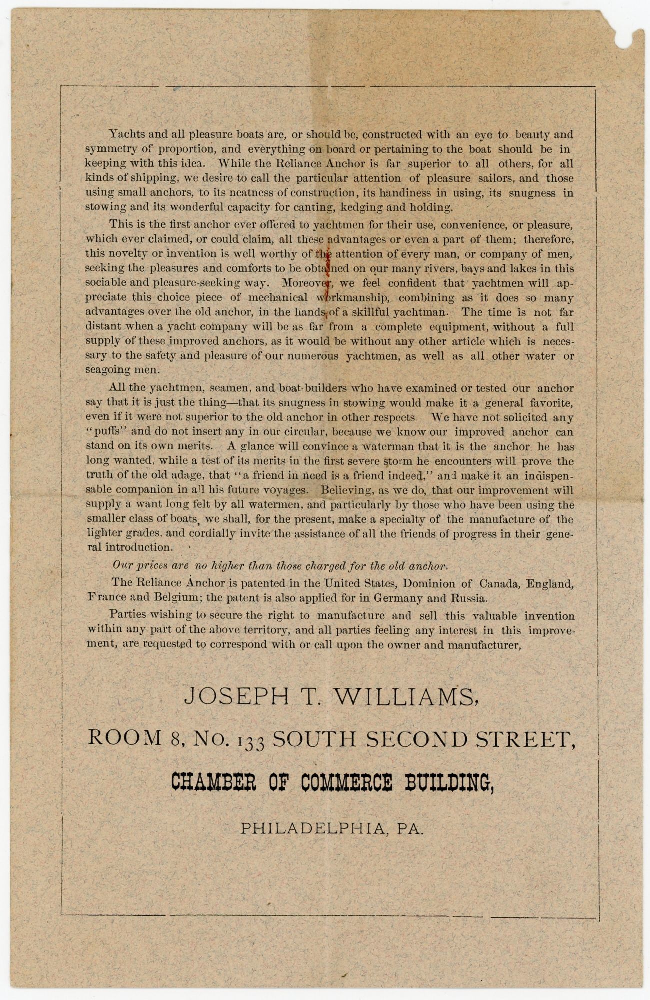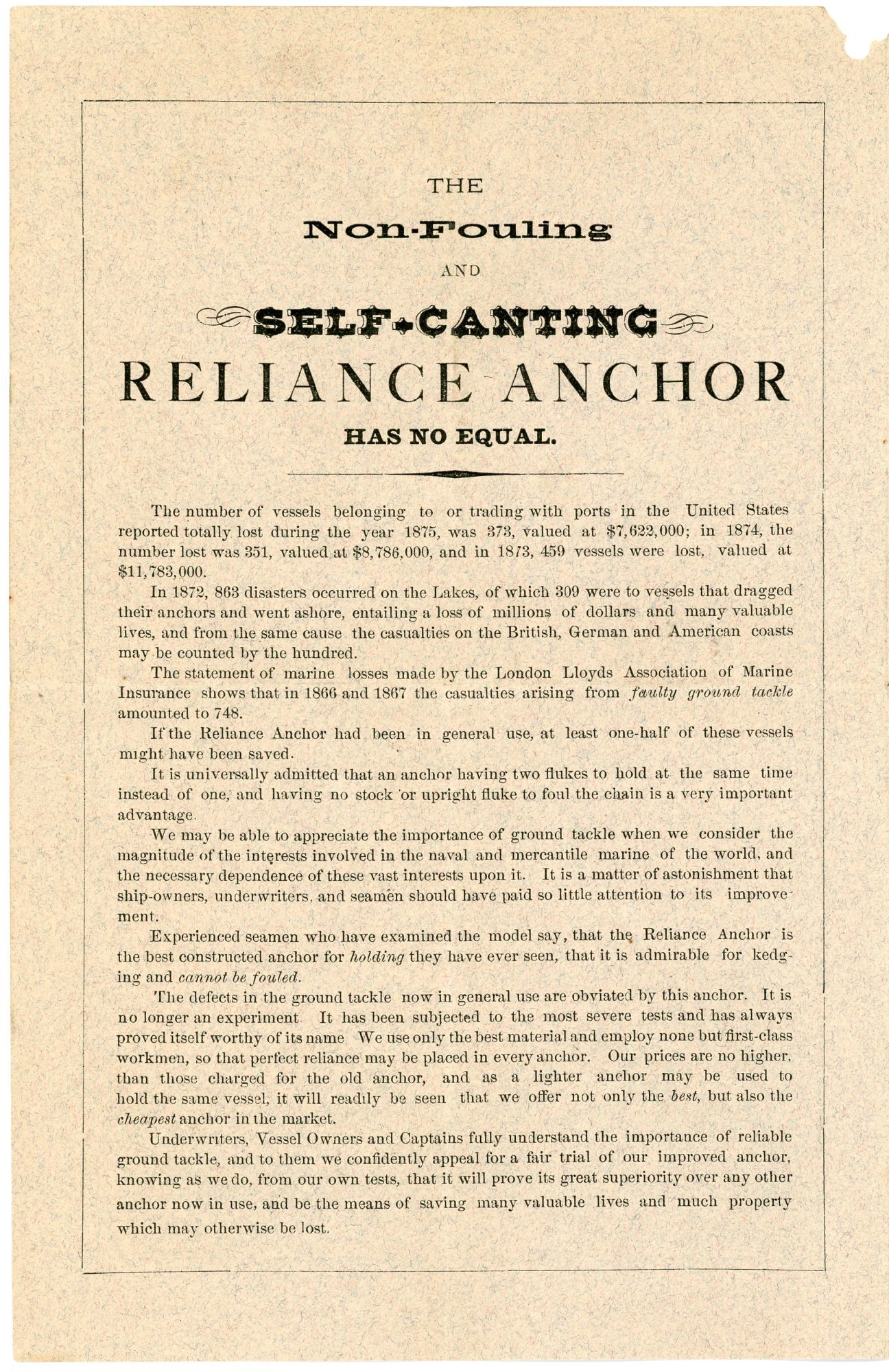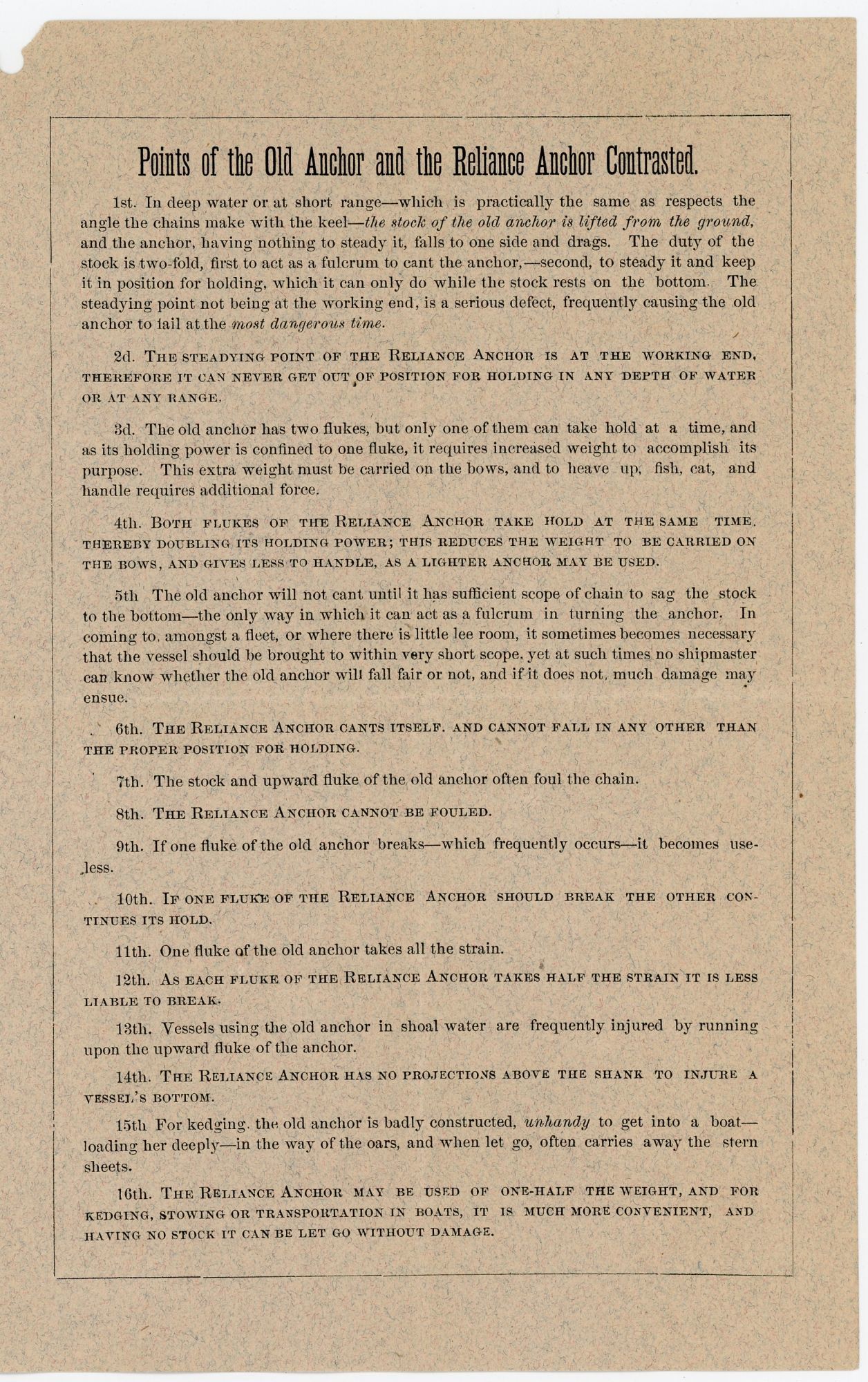 A single-fold illustrated circular containing a narrative describing the product and the (16) Points of the Old Anchor and the Reliance Anchor Contrasted. The back page is directed at the yacht owner now having access to the best anchor. Letter folds.