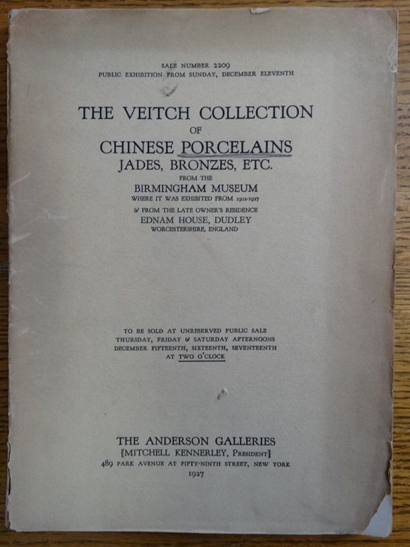 New York: Anderson Galleries, 1927. VG-, small tear along lower spine, tiny portion of cover corner missing, other minor age indications. Yellowed paper printed wraps. 136 pp. 128 bw plates illustrating 127 lots. Cover title is "Sale Number 2209...The Veitch Collection of Chinese Porcelains, Jades, Bronzes, Etc. from the Birmingham Museum..."Lists 441 works which were formerly on display at this British Museum from 1902-1927. Many of the prize objects in this collection were acquired by Veitch from the renowned Chinese collector Hu-sin-yang. An exceedingly rare catalogue.