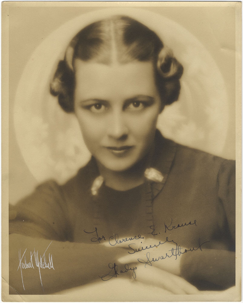 Slightly worn and soiled. American contralto Gladys Swarthout "studied singing in Chicago, making her operatic début there in 1924 as the Shepherd-boy in Tosca; the following year she sang Carmen at Ravinia. Her début role at the Metropolitan was La Cieca (La Gioconda, 1929); she performed there regularly until 1945, as Siébel, Preziosilla, Adalgisa and – her most famous roles – Mignon and Carmen. She also sang in the première of Hanson’s Merry Mount (1934). After 1954 she retired to Florence." Swarthout had a "fine, well-placed voice" and a beautiful, but placid stage presence. She starred in five films for Paramount Pictures. Max de Schauensee in Grove Music Online.