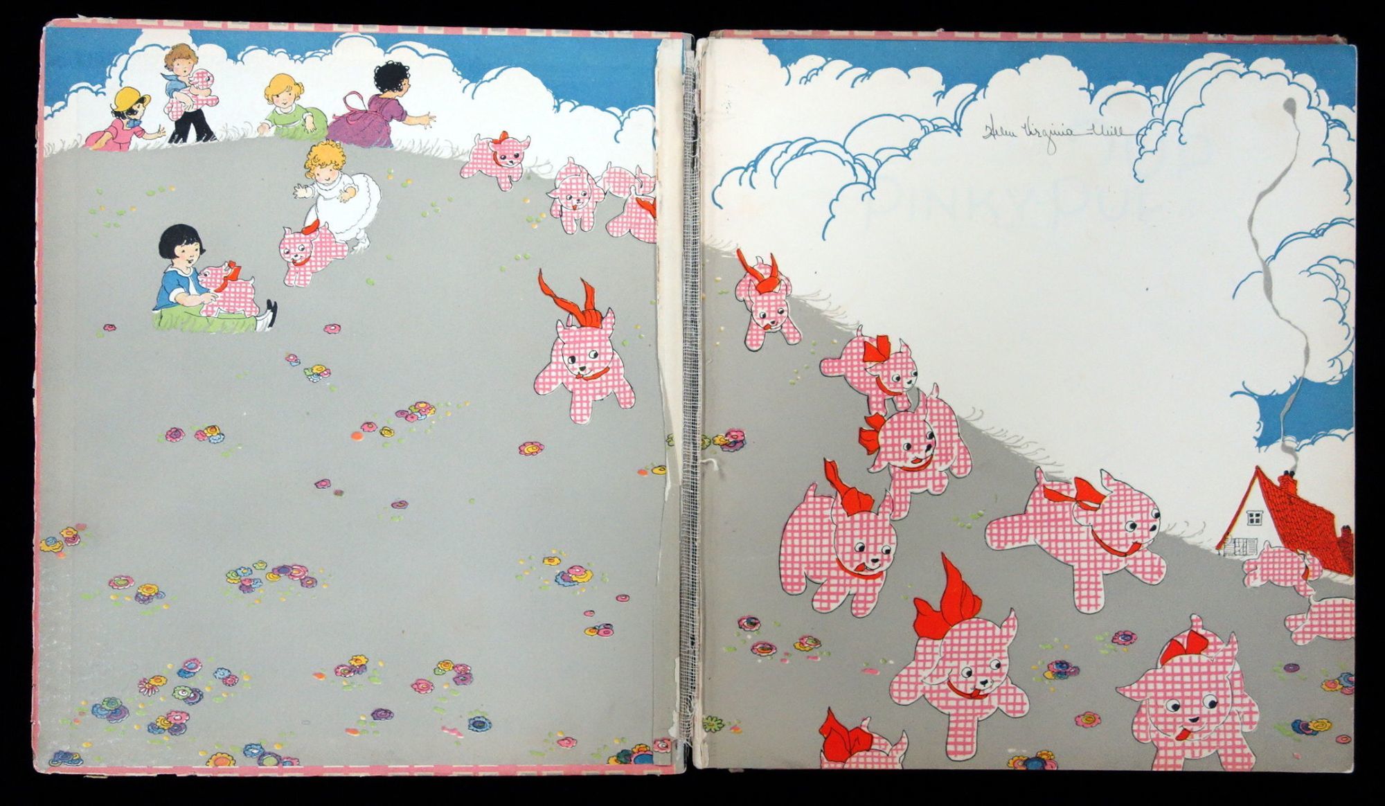 10" x 8 3/4" no Pinky-pup doll, binding and hinge cracked, inscribed, cover worn on edges, half title page torn.