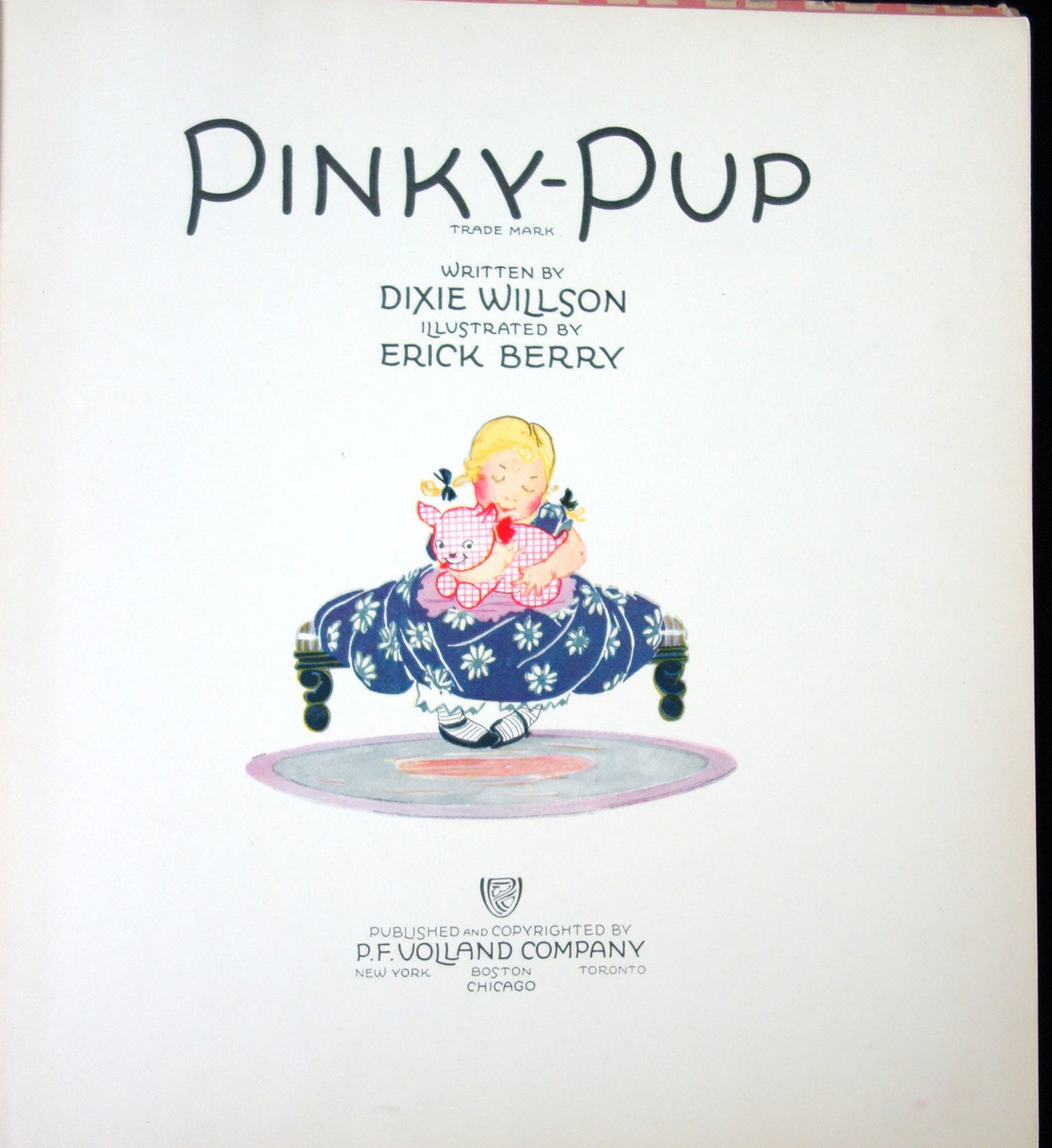 Chicago: P.F. Volland Company, 1922. Applied illustrated black and pink hard cover, A Volland Book to Read and a Doll to Cuddle, trademark, color and black and white illustrations by Erick Berry.
