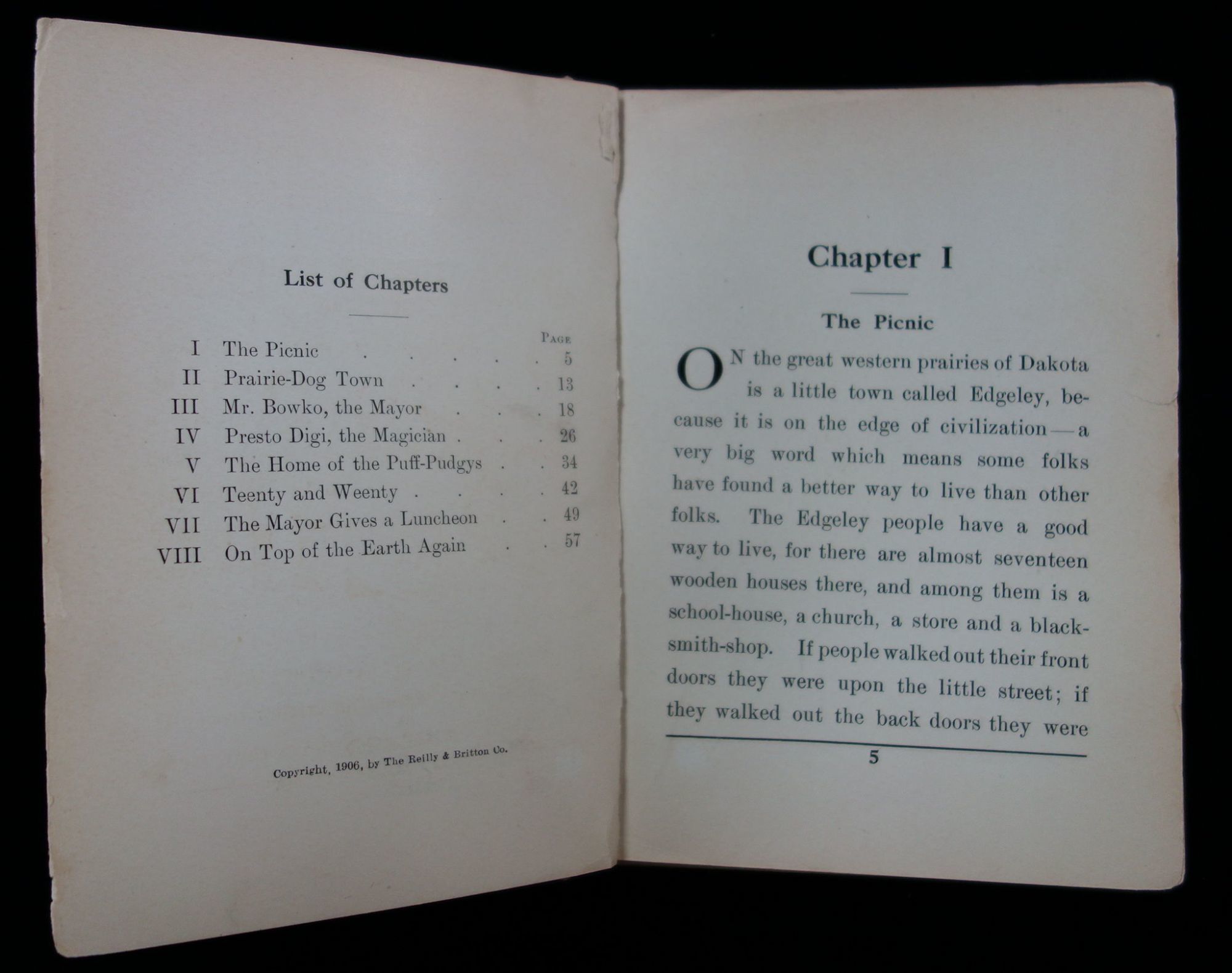 Chapters include The Picnic; Prairie-Dog Town; Mr. Bowko, the Mayor; Presto Digi, the Magician; The Home of the Puff-Pudgys; Teenty and Weenty; The Mayor Gives a Luncheon; On Top of the Earth Again.