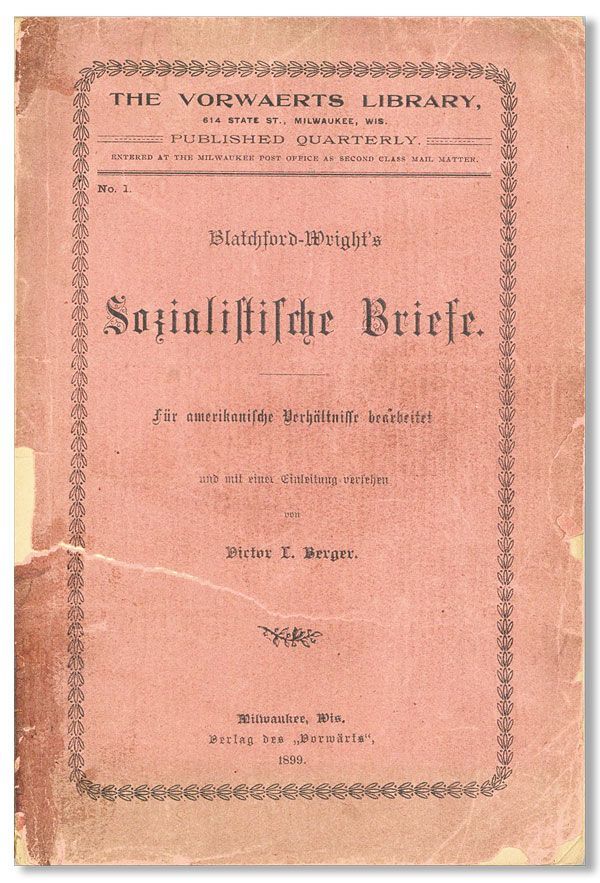 Milwaukee: Verlag des "Vorwärts, 1899. First Thus. Wrapper issue. Octavo (21.75cm.); original red decorative wrappers; xxiv,188pp. Lacking rear wrapper, upper wrapper with long closed horizontal tear across lower third of wrapper not affecting text, additional chips and shallow losses along extremities, extremities toned; textblock uniformly toned, pp. 187/8 chipped along gutter edge. Fair to Good. This wrapper issue published as No. 1 of the Vorwaerts Library. German translation of Robert Blatchford's socialist treatise Merrie England (1893), first published in a series of articles in The Clarion. This edition has been adapted for a German-American readership.