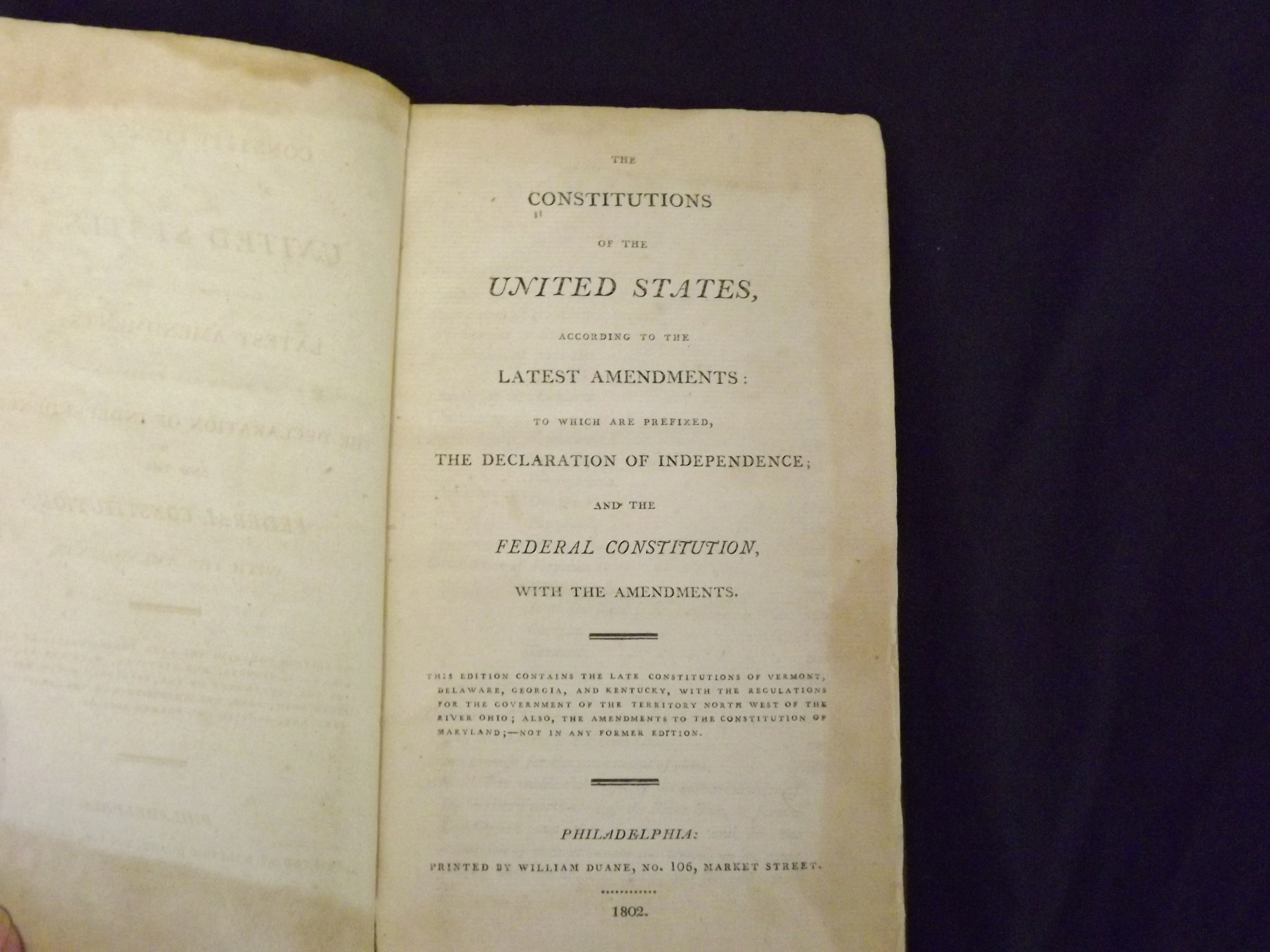 8vo, period calf, rebacked with leather, [2], 266 pp. Joints cracked, rebacking crude, some wear to covers, paper slightly fragile, front endpaper detached, other front endpaper with piece missing, ink name on front pastedown, some darkening to contents; otherwise about very good. This is a rich volume of early American government. In addition to the United Sates Constitution, and Declaration of Independence, this volume also contains the constitutions of the original states and the ordinances for the government of the North West Territory. Printed under the title is the notation that "This edition contains the constitutions of Vermont, Delaware, Georgia, and Kentucky, with the regulations for the government of the territory north west of the river Ohio." This material was not in any other edition.