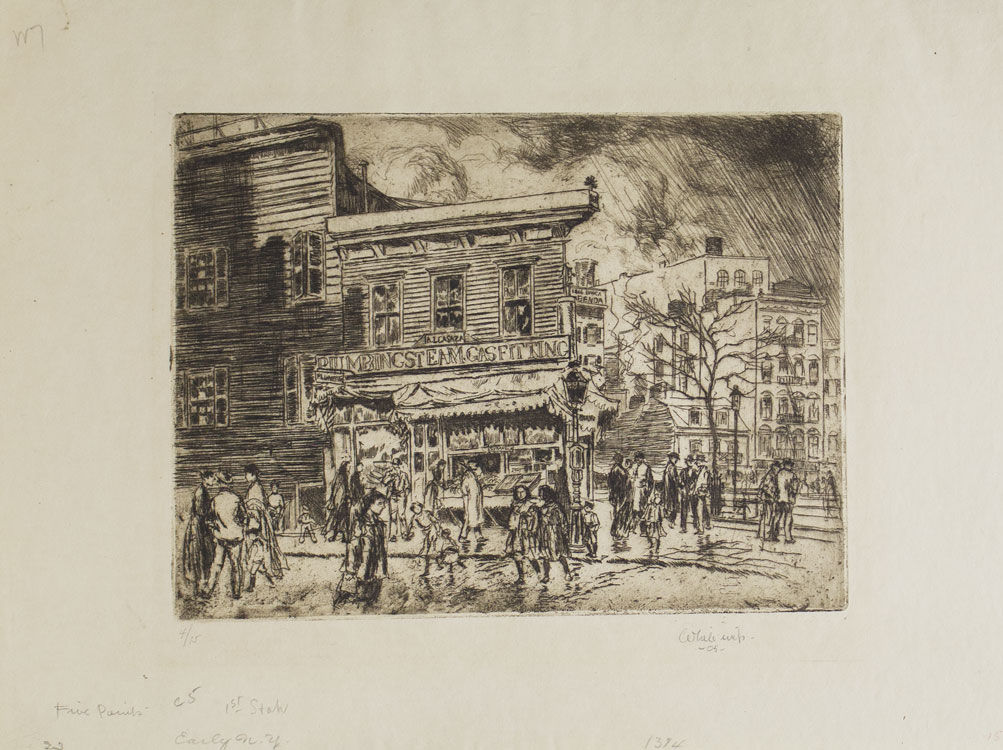Signed, dated "05" numbered 4/15 and annotated 'imp" beneath the image in pencil. On wove paper with wide margins. 149 x 200 mm. Matted. Signed, dated "05" numbered 4/15 and annotated 'imp" beneath the image in pencil. On wove paper with wide margins. 149 x 200 mm. From the "New York, East Side Set, 1902" done for Harper's magazine in a series of 8. Wehye (Memorial Exhibition Catalogue_ Number 5