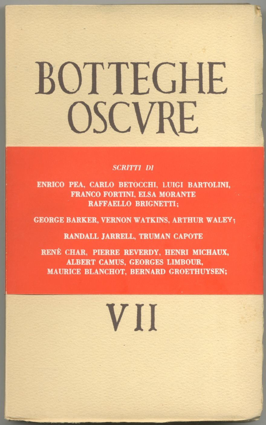 Rome: Botteghe Oscure, 1951. Softcover. Fine. Printed wrappers as issued. Unopened. Fine in fine wraparound band. An important literary magazine with contributions by Truman Capote ("The Glass Harp"), Randall Jarrell, Albert Camus, Henri Michaux, Donald Windham, William Denby, and many others. Scarce in this condition.