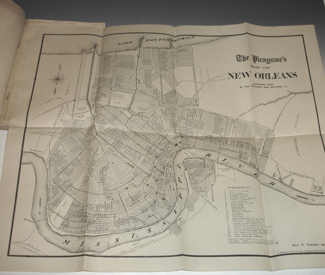 New Orleans, (1908): Picayune Job Print. Octavo. . 8th edition. 144pp., ix pp. index, (7)pp. illustrated ads. illustrated throughout of various business, historic buildings, places to visit and things to do. Includes a large folding street map of New Orleans as frontispiece, bound in color pictorial paper wraps, some chipping and a few creases, Some loss of paper on spine (1/2" to head and about 2" to foot).A good copy with an exceptional large map.