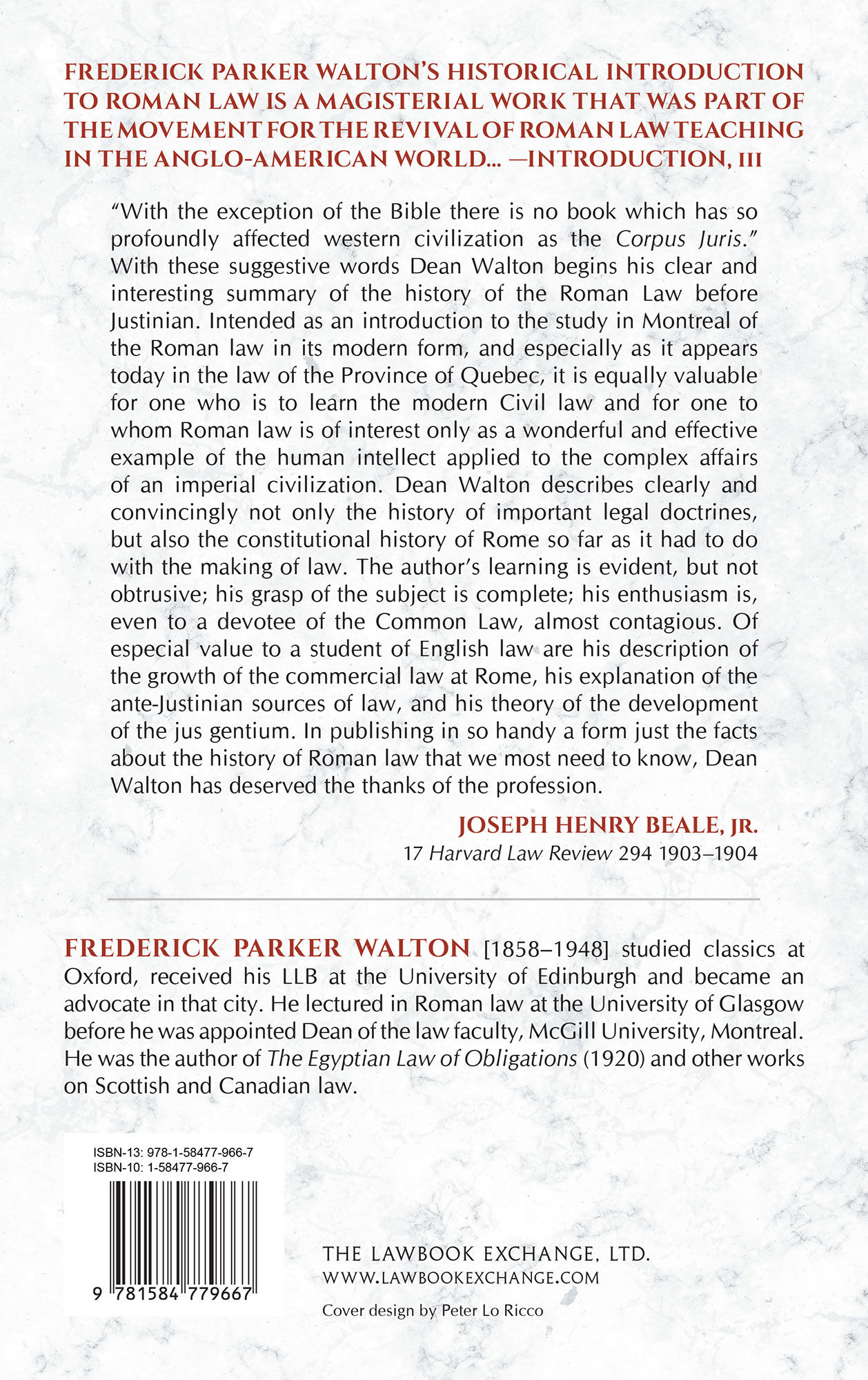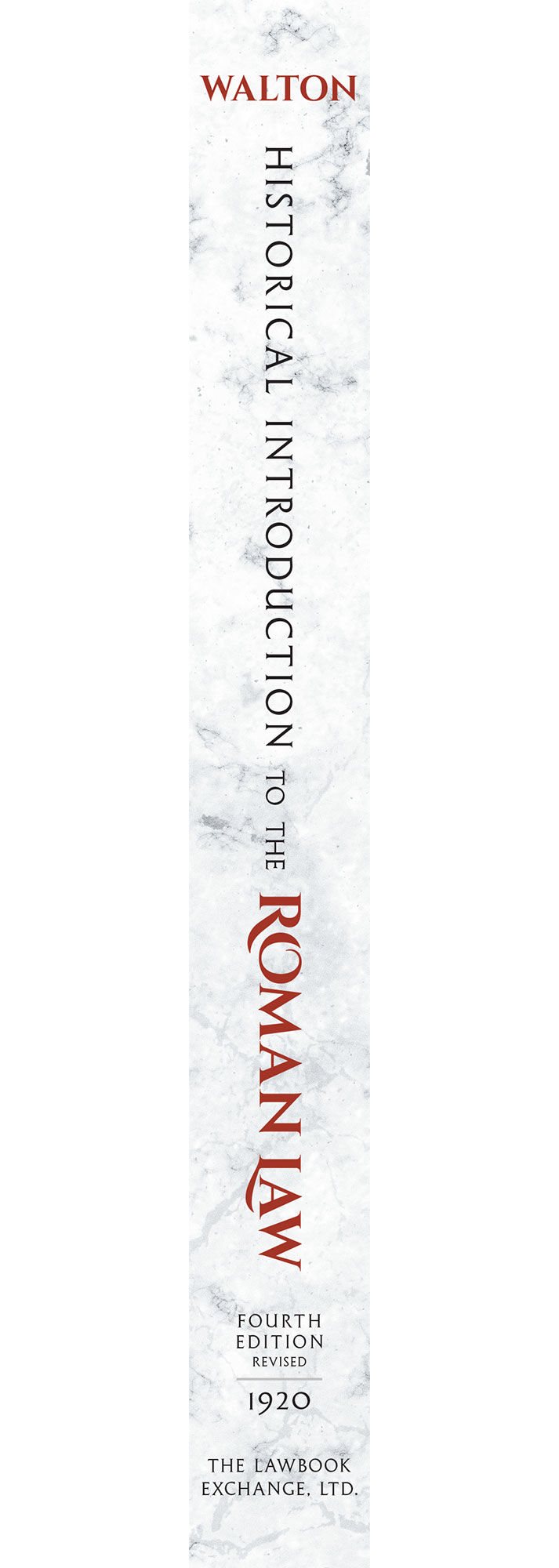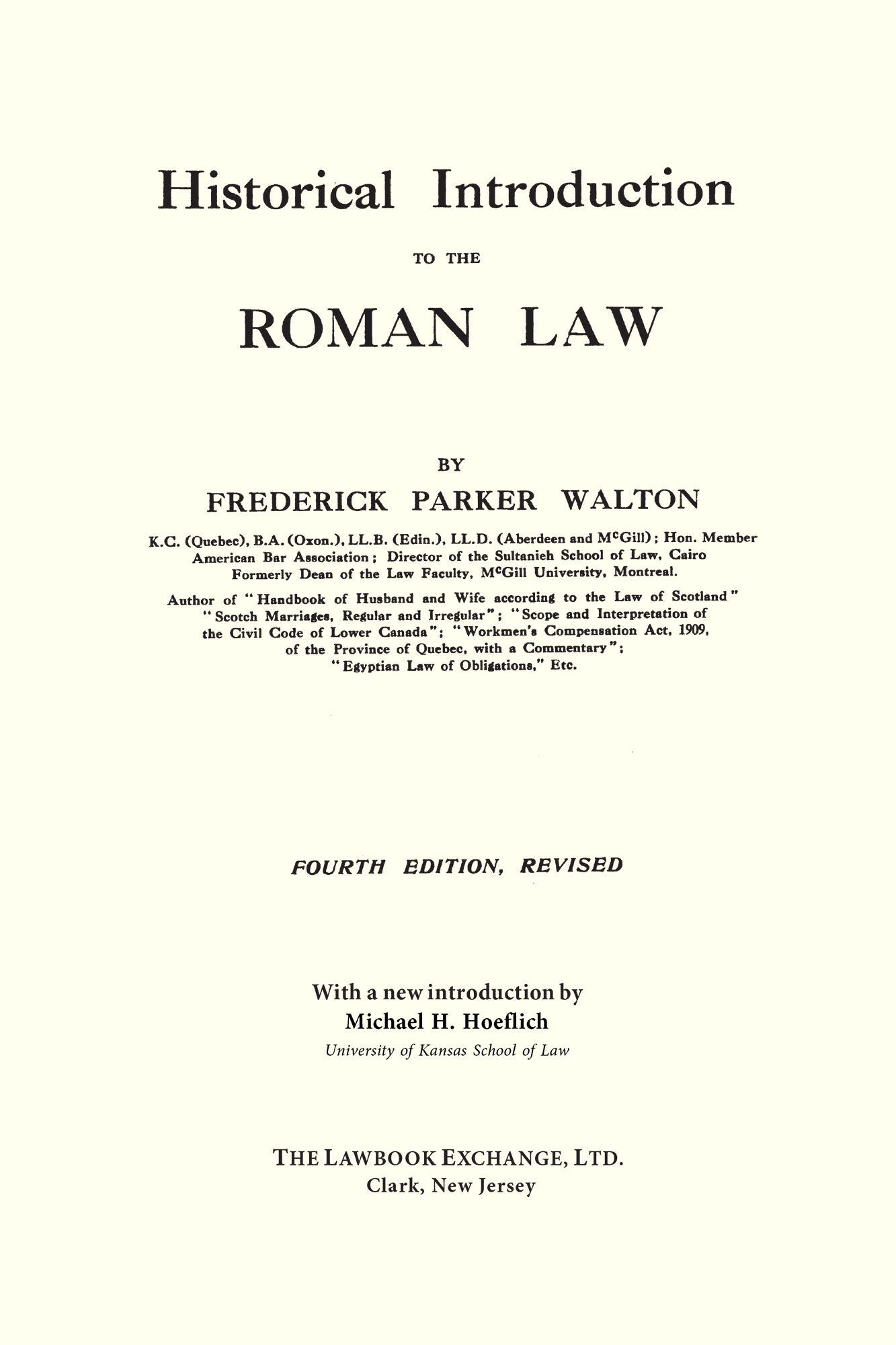 2016. ISBN-13: 9781584779667; ISBN-10: 1584779667. Walton, Frederick Parker. Historical Introduction to the Roman Law. Originally published: Edinburgh, W. Green & Son, Limited, 1920. iii-vii (new introduction), xvi, 394 pp. With a new introduction by Michael H. Hoeflich, John H. & John M. Kane Professor of Law, University of Kansas School of Law. Reprinted 2016 by The Lawbook Exchange, Ltd. ISBN-13: 9781584779667. ISBN-10: 1584779667. Hardcover. New. $59.95 * Reprint of the fourth and final edition. "Frederick Parker Walton's Historical Introduction to Roman Law is a magisterial work that was part of the movement for the revival of Roman law teaching in the Anglo-American world." -- Introduction, iii "`With the exception of the Bible there is no book which has so profoundly affected western civilization as the Corpus Juris.' With these suggestive words Dean Walton begins his clear and interesting summary of the history of the Roman Law before Justinian. Intended as an introduction to the study in Montreal of the Roman law in its modern form, and especially as it appears today in the law of the Province of Quebec, it is equally valuable for one who is to learn the modern Civil law and for one to whom Roman law is of interest only as a wonderful and effective example of the human intellect applied to the complex affairs of an imperial civilization. Dean Walton describes clearly and convincingly not only the history of important legal doctrines, but also the constitutional history of Rome so far as it had to do with the making of law. The author's learning is evident, but not obtrusive; his grasp of the subject is complete; his enthusiasm is, even to a devotee of the Common Law, almost contagious. Of especial value to a student of English law are his description of the growth of the commercial law at Rome, his explanation of the ante-Justinian sources of law, and his theory of the development of the jus gentium. In publishing in so handy a form just the facts about the history of Roman law that we most need to know, Dean Walton has deserved the thanks of the profession." -- J[oseph] H[enry] B[eale], Jr., 17 Harvard Law Review 294 1903-1904 FREDERICK PARKER WALTON [1858-1948] studied classics at Oxford, received his LLB at the University of Edinburgh and became an advocate in that city. He lectured in Roman law at the University of Glasgow before he was.