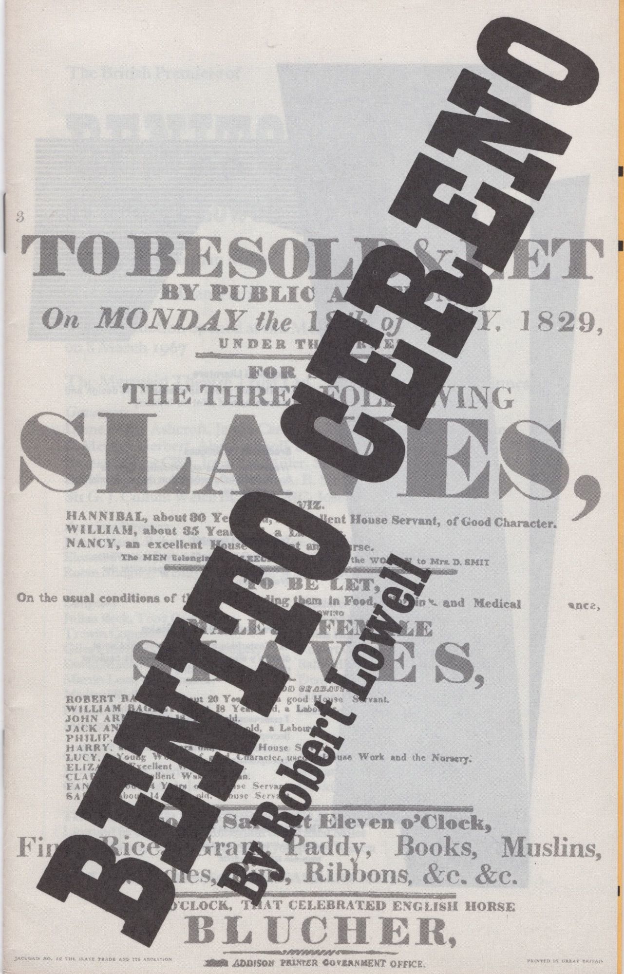 [London]: The Mermaid Theatre, 1967. Paperback. Fine. Paperback. Theatre program. Benito Cereno is the third part of the trilogy "The Old Glory." It is based on a short story by Herman Melville, which was based on a true account of a slave ship. In addition to a list of the cast and crew, the program includes a biography of Lowell, an extract from "Narrative of Voyages and Travels in the Northern and Southern Hemisphere" by Amasa Delano (1817), a biography of Melville, a diagram of the slave ship, a reproduction of an ad for slaves, and an article "Slavery Today" by Patrick Montgomery. Bound in black and white printed wrappers. Includes yellow insert. Unpaginated. [24 pages.] DRA/111716.