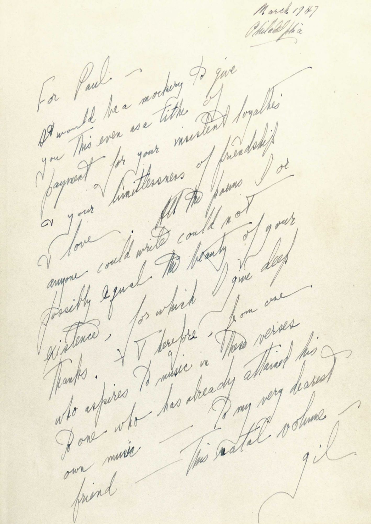 New York: The Banyan Press, 1947. Hardcover. Very Good. Hardcover. First edition. Author's first book. The first book of The Banyan Press. Number 5 of 350 numbered copies. Full page inscription by the author on the front free endpaper: "March 1947 / Philadelphia / For Paul-- / It would be a mockery to give you this even as a tithe of payment for your insistent loyalties & your limitlessness of friendship & love. All the poems I or anyone could write could not equal the beauty of your existence for which I give thanks. Therefore, from one who aspires to music in these verses to one who has already attained his own music--To my dearest friend--this natal volume-- / Gil". Bound in the original orange cloth with gilt title to spine. Bumped at the head and foot of the spine, stain on the rear cover, light wear at the extremities, and light dampstain to inside margins of some pages - otherwise very good, without dust jacket. 81 pages. POE/101316.