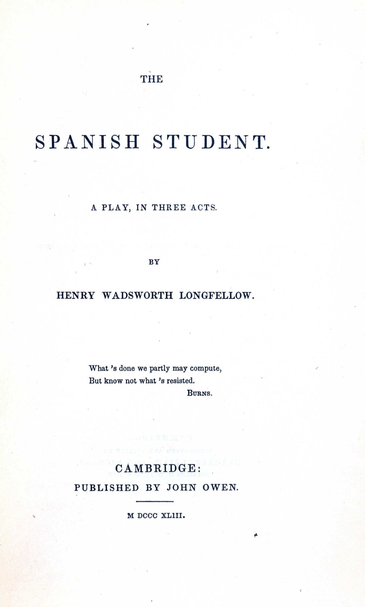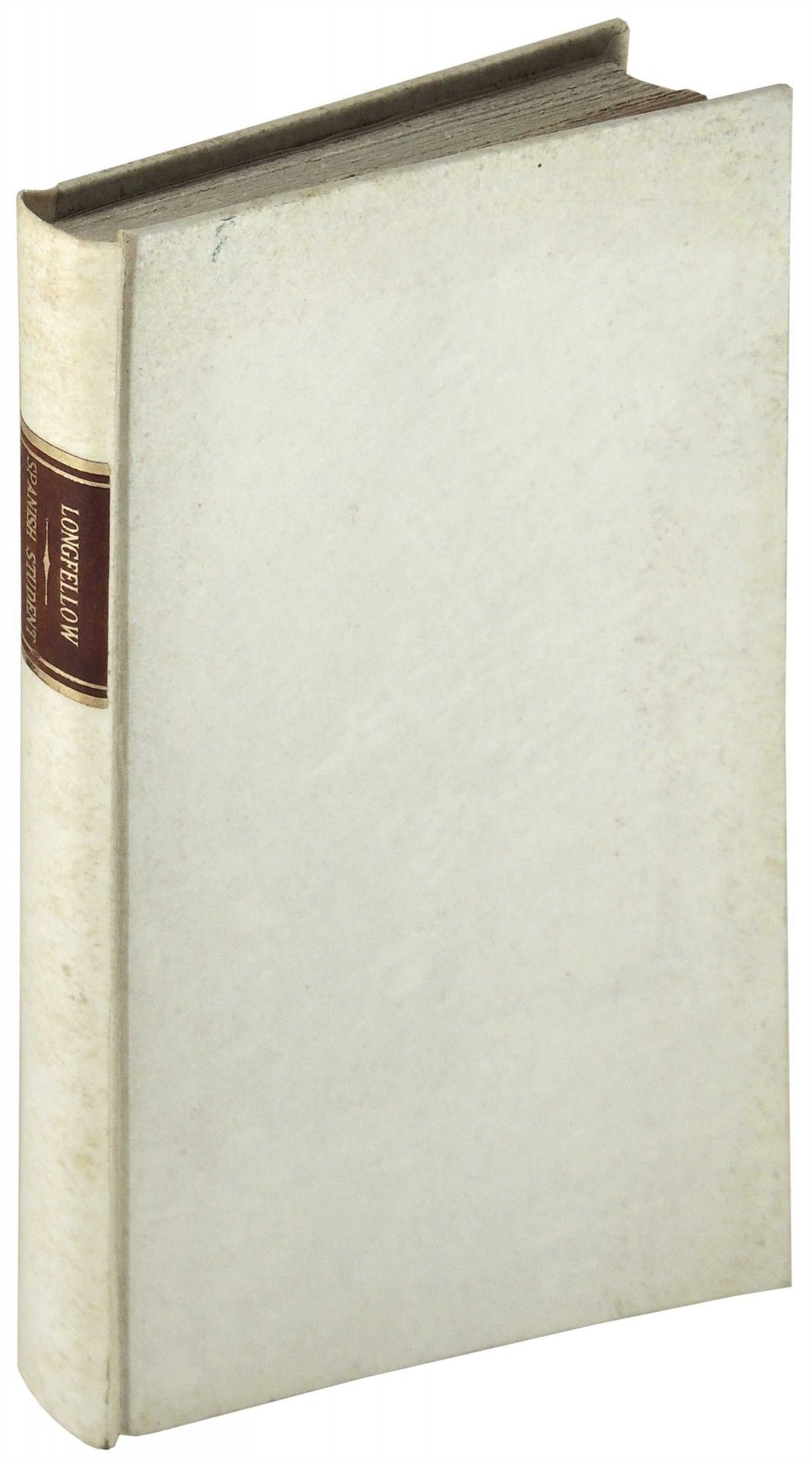 Cambridge: Published by John Owen, 1843. Hardcover. Very Good. Hardcover. First edition. Originally published in Graham’s Magazine (1842), this comedic play reflects Longfellow’s experiences in Spain. According to the preface the play “is taken in part from the beautiful tale of Cervantes, ‘La Gitanilla’.” Rebound in white parchment over boards with maroon leather label on the spine. New endpapers. The paper covering the internal front hinge is split; however, the binding remains tight. Foxing to edges of endpapers, edges of covers, and spine. Small dark marking to front cover and a few spots to interior, but clean and bright overall. 183 pages. DRA/101816.