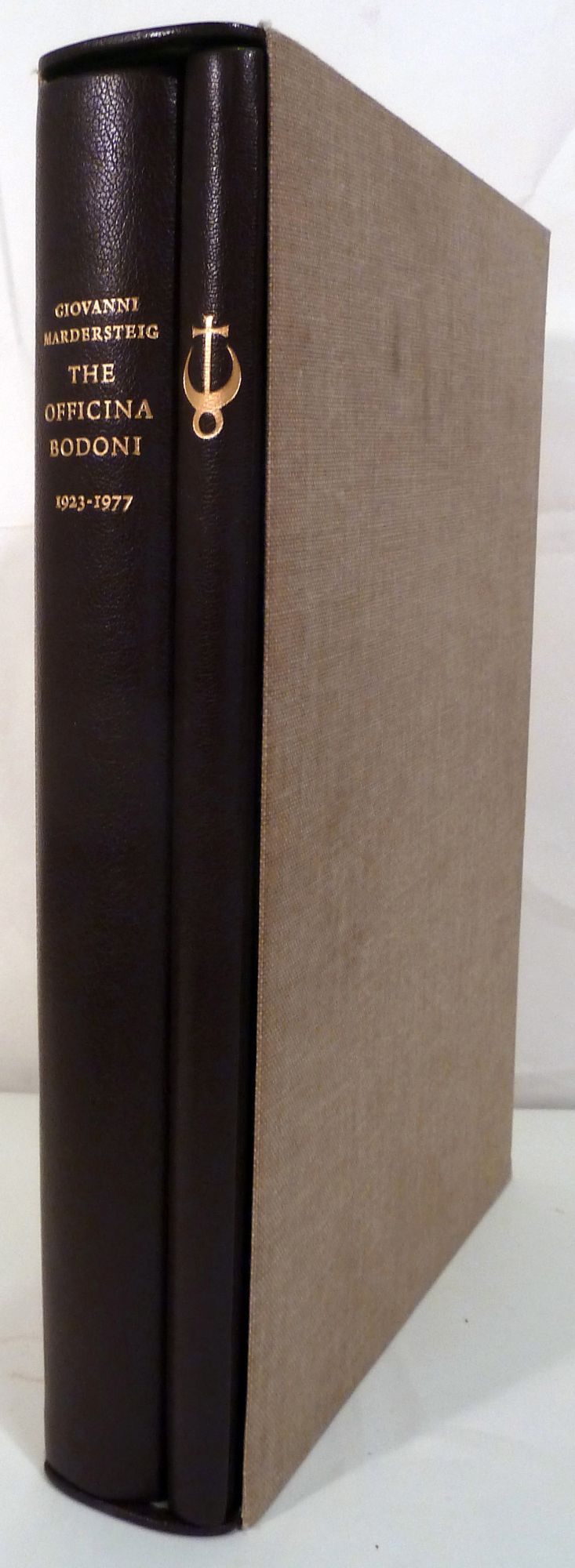 Verona: Edizioni Valdonega, 1980. First edition. Hardcover. Orig. half brown morocco and tan basket weave cloth, backstrips lettered or decorated in gilt. Fine in fine matching slipcase. 2 vols.. 286 & 90 pages. Folio, 30.5 x 21 cm. Limited edition, copy 95 of 99 accompanied by a second volume containing ten original leaves from hand-printed books of the Officina Bodoni, including a rare vellum leaf from Ovid's Nasonis Amores, with a note from the publisher that the second volume housing "The ten four-page leaves may differ in each copy." The latter were "made up of spare sheets of books printed in its archives." Edited by Hans Schmoller.
