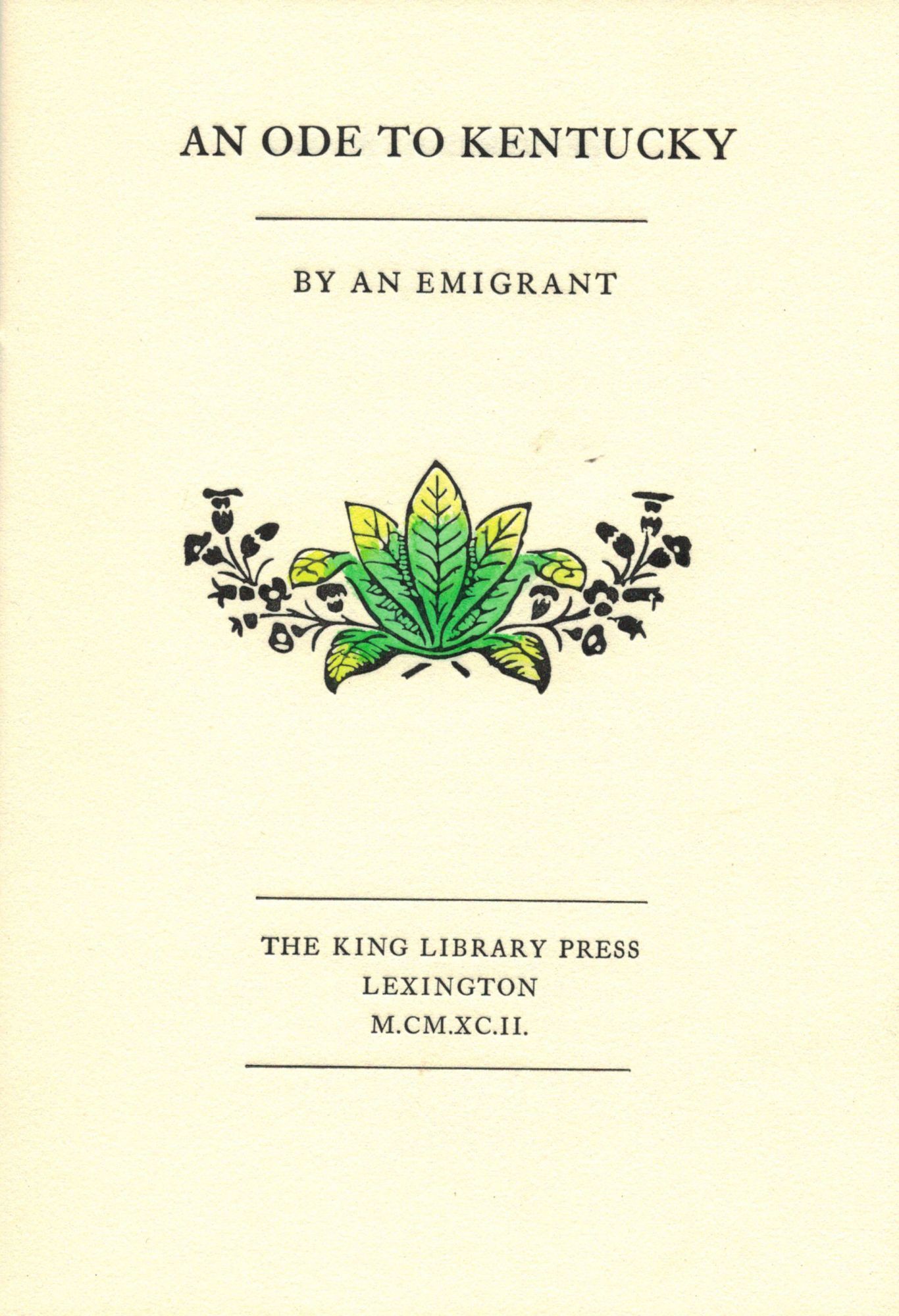 Lexington: The Kings Library Press, 1992. Stiff Wraps. Orig. dark green stiff wrappers, lettered in gilt, spine cloth tie. Fine. 4 leaves. 25 x 17 cm. Limited edition, copy 105 of 200. Thought to be the second separate printing of the earliest known poem about Kentucky. Set in Caslon Oldstyle, hand-printed on Rives mould-made paper in the Gravesend press at the King Library, University of Kentucky, celebrating the bicentennial of the Commonwealth. Colored wood engraving by Leo Wyatt.