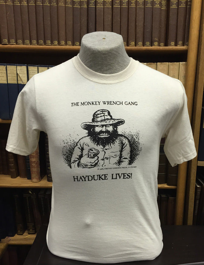 Salt Lake City: Dream Garden Press/Ken Sanders Rare Books, 2016. R. Crumb. R. Crumb provided vivid illustrations for Edward Abbey's comic masterpiece, "The Monkey Wrench Gang," and we're providing the t-shirts! Eight different 100% cotton t-shirts are currently available: The Whole Gang; the Wrench; Hayduke Lives!; Hayduke "I'm a Hippie!"; Doc Sarvis; Bonnie Abbzug; and Seldom Seen Smith (2 different designs). Hayduke Lives illustrated by R. Crumb. Natural shirt with Black ink. EXTRA-LARGE.