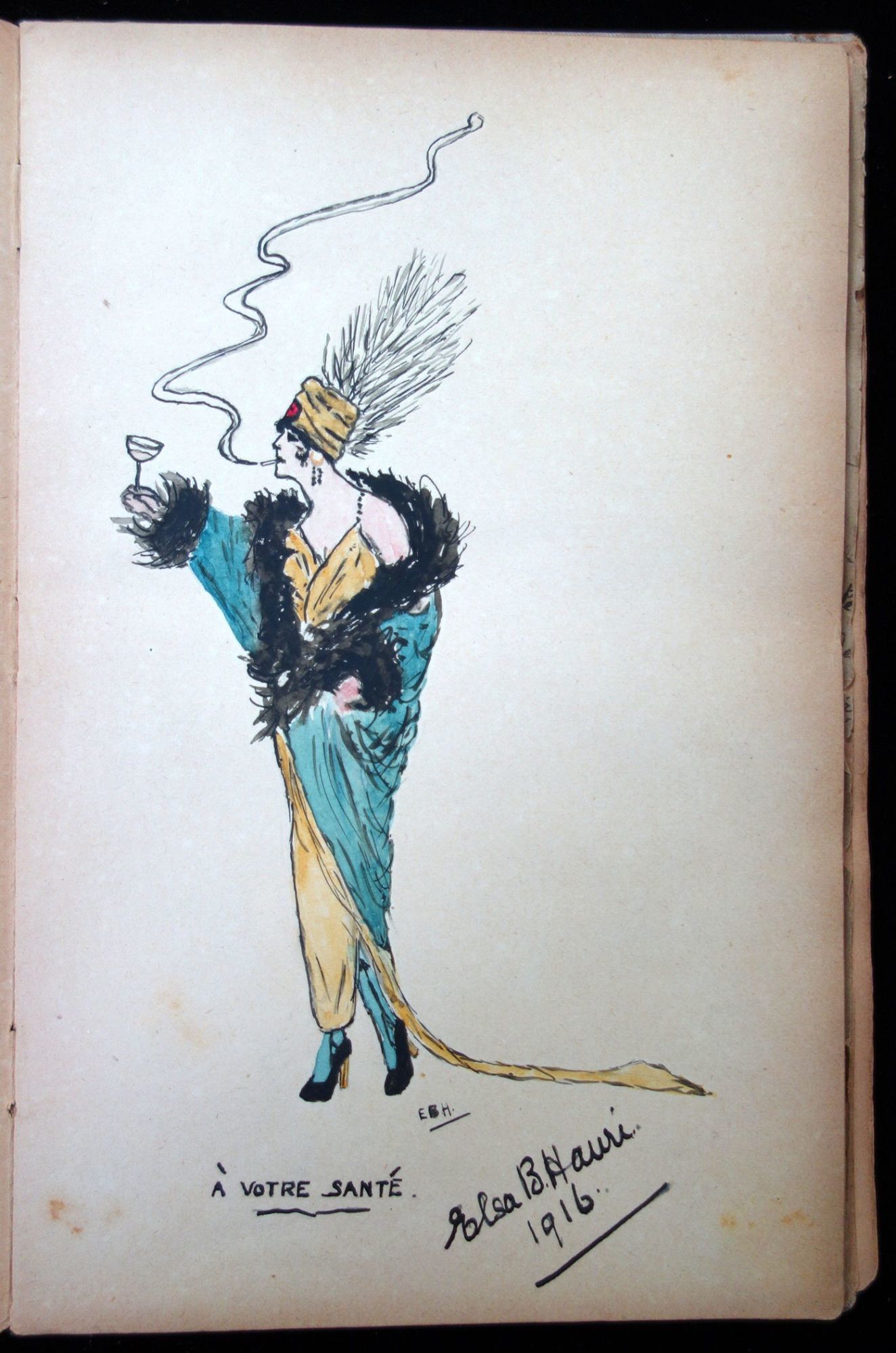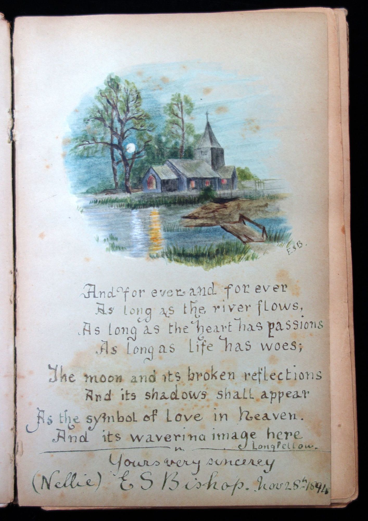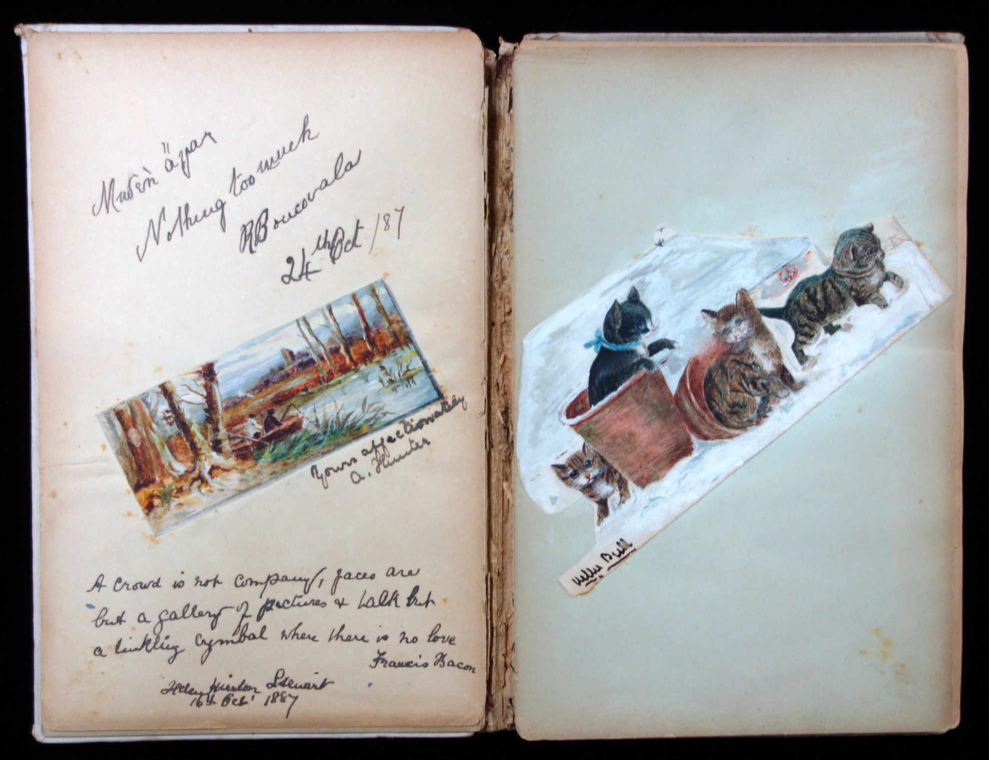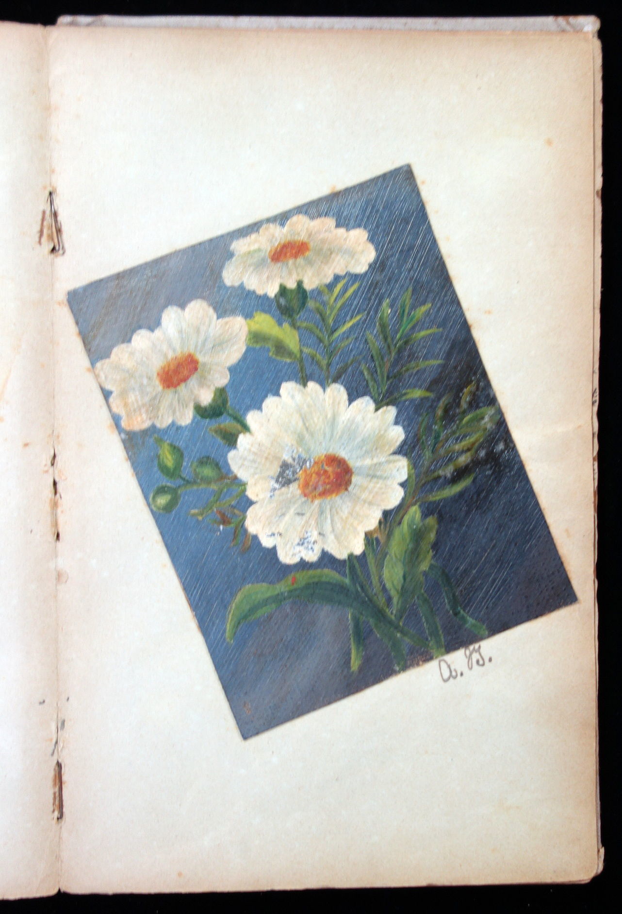 1916. Embossed colored cloth cover,hand drawn original artwork cut and glued onto pages, some with verses and signatures. A few pages say "to Flo", dates range from 1887-1916. Detailed and beautiful artwork; pencil sketches, pen and ink, watercolors, and paints, create a unique album. Verses included on some pages, credit to original authors. Some artwork is signed or initialed. Locations are not listed. Examples of artwork include; a sketched rabbit looking at silhouettes of hunters, vibrant painted flowers, a pen and ink sketch of a horse leaping a fence with the feet of the rider in the air, a pencil sketch of a sailor in uniform pulling petals off a flower that says "Sea Power", sketches of girl kneeling before boy with the quote "Two souls with a single thought, two hearts that beat as one", a sketch of a house on the banks of the water with a boat, the final sketch is a coffin in a graveyard with the note "Finis".