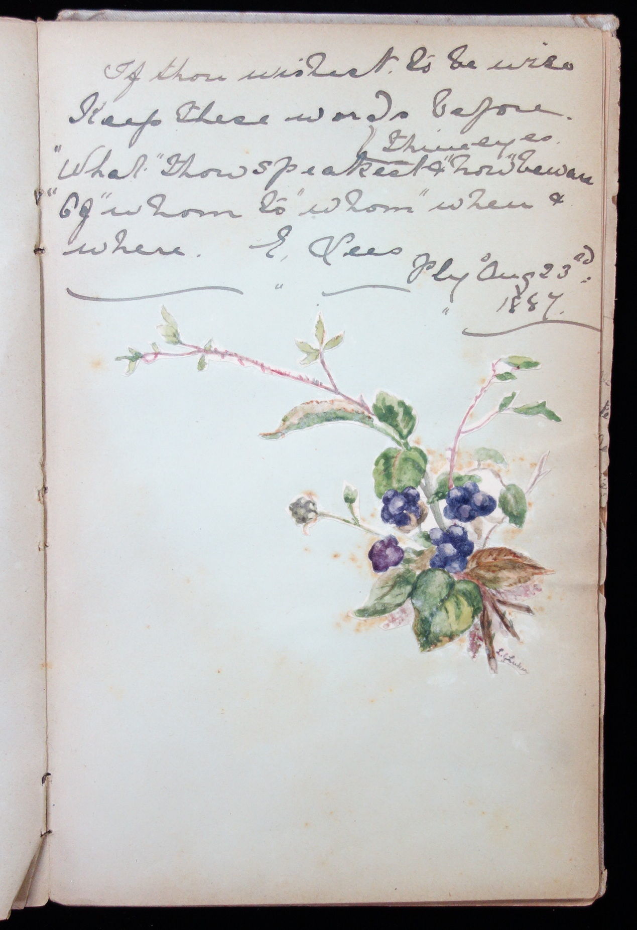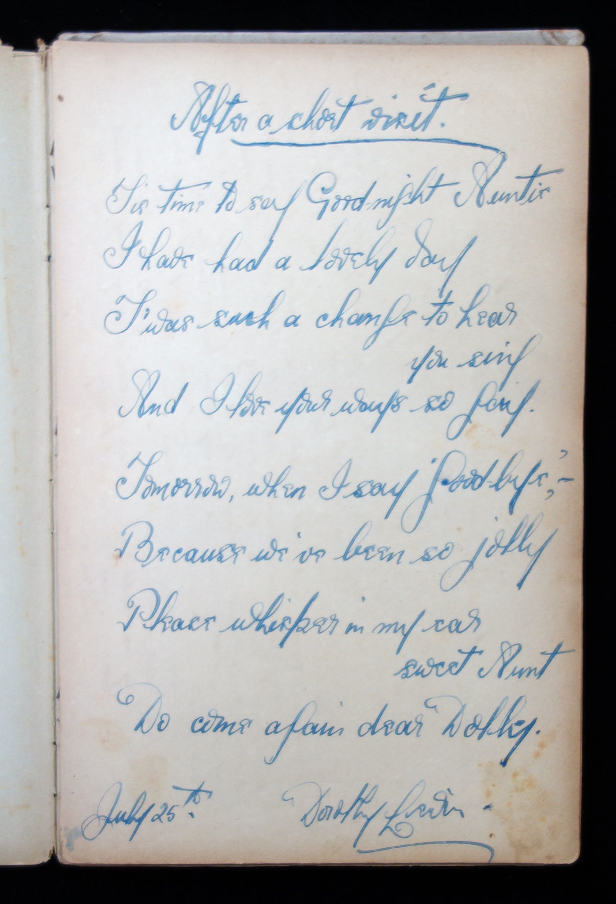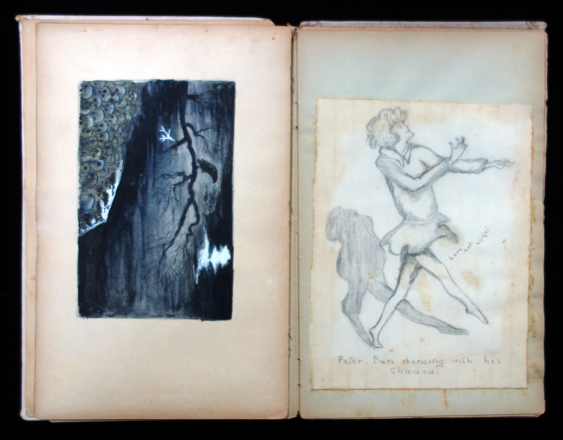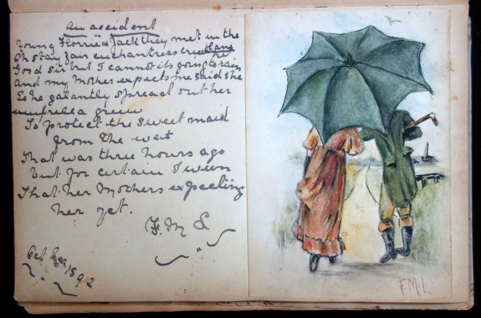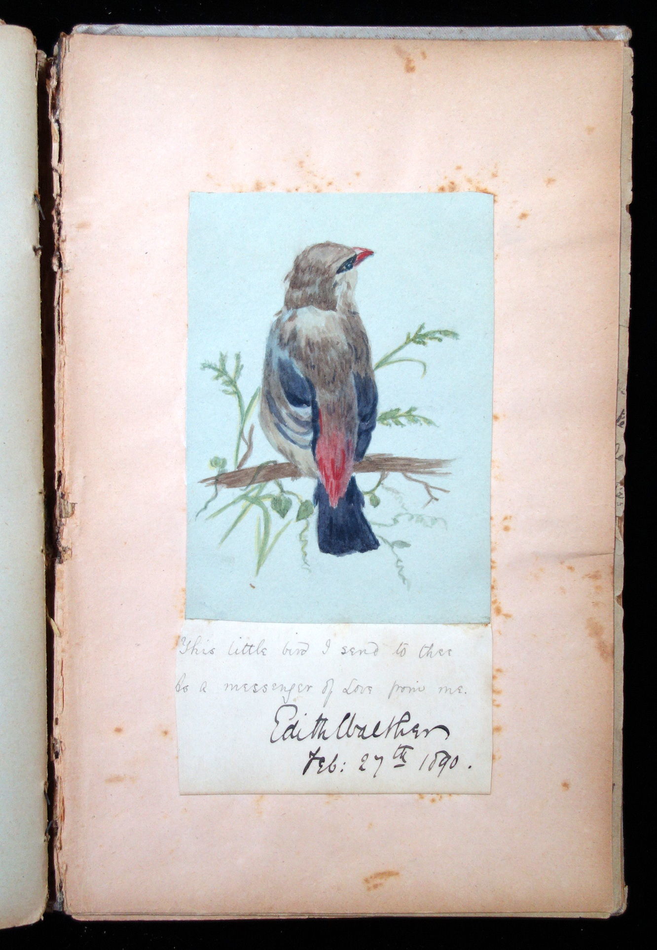 1916. Embossed colored cloth cover,hand drawn original artwork cut and glued onto pages, some with verses and signatures. A few pages say "to Flo", dates range from 1887-1916. Detailed and beautiful artwork; pencil sketches, pen and ink, watercolors, and paints, create a unique album. Verses included on some pages, credit to original authors. Some artwork is signed or initialed. Locations are not listed. Examples of artwork include; a sketched rabbit looking at silhouettes of hunters, vibrant painted flowers, a pen and ink sketch of a horse leaping a fence with the feet of the rider in the air, a pencil sketch of a sailor in uniform pulling petals off a flower that says "Sea Power", sketches of girl kneeling before boy with the quote "Two souls with a single thought, two hearts that beat as one", a sketch of a house on the banks of the water with a boat, the final sketch is a coffin in a graveyard with the note "Finis".