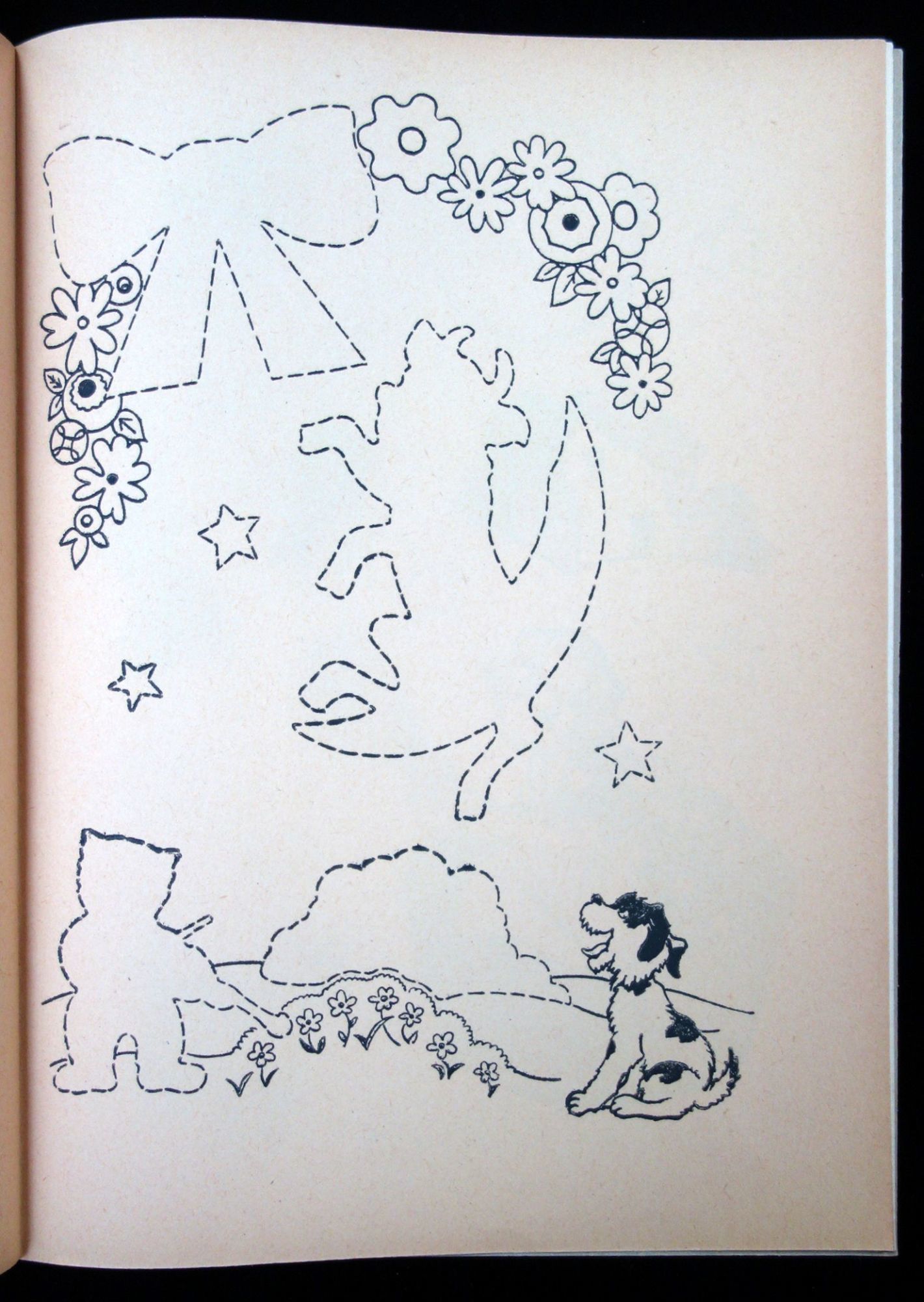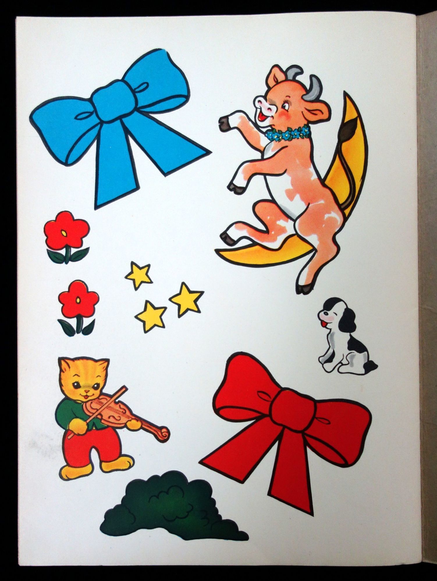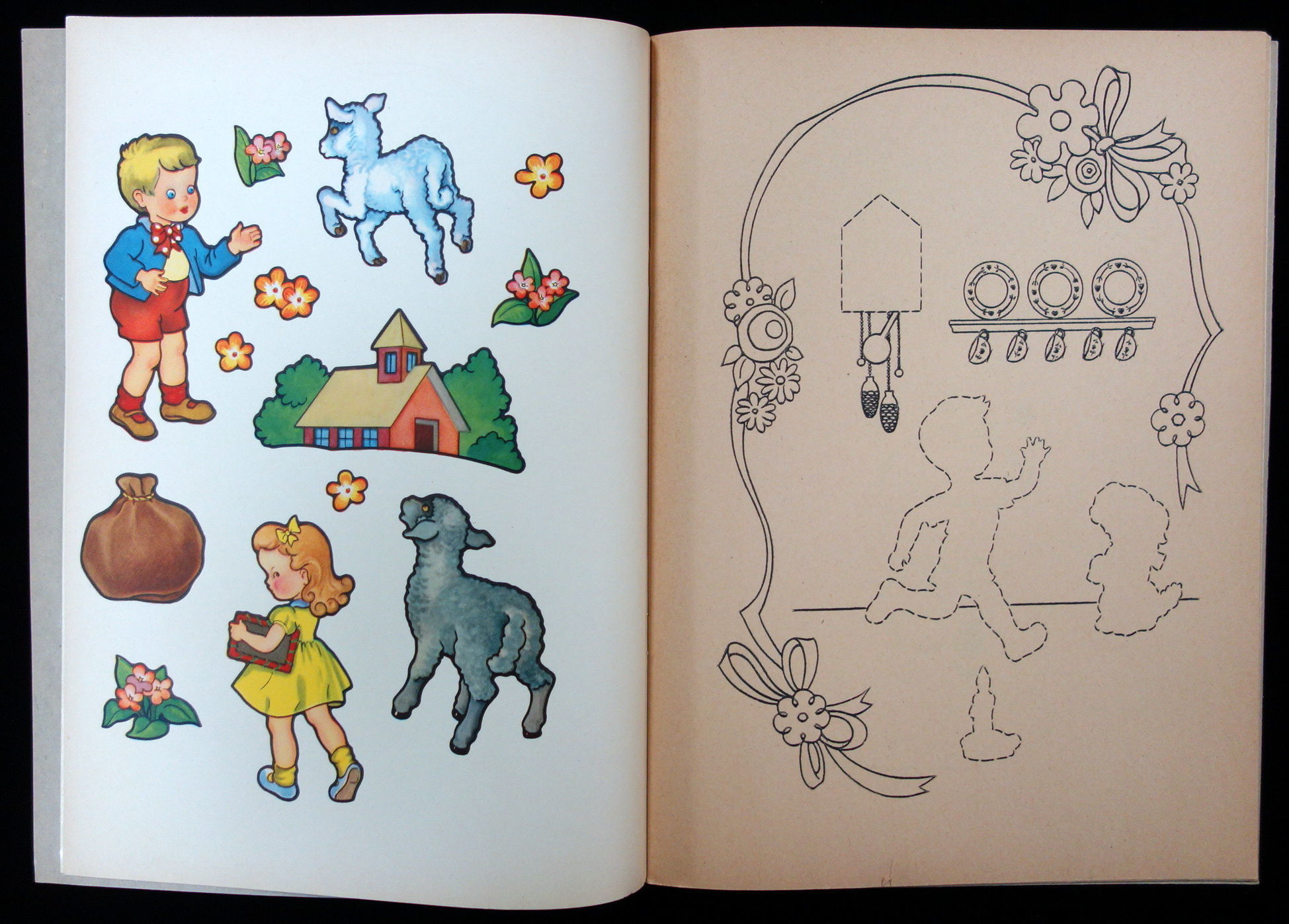 A coloring/activity book. Readers can cut out the color images on the sticky paper and paste them down on the coloring page where the outline of the picture matches. The pages are unused, the color images are uncut, and the pages are still sticky.