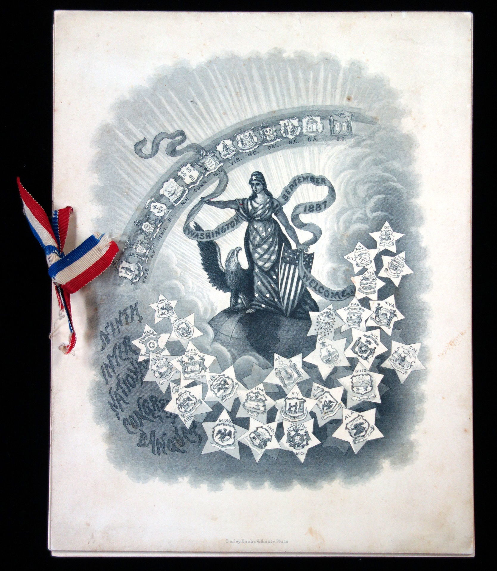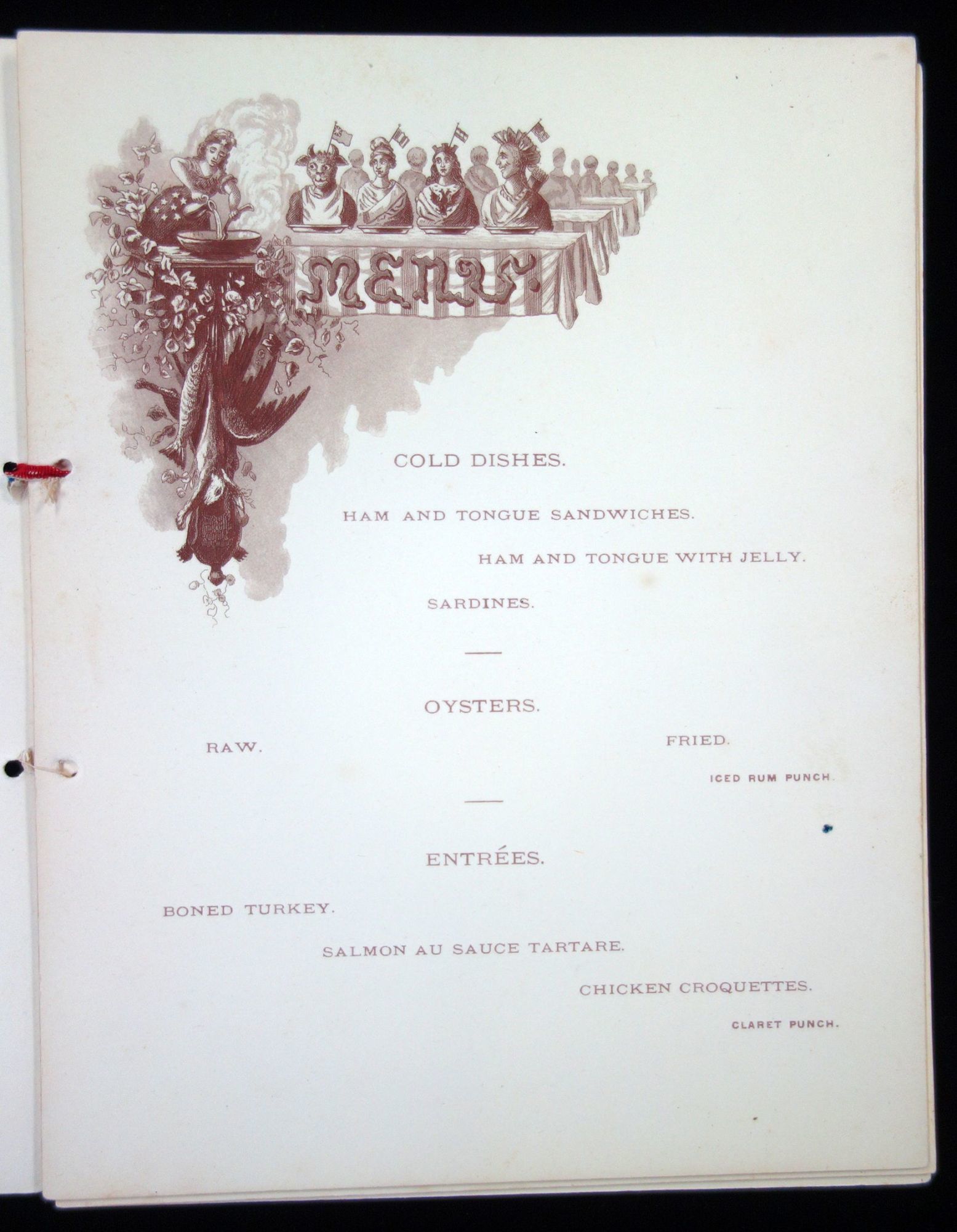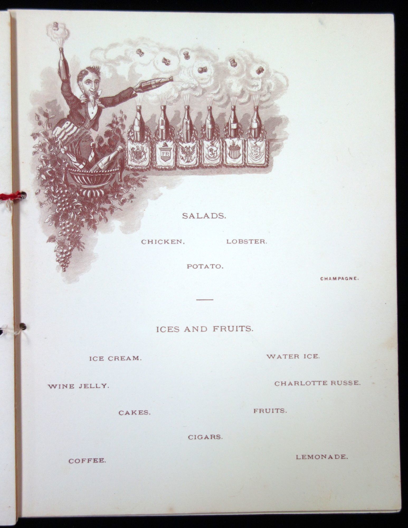 Philadelphia: Bailey Banks & Biddle. A 4 page heavy stock with gilt fore edge menu with a red, white and blue grosgrain ribbon binding. The front cover is an illustration of Lady Liberty with the American shield and the Eagle atop the world. The stars below represent the states of the United States with the exception of the 13 states in the rainbow above representing the 13 colonies. The event was held in Washington DC in September. The first page of the menu has a vignette at the upper left with Lady Liberty preparing food while allegorical representatives from England, France, Spain and the US await the fare. The imagery on the next page depicts Uncle Sam with a bottle of champagne while representative bottles from various companies "pop their corks". The back cover depicts an array of international flags wrapped in the United States flag. Fare includes ham and tongue sandwiches, sardines, salmon au tartare and much more. Measures 7 1/4" x 5 5/8". Printed by Bailey, Banks and Biddle, Phila. Light surface soiling from handling front cover.