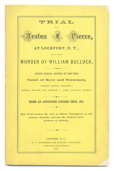 1871. Lockport, NY: M.C. Richardson and Co., 1871. Lockport, NY: M.C. Richardson and Co., 1871. A Successful "Mania Transitoria" Defense: McDade 748 [Trial]. Pierce, Aratus F., Defendant. Trial of Aratus F. Pierce, At Lockport, N.Y., For the Murder of William Bullock, Eighth Judicial District, Court of Oyer and Terminer, Charles Daniels, Presiding; Lorenzo Webster and G.L. Judd, Associate Justices, Tried at Adjourned October Term, 1871. Lockport, NY: M.C. Richardson and Co., 1871. 101 pp. Octavo (8-3/4" x 5-3/4"; 22.2 x 14.6 cm). Stab-stitched pamphlet in printed wrappers. Minor wear to spine ends, a few small chips to edges, light soiling to rear wrapper, light toning to interior. A well-preserved copy of a scarce title. $750. * Only edition. Pierce killed a man who seduced his sister, then refused to marry her. The trial is notable because it involved a successful defense based on the law of "mania transitoria," or momentary insanity (McDade). OCLC locates 13 copies, 4 in law libraries (Harvard, Social Law, Supreme Court of New York, U.S. Supreme Court). McDade, The Annals of Murder 748.