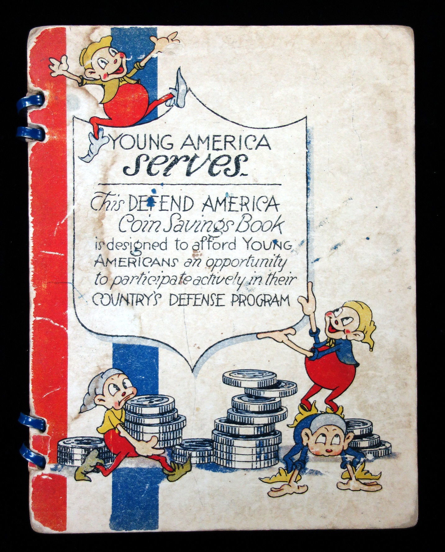 A savings books with verse about helping the defense program by saving coins. Describes coins and how they add up, for example, "10 copper pennies make two nickel nickels".