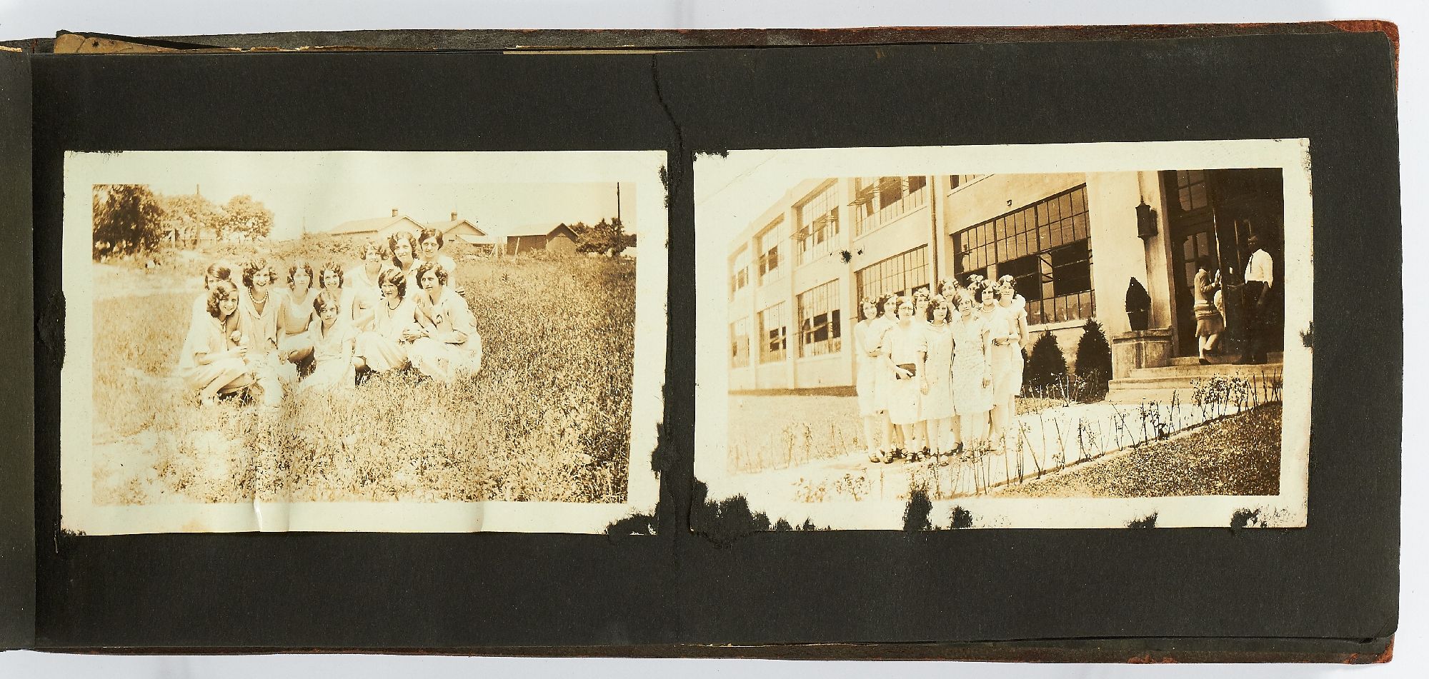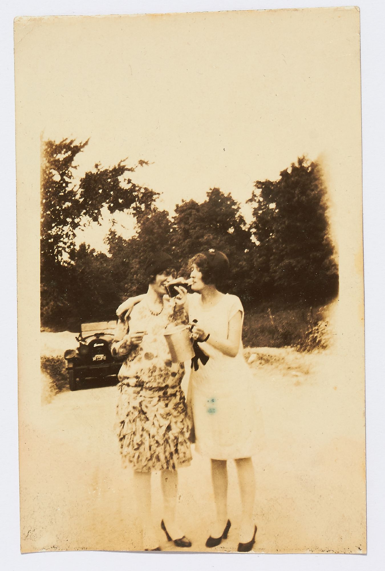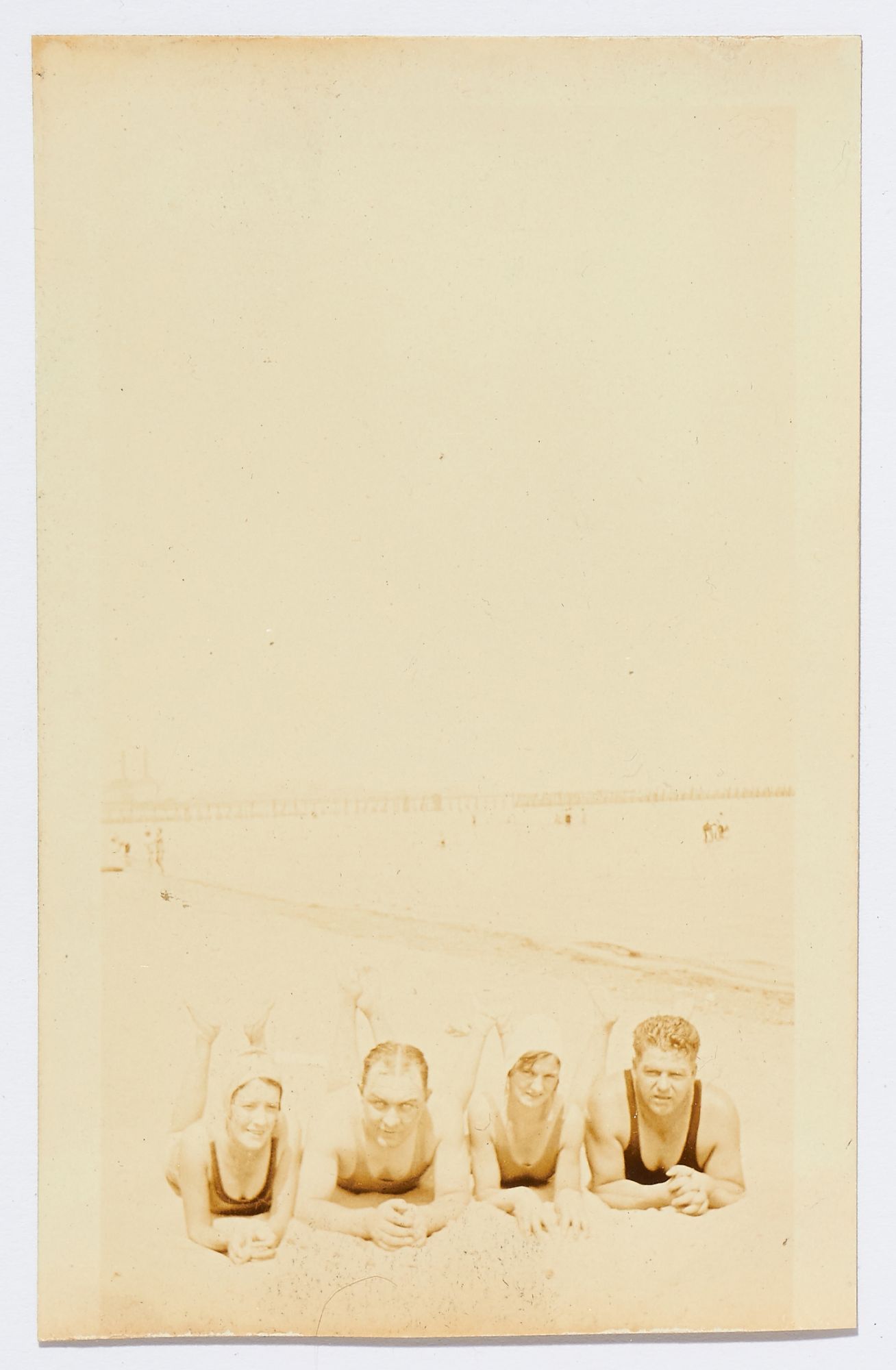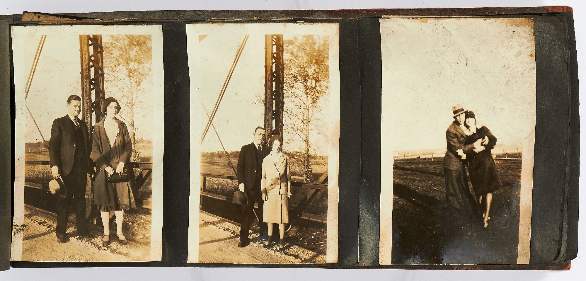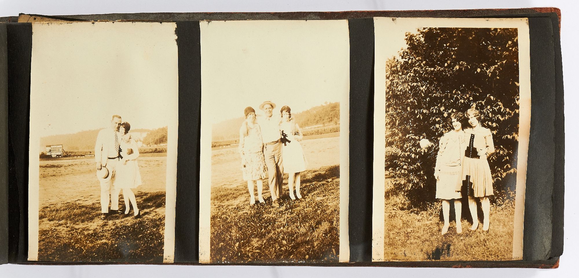 A photo album from a Kentucky family in the 1930s. The cover titled lists the compilers as Margaret and Walter and follows their friends and family while vacationing and going to events around 1932. Some of the photos are photo strip portraits of nicely dressed women and one of a couple posed together. A series of photos show people posed around a car drinking from a flask and an unlabeled bottle presumably at the end of prohibition. They vacationed on the Great Lakes and some photos show them posed on a beach and swimming. A group of women is seen in a few photos posed in the grass and in front of what appears to be a school. People are seen posed in a stadium including two men in football stances with their hands on the ground. Family is also seen posed on the steps of their home with all generations present. The final photograph shows a group photo of a baseball team.