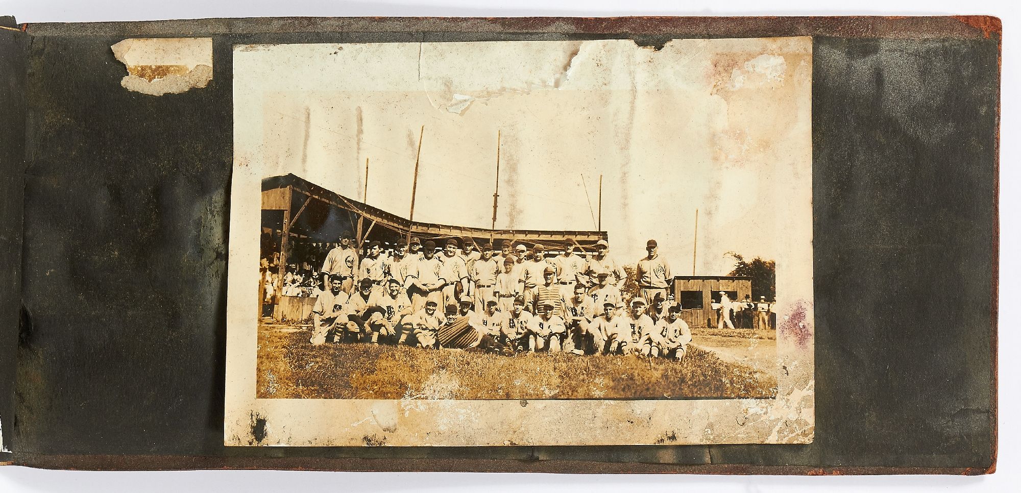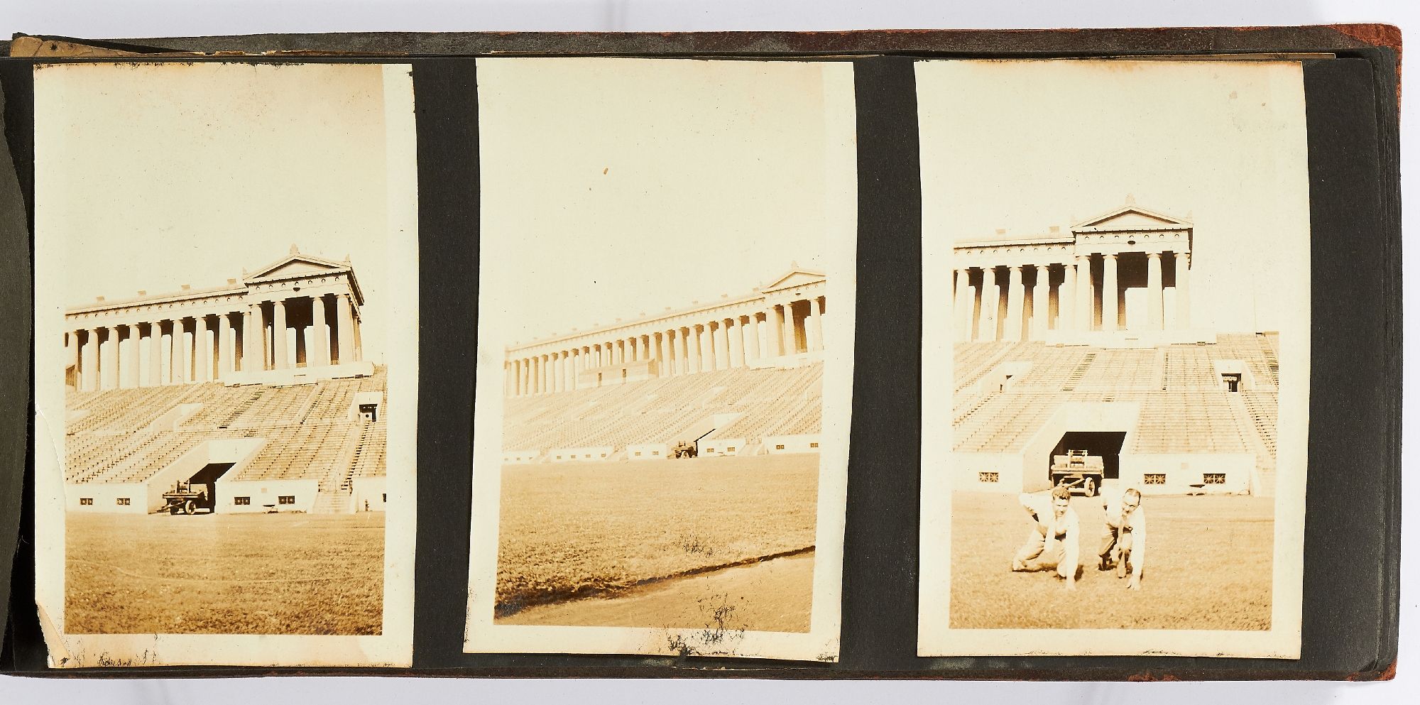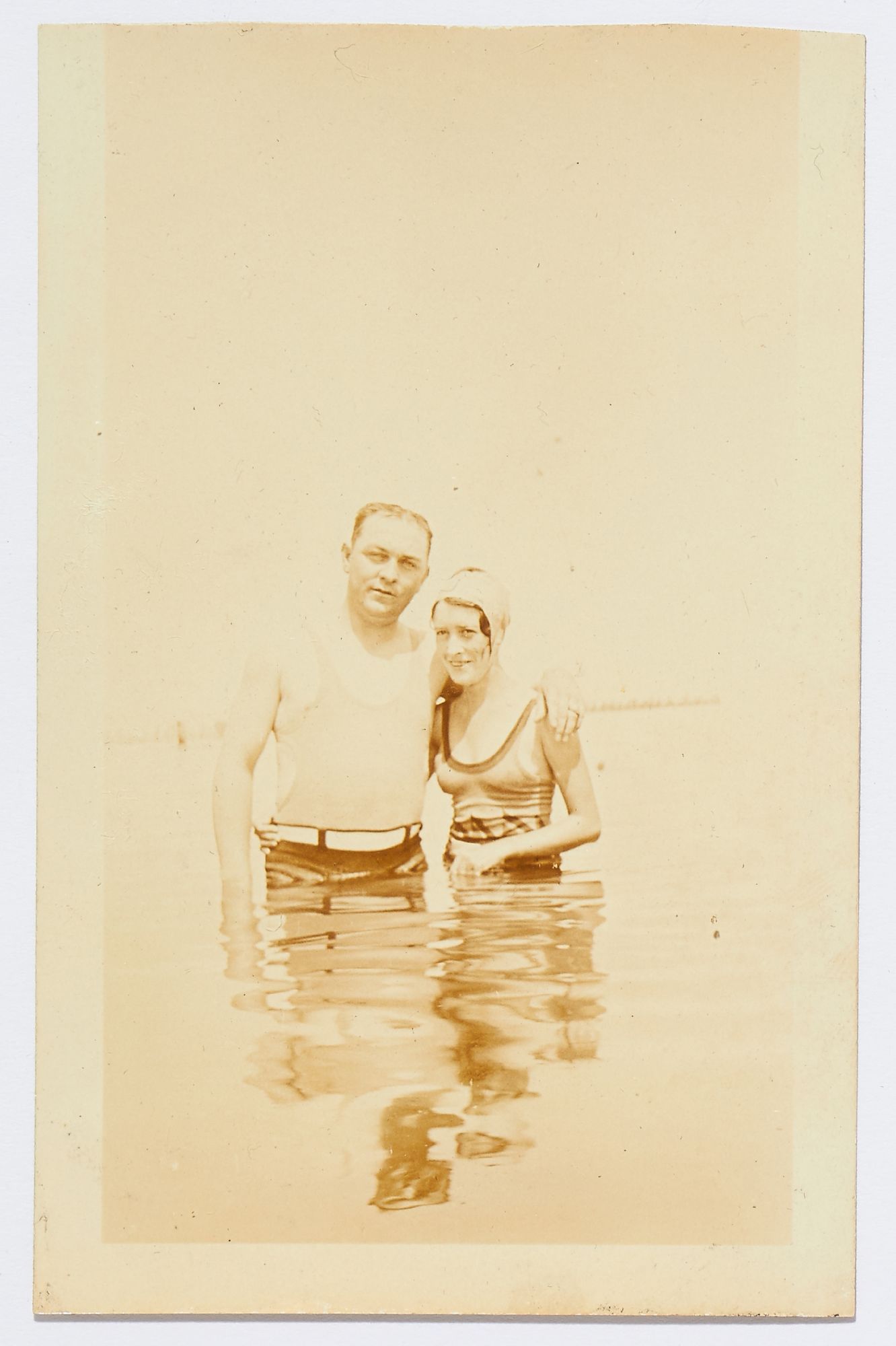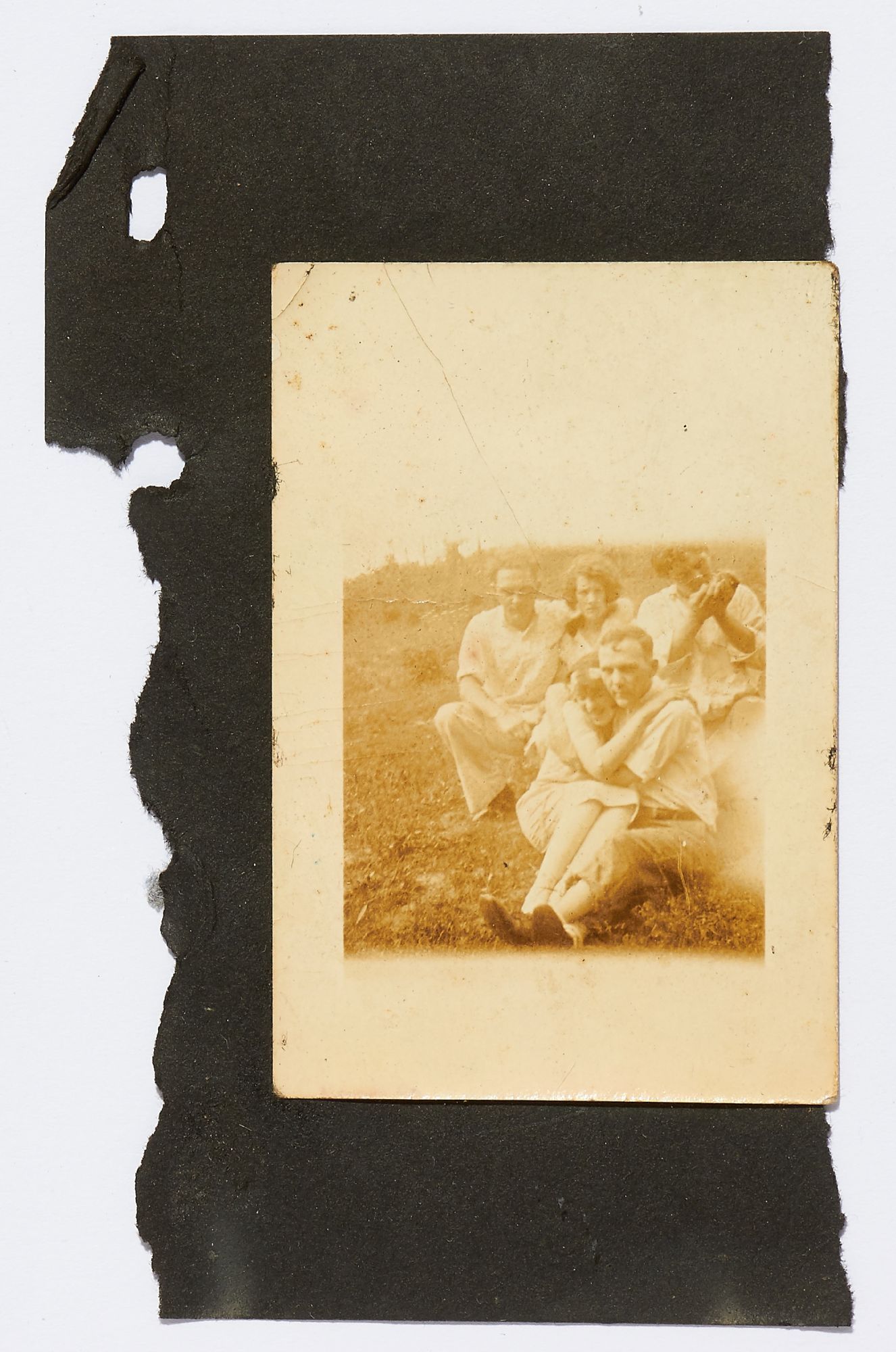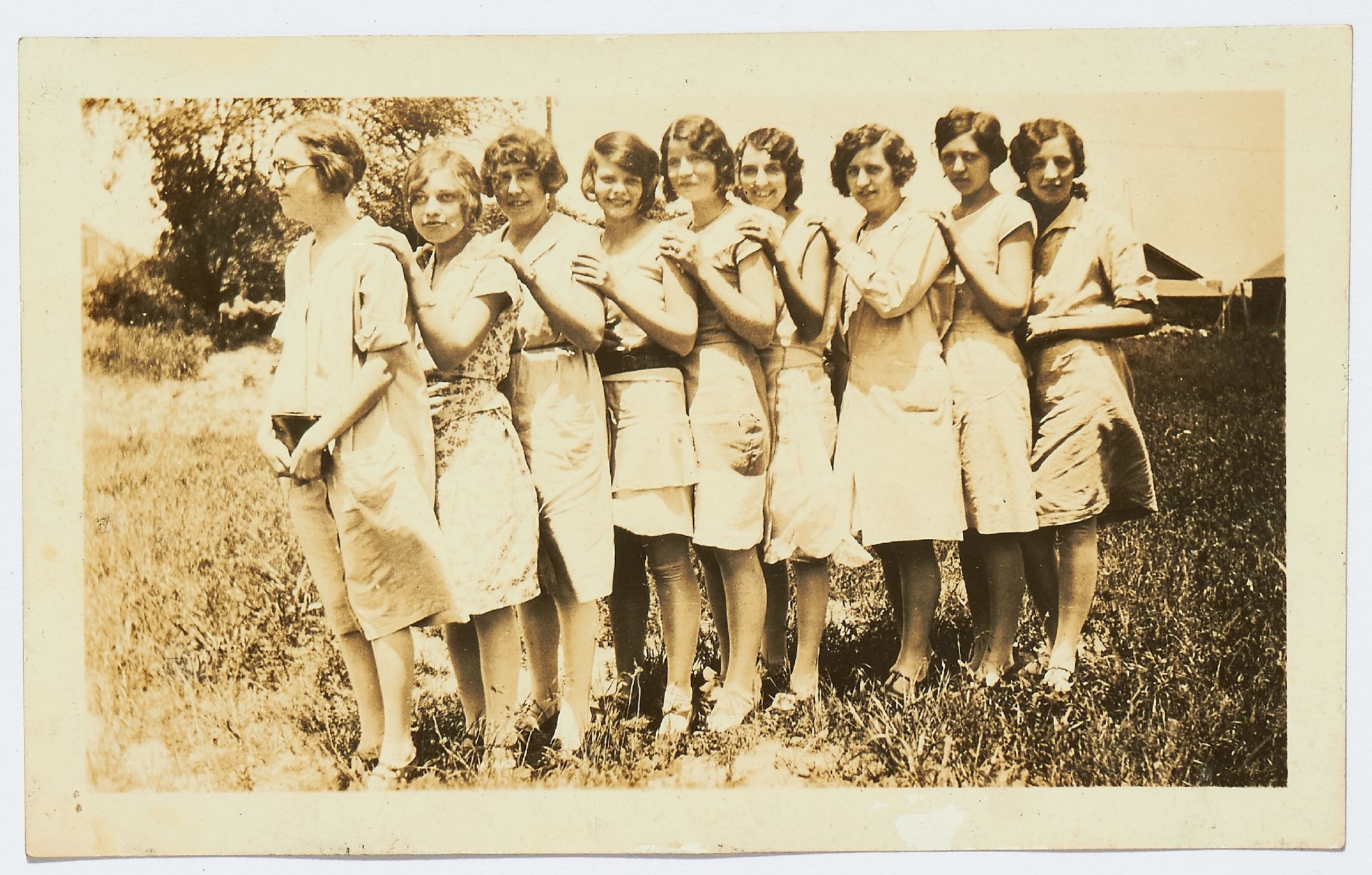 A photo album from a Kentucky family in the 1930s. The cover titled lists the compilers as Margaret and Walter and follows their friends and family while vacationing and going to events around 1932. Some of the photos are photo strip portraits of nicely dressed women and one of a couple posed together. A series of photos show people posed around a car drinking from a flask and an unlabeled bottle presumably at the end of prohibition. They vacationed on the Great Lakes and some photos show them posed on a beach and swimming. A group of women is seen in a few photos posed in the grass and in front of what appears to be a school. People are seen posed in a stadium including two men in football stances with their hands on the ground. Family is also seen posed on the steps of their home with all generations present. The final photograph shows a group photo of a baseball team.