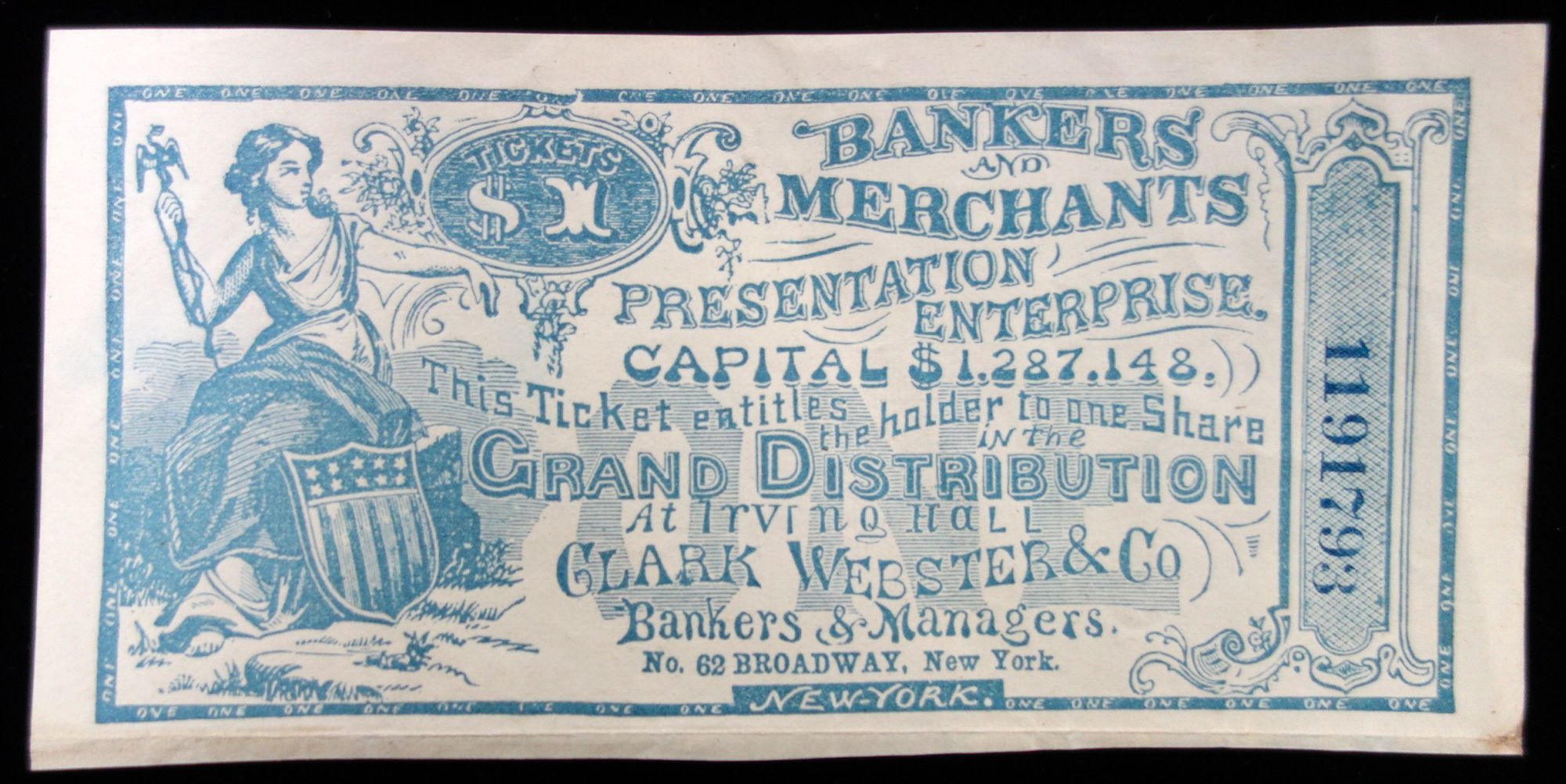New York City: Clark Webster & Co, 1867. A 2 3/4" x 5 1/4" thin paper ticket for a lottery to be held sometime it 1868. An elaborate swindle that took money from hopefuls for approximately 6 months. Each ticket was $1. It was promoted as a $1.2 M give away ... Some of the agents were arrested while Clark Webster was never found. Each ticket was numbered. This ticket is 1191793.