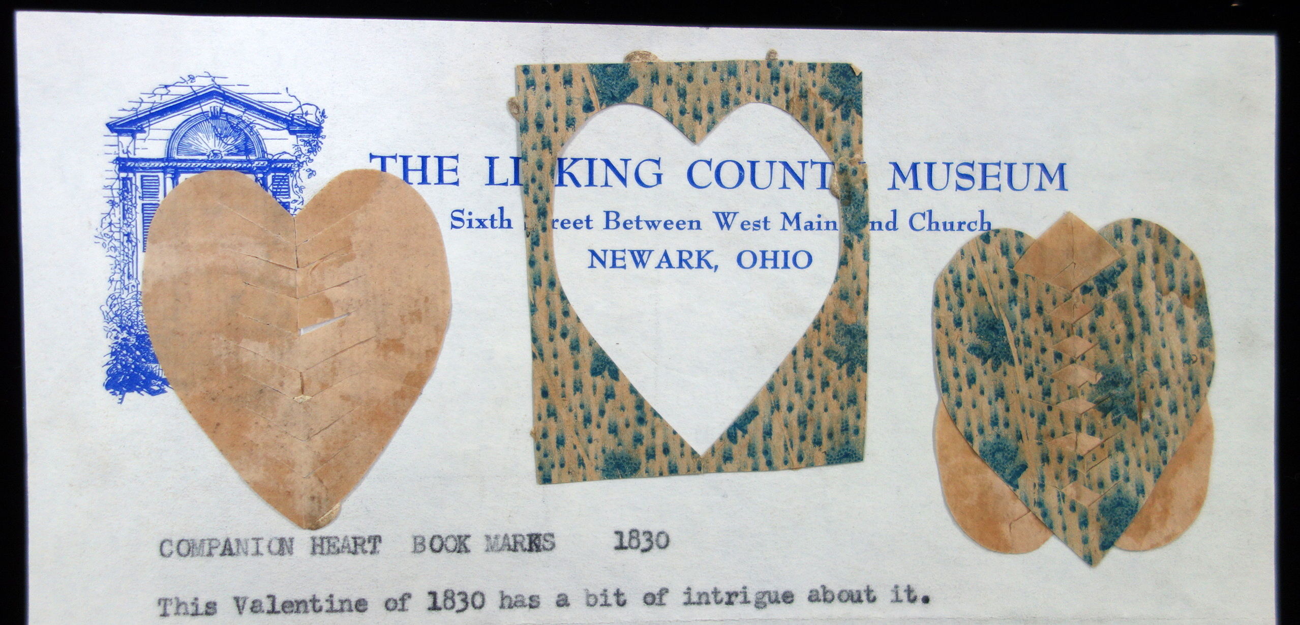 A typewritten message on The Licking County Museum, Newark Ohio. It is dated Valentine's Day 1963. Priscilla S. Scheffler, Great Great Granddaughter of Mary Shirley Shove and Dudley Whitney. Affixed to the top of the page are a pair woven hearts, the paper remnant from one of the hearts and finally a third heart cut for weaving. The text is an acocunt of Scheffler who found one of the hearts in the pages of a book owned by Mrs. Mary Shirley Shove-Whitney that she received as a gift from Catharine Brighman. Later when looking through a book previously owned by Brighman in 1828, she found the paper remnant of the blue and white heart and the third heart matching one of the hearts found in the 1830 book.