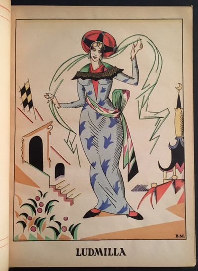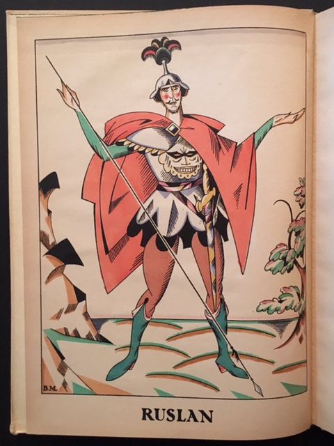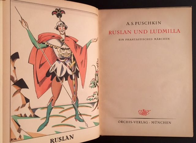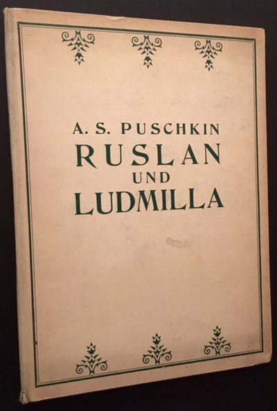 Munich: Orchis-Verlag, 1922. Cloth. Very Good +. Wassilij Masjutin. Very handsome 1922 German translation (by Johannes von Guenther) of Pushkin's 1820 epic poem "Ruslan and Ludmila". Wonderfully illustrated in rich color by Wassilij Masjutin. Tight and VG+ in its off-white printed boards, with light, forgivable soiling to the panels. Folio, 67 pgs., lovely decorative bordering to the verse.