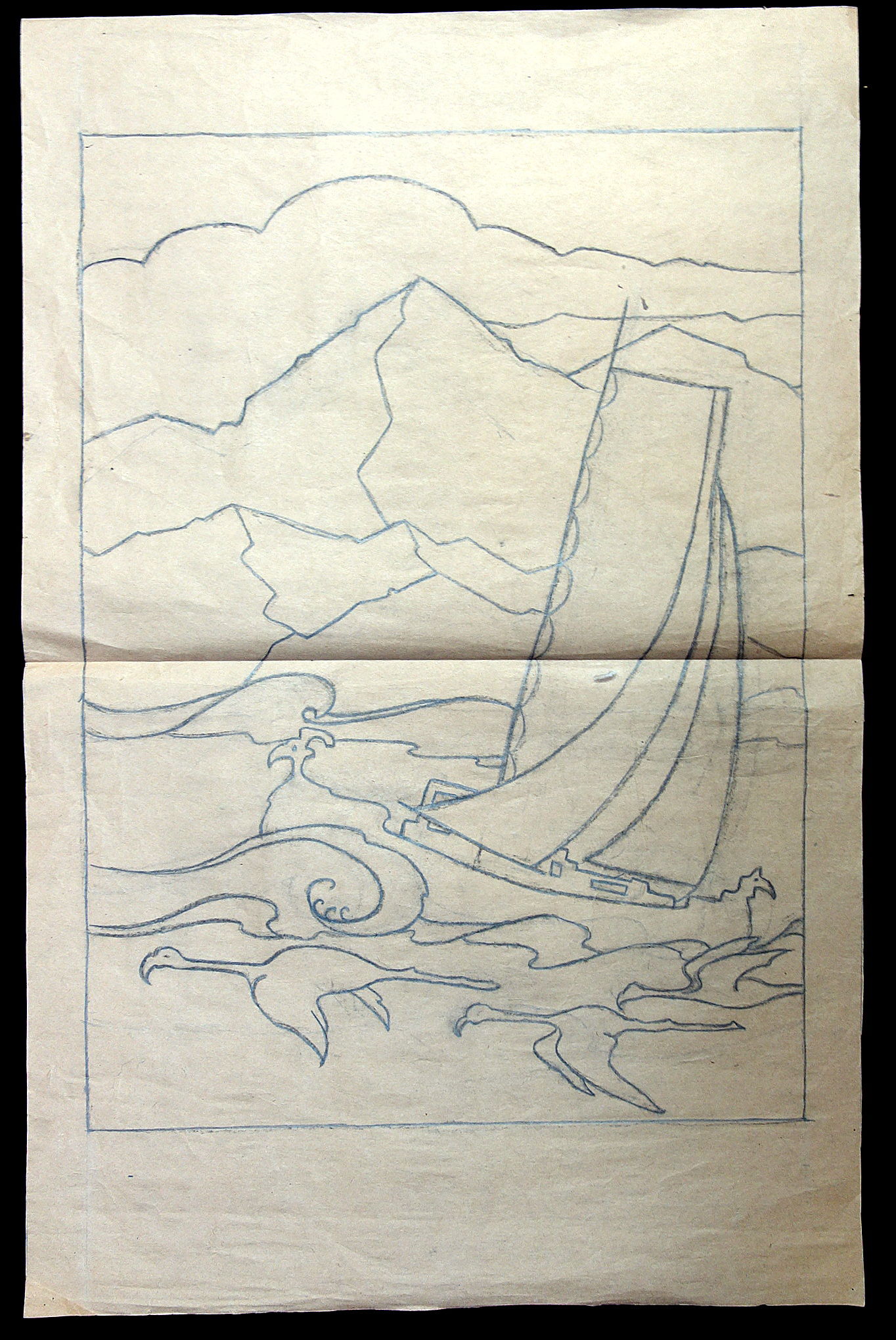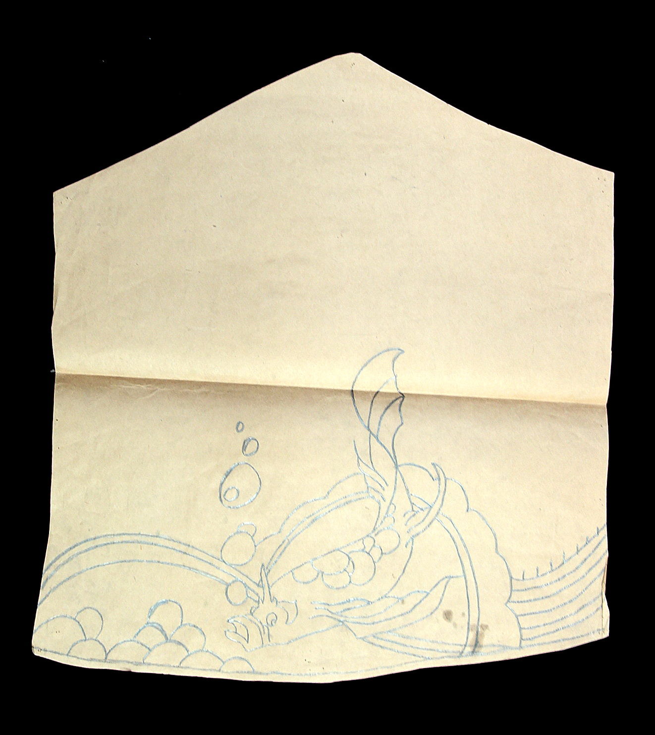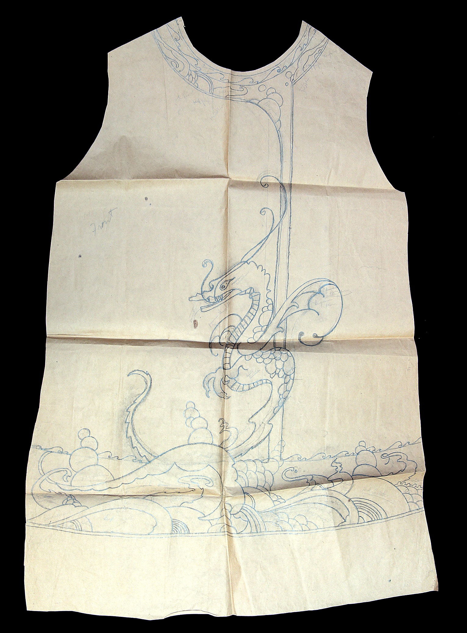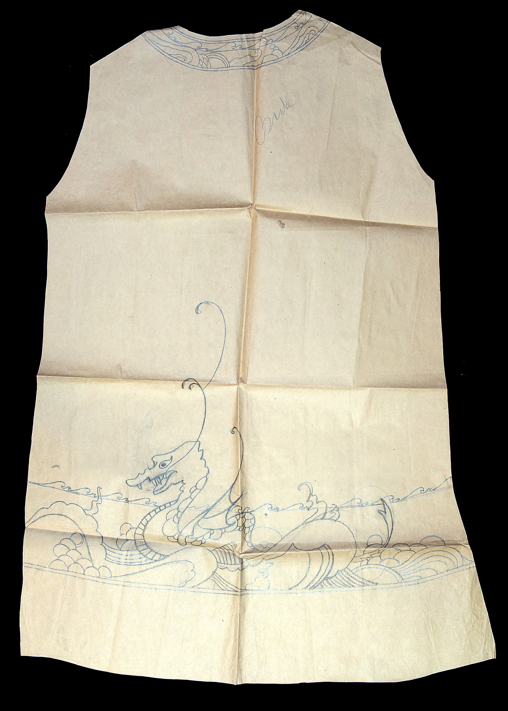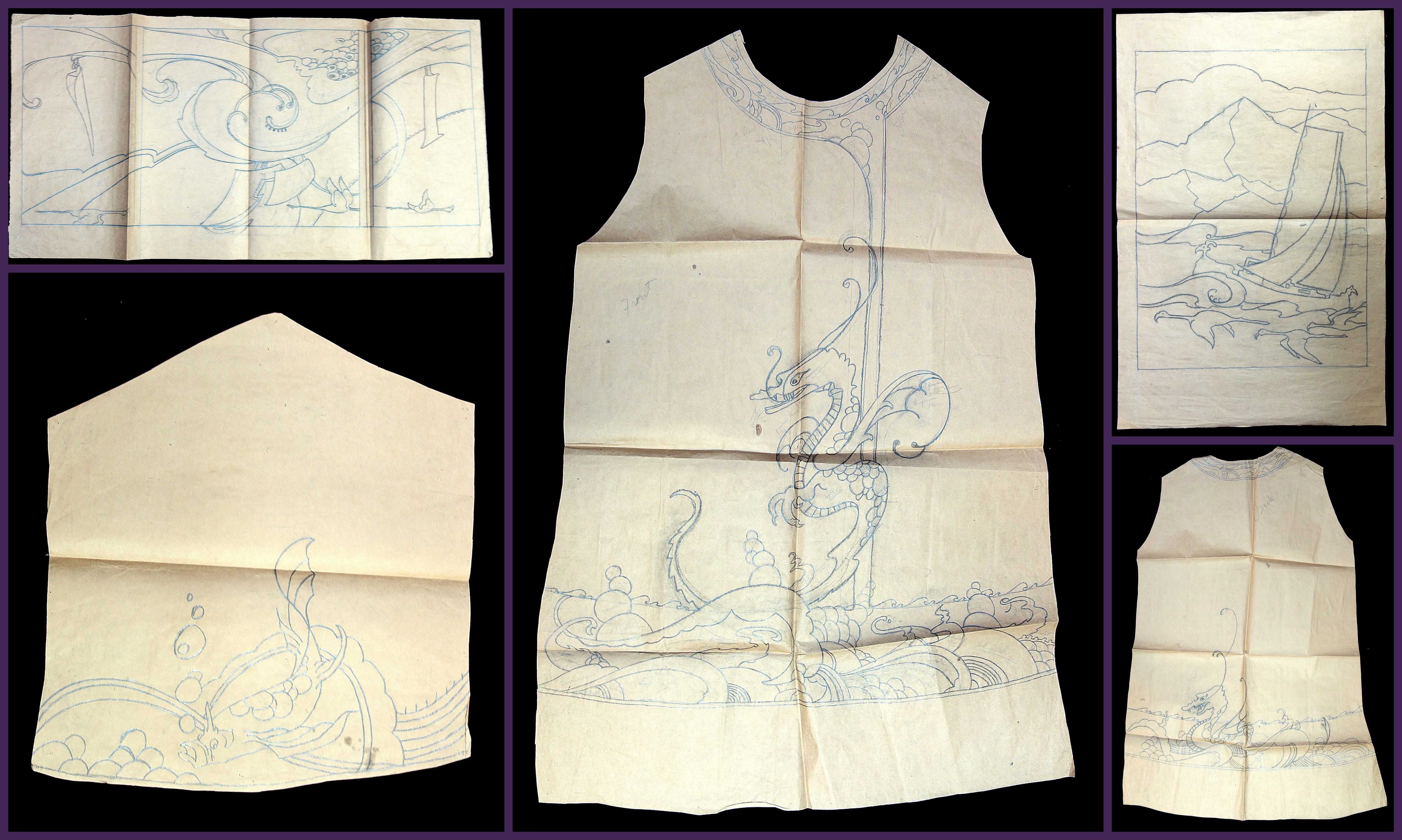 c1920s. What appears to be a complete handmade paper pattern for a kimono complete with hand penciled design for embroidery or appliqué that includes scenes of a violent sea, sea serpents, herons flying above a sailing vessel and more. Proposed colors have been penciled on the pattern. The back piece measures 48" x 32". Reverse is blank. Appears to be from the 1950s.