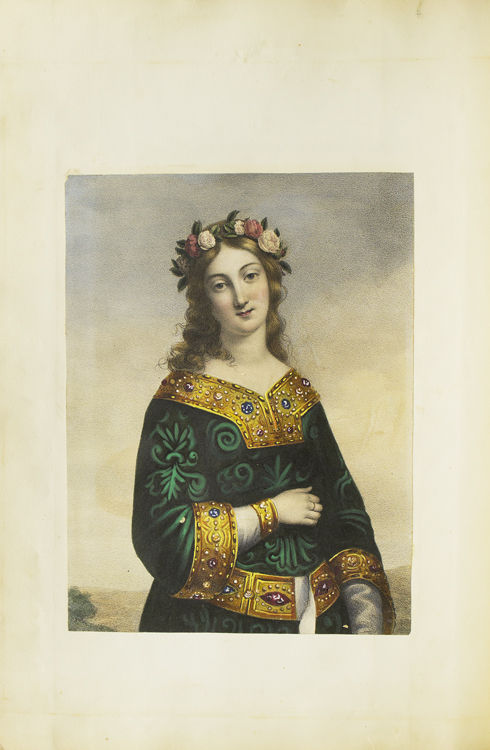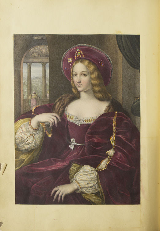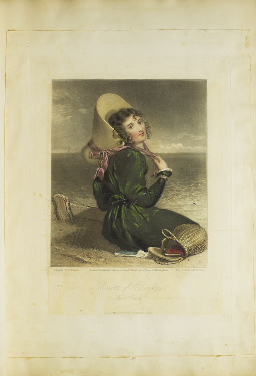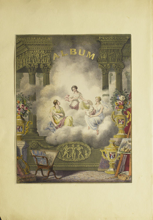 1830. Contains about 180 prints, dating from 1833 to 1835 by R. Ackermnann, Thomson, H. Ryall, Mercier, Zobel, etc; including 3 prints from the Beauties of Brighton. Pasted on to the recto, some full page and some 1/2 page, some smaller, including some relief prints. Bound in elaborate contempoary crimson morocco, with paper onlays, with wide crimson morocco dentelles stamped in gilt and blue moire silk doublures and endpapers. covers off, spine perished, page chipping, but prints good. Contains about 180 prints, dating from 1833 to 1835 by R. Ackermnann, Thomson, H. Ryall, Mercier, Zobel, etc; including 3 prints from the Beauties of Brighton. Pasted on to the recto, some full page and some 1/2 page, some smaller, including some relief prints. With a inlaid title-page "Album" heightened in gold