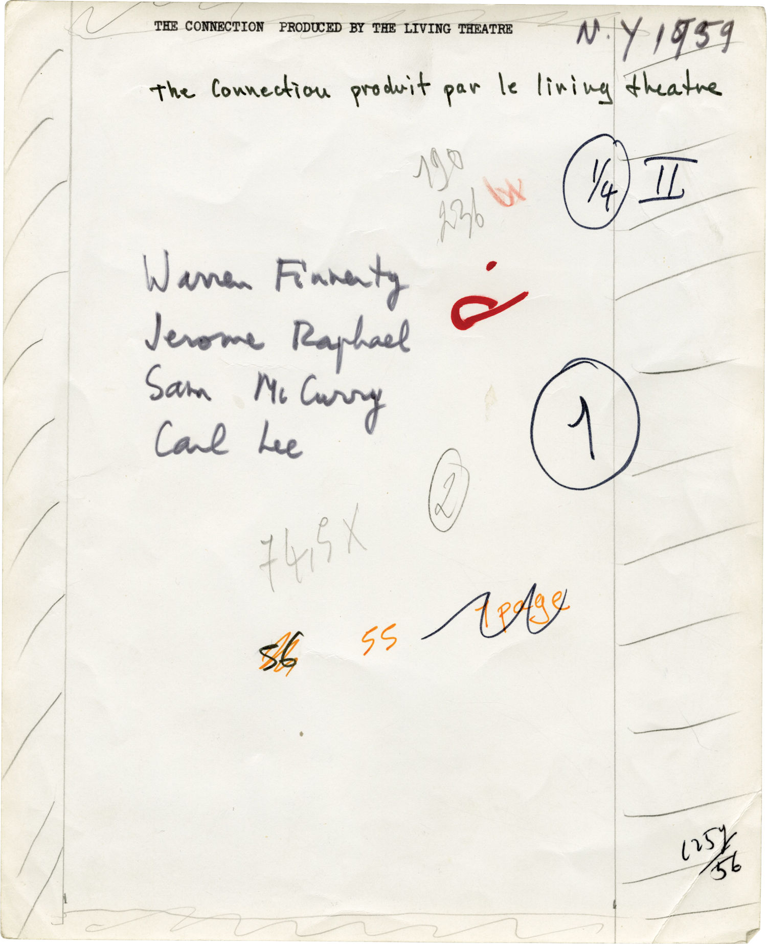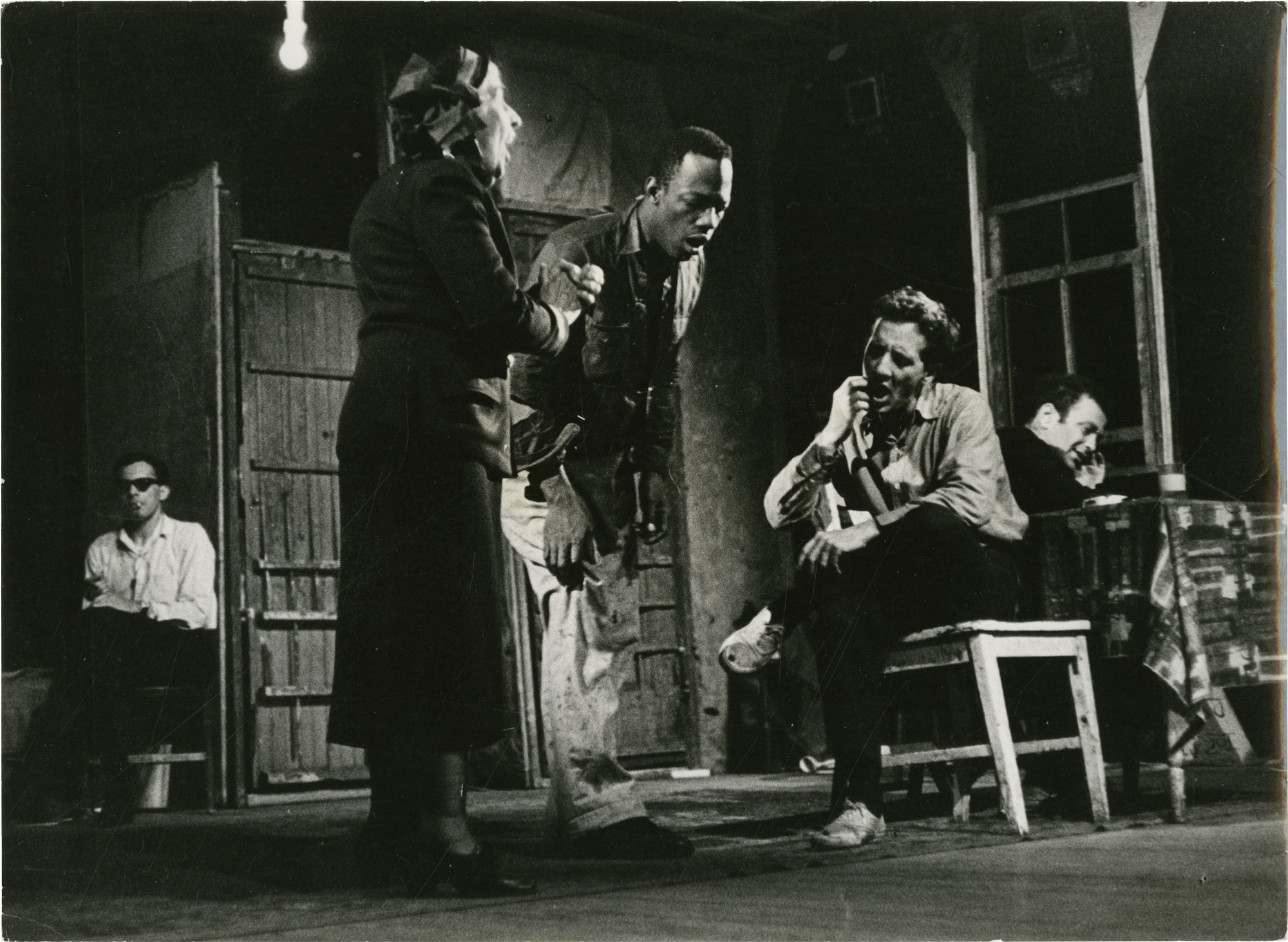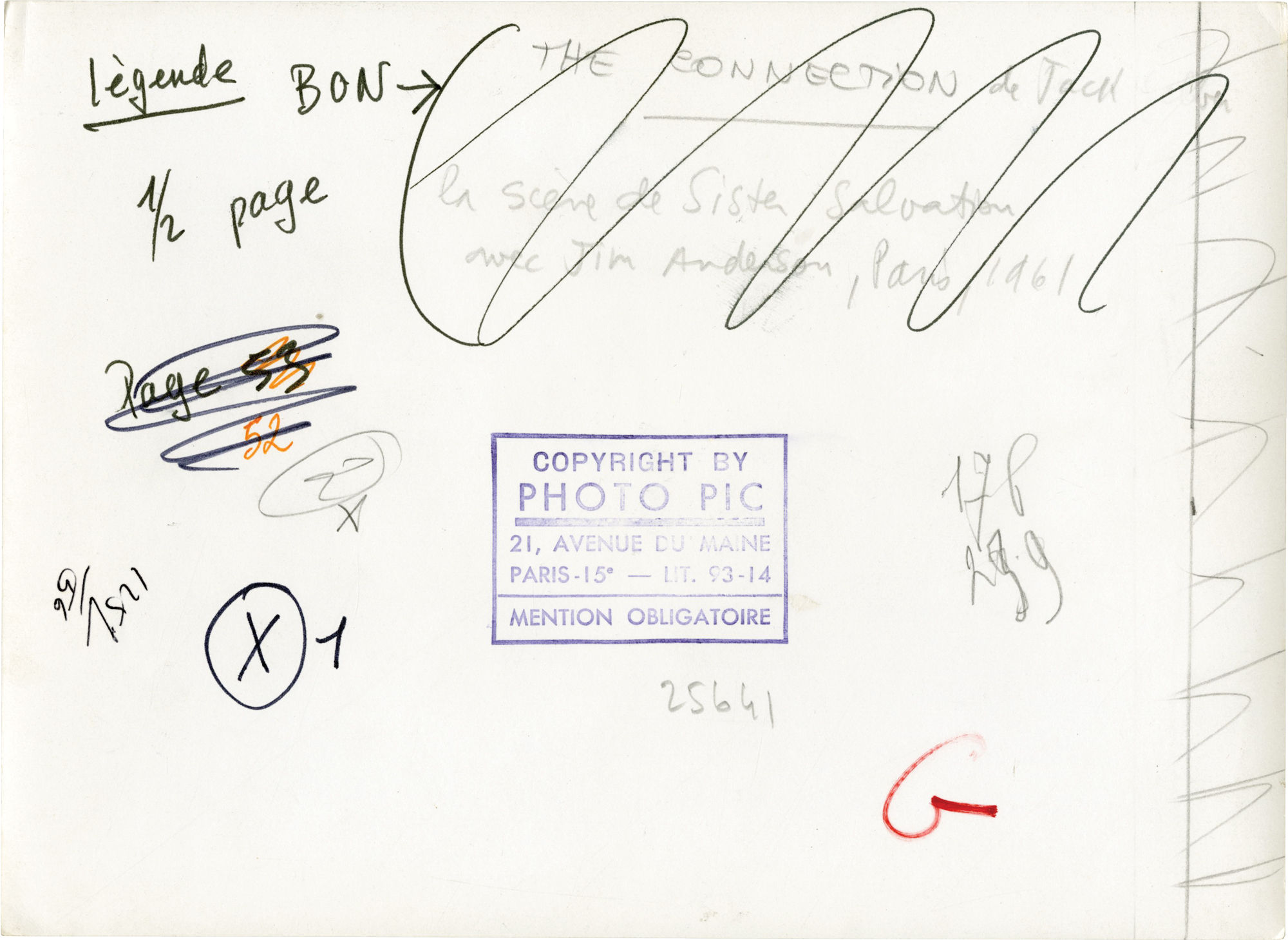 N.p.: N.p., 1959. Three vintage photographs from performances of The Living Theatre's 1959 play. One photograph from the original 1959 production, with a printed caption in English on the verso. The other two photographs from a 1961 production in Paris, with the stamp of photographer Roger Pic on the versos. All three photographs with manuscript annotations in French on the verso regarding layout and identifying the subjects of the photographs.